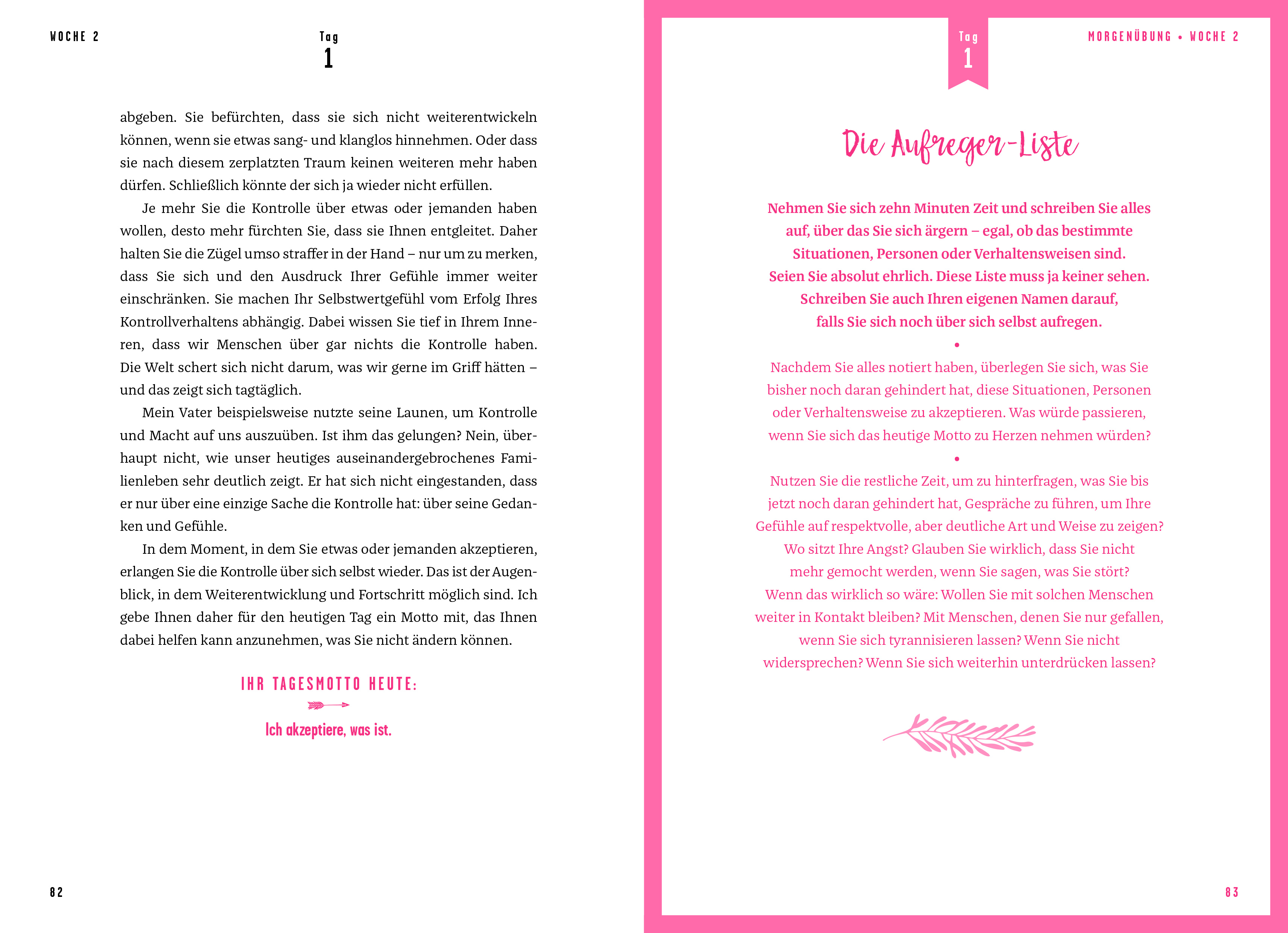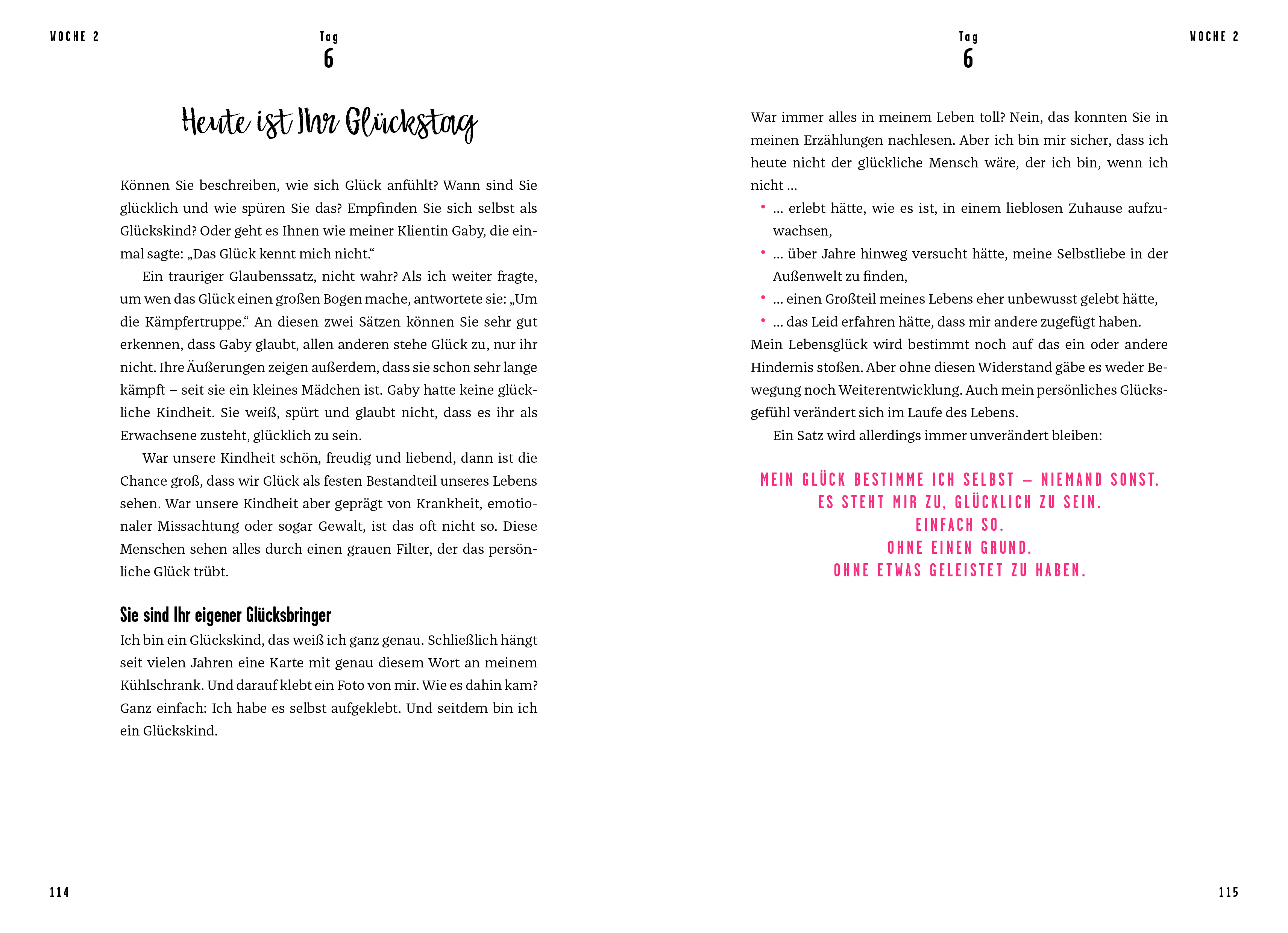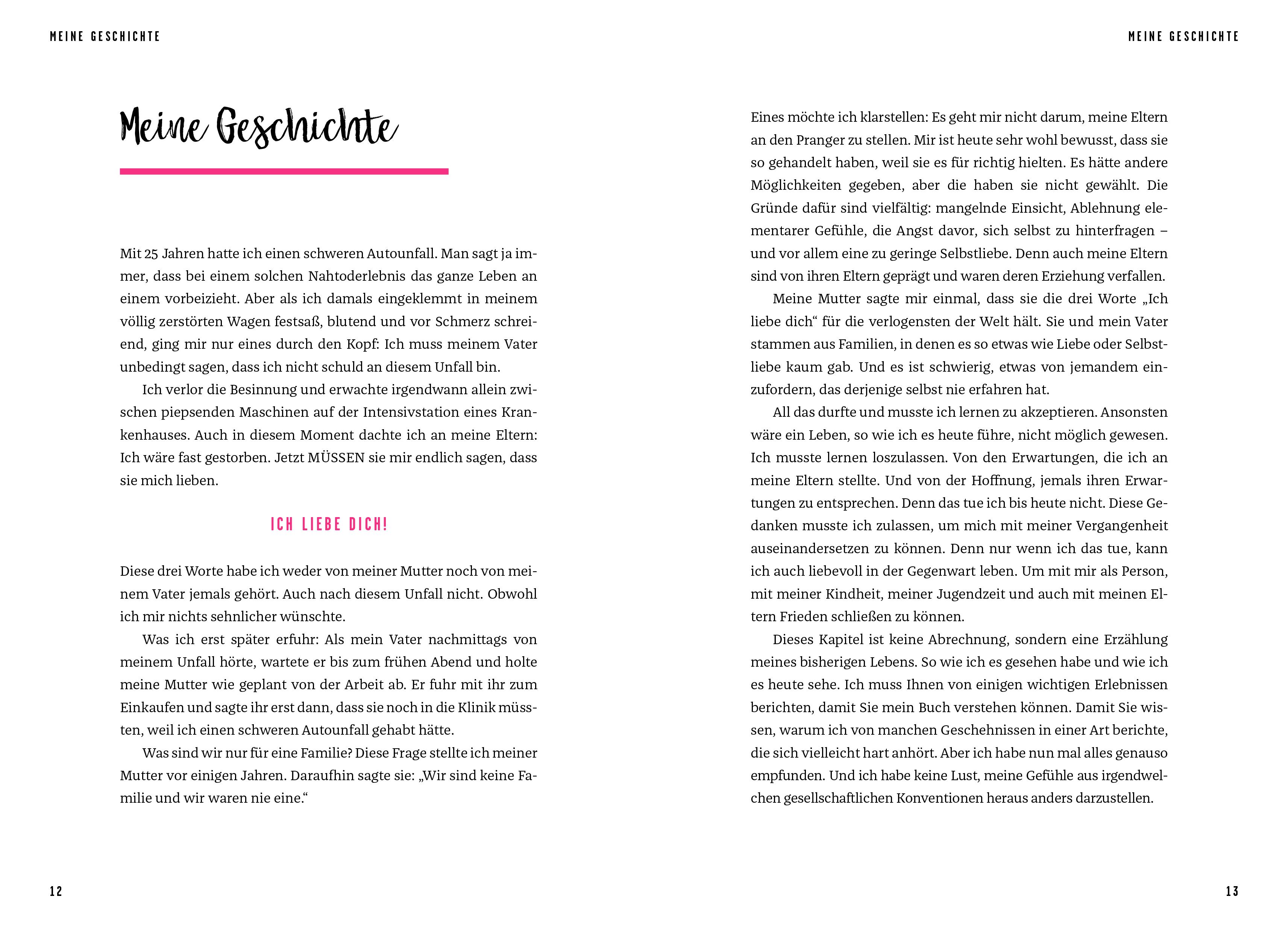 Selbstliebe kann man lernen wie Fahrradfahren, davon ist Autorin, Meditationstrainerin, Hypnosetherapeutin und Heilpraktikerin für Psychotherapie Kim Fleckenstein überzeugt. Denn sie weiß: Wir lieben unsere Freunde, Bekannten, Partner, investieren Zeit, verteilen Komplimente – und bleiben dabei oft selbst auf der Strecke. Uns selbst mögen wir nicht besonders, sind deutlich kritischer als bei anderen und setzen viel höhere Maßstäbe an. Hier spricht Autorin Kim Fleckenstein aus eigener Erfahrung, denn sie konnte sich selber Jahrzehnte lang nicht leiden und holte sich Liebe daher nur von außen. Die Münchnerin tat alles, um anderen zu gefallen: Sie driftete in eine fünfjährige Bulimie ab, um Anerkennung für ihren zierlichen Körper zu erhalten. Heute kann sie sagen: Ich liebe mich! Ich bin glücklich! Auch wenn mein Leben und ich nicht perfekt sind. In diesem Buch gibt sie die Anleitung für ihre Selbstliebe-Formel. Das 4-Wochen-Programm von Kim Fleckenstein fordert nur zehn Minuten täglich und hilft, Schritt für Schritt Selbstzweifel und den inneren Kritiker loszuwerden. Einfache Tricks und Übungen trainieren Selbstwahrnehmung, helfen, sich selbst in neuem Licht zu sehen und das eigene Selbst voll und ganz anzunehmen. An Stelle alter, festgefahrener Glaubenssätze über uns treten neue Denk- und Handlungsmuster, die Dankbarkeit, Ausgeglichenheit, Zufriedenheit und Selbstbewusstsein hervorbringen. Treten Sie aus Ihrem eigenen Schatten und werden sie durch Selbstliebe die beste Version von sich.