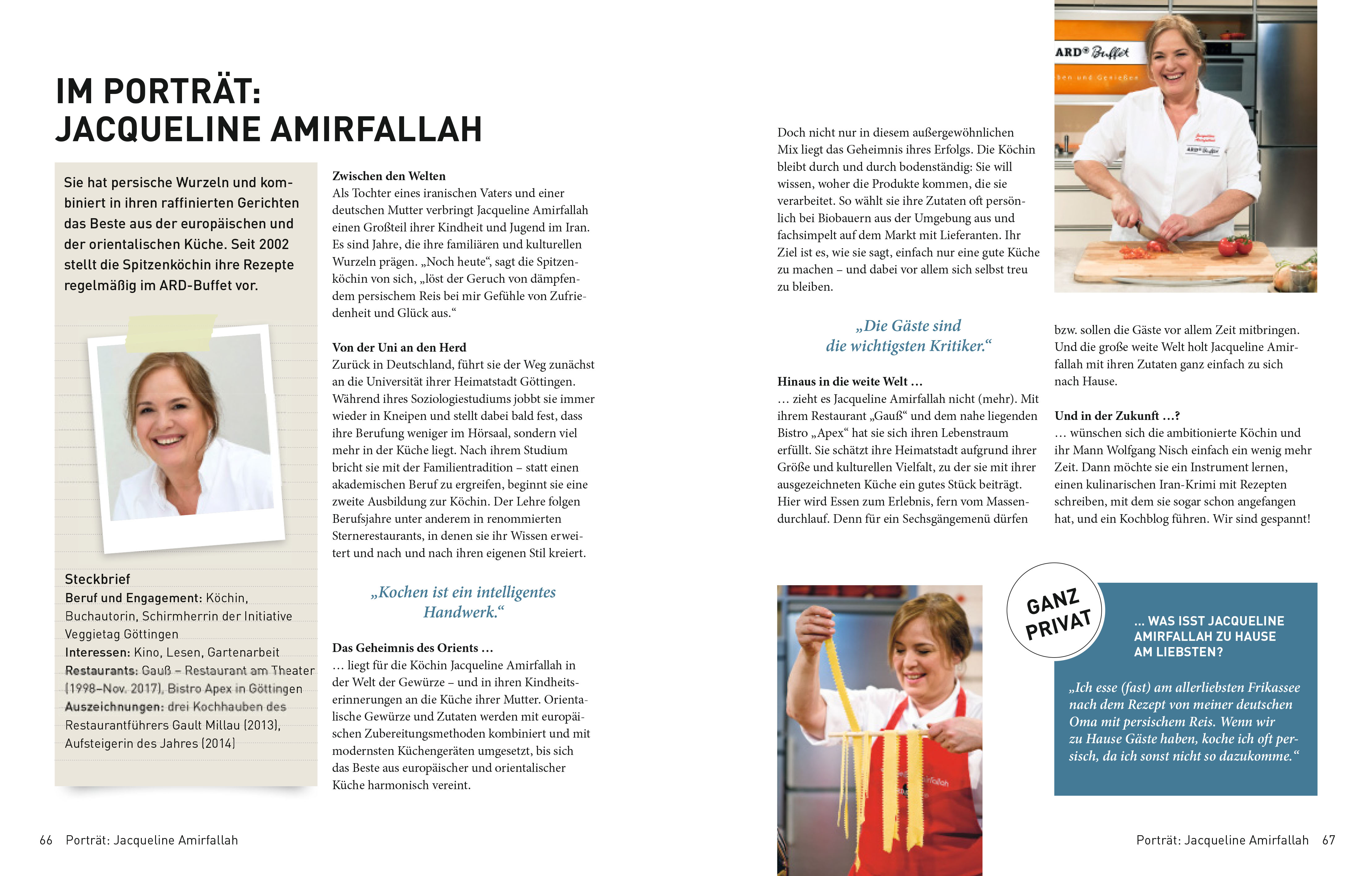 Kommen Sie mit auf eine Weltreise mit dem neuen Kochbuch aus dem ARD-Buffet! Diesmal geht die kulinarische Reise quer durch die ganze Welt, von Italien in den Orient, auf Rundreise durch Asien und bis nach Südamerika. Seien Sie gespannt auf Tortellini mit Kräuter-Ricotta-Füllung oder Hähnchenbrust mit Harissasauce und Pilaw. ARD-Buffet-Spitzenköchin Jacqueline Amirfallah und weitere Koryphäen am Herd präsentieren ihre Lieblingsrezepte aus fernen Ländern. So kann sich jeder die mediterranen, orientalischen und asiatischen Köstlichkeiten in die heimische Küche holen.