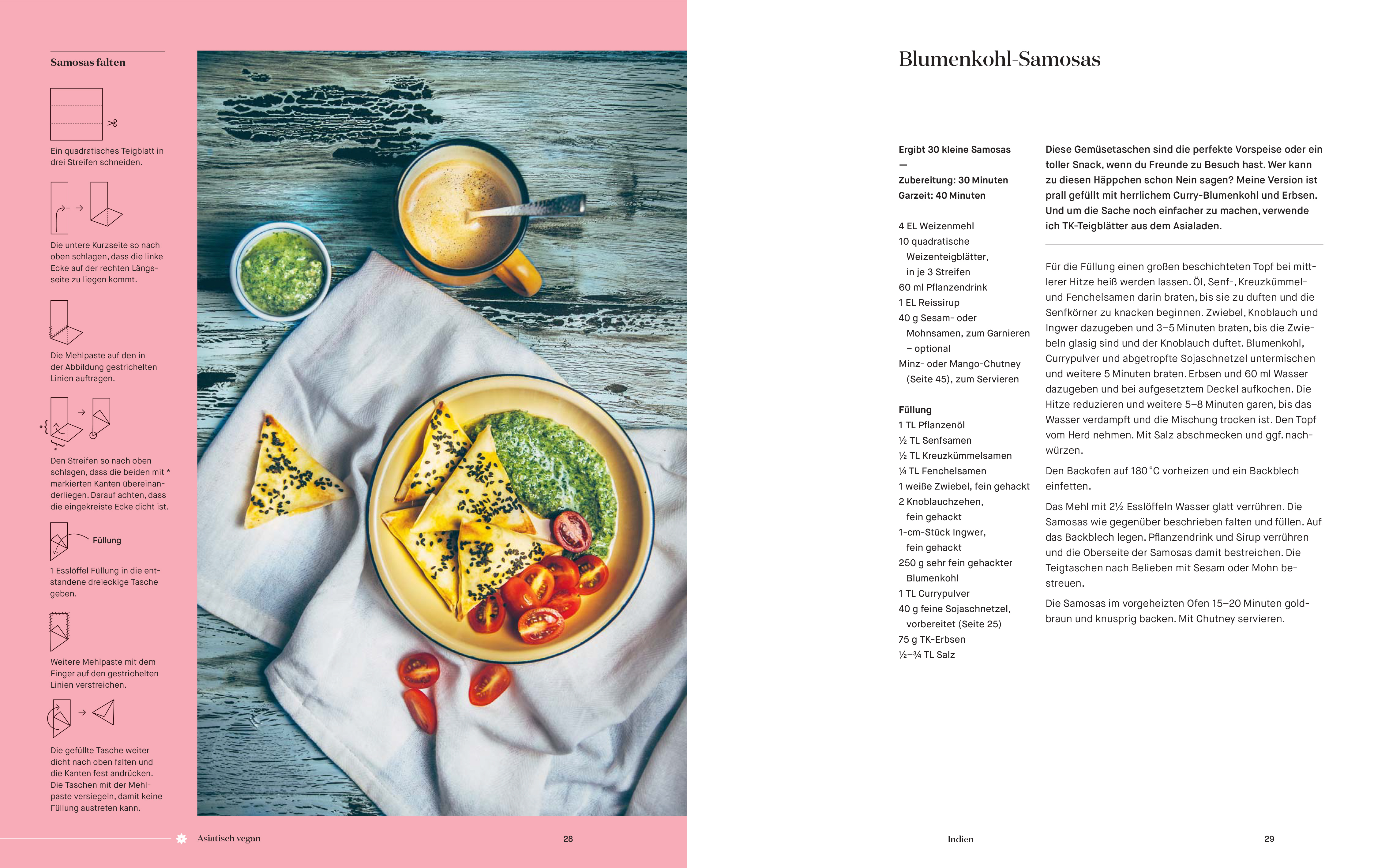 Sasha lässt sich stets von den Geschmäckern Asiens inspirieren. Dabei entstehen so geschmackvolle Gerichte wie Jackfruit-Biryani, Blumenkohl-Samosas, Fluffige Erdnuss-Pfannkuchen, Cremiges Spinat-Curry mit knusprigem Tofu, Shiitake-Ramen, Veganes ‚Butter Chicken‘, Süßkartoffel-Zwiebel-Pakoras, Tofu-Pad Thai und Peking-Jackfruit-Pfannkuchen.