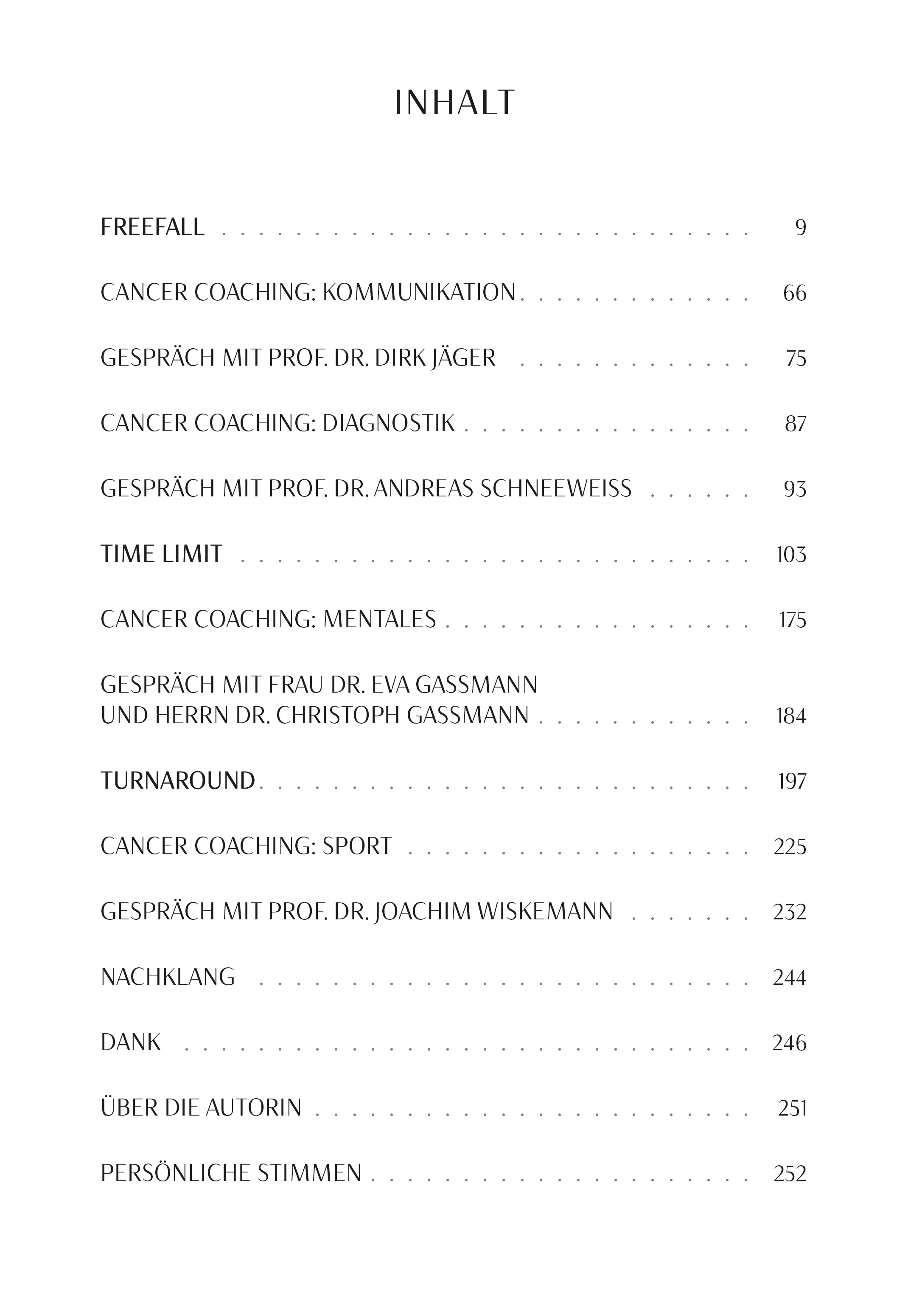 In ihrem Buch „Cancer Coaching” beschreibt sie nicht nur ihren erfolgreichen Kampf gegen die Krankheit, sondern teilt auch, was ihr geholfen hat, und unterstützt Betroffene in einer Zeit der Überforderung und Fremdbestimmung durch eine tödliche Krankheit, zu selbstbestimmten und stabilen Patienten zu werden.