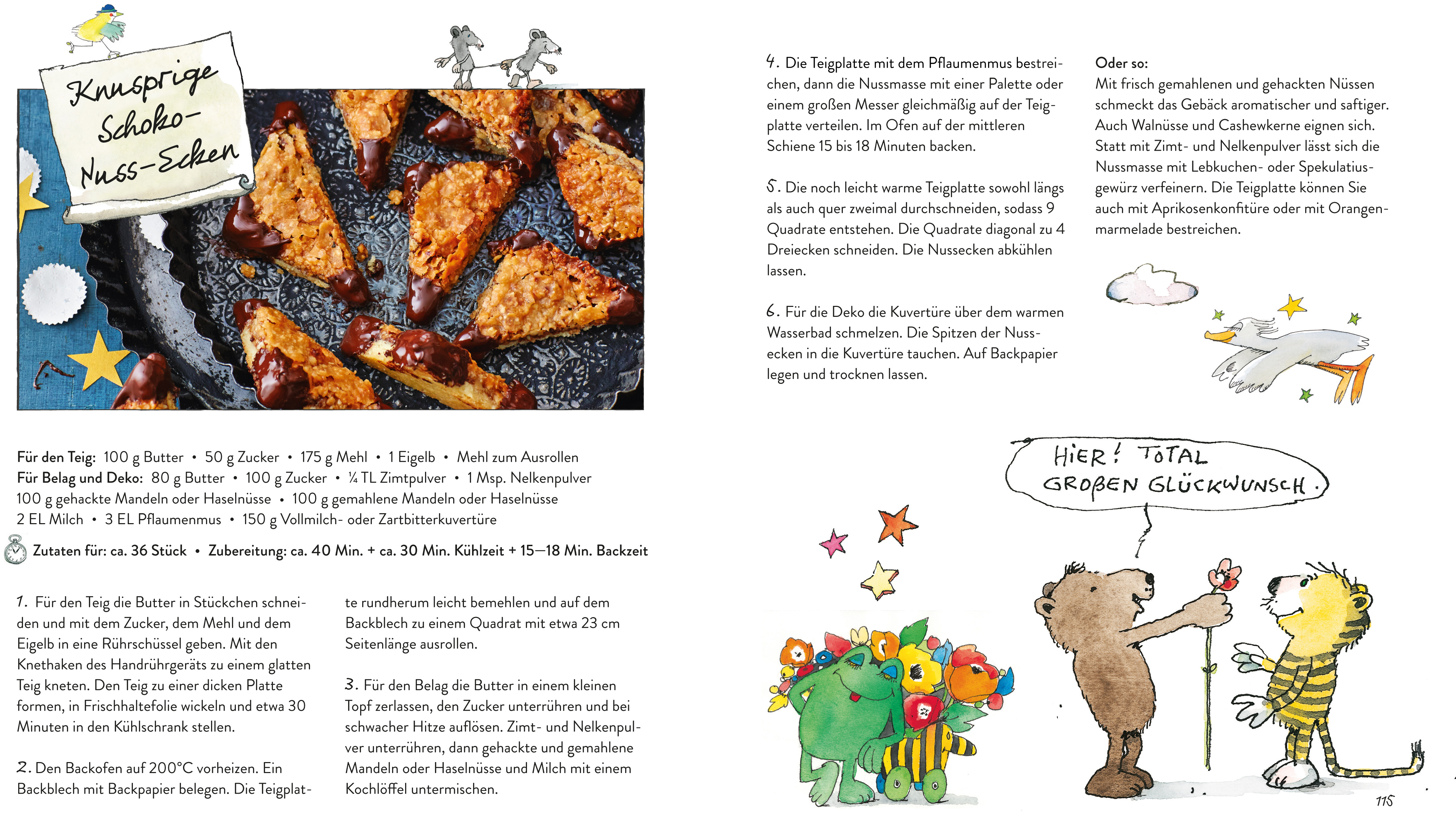 Vor 40 Jahren hatte die Tigerente ihren ersten Auftritt in Janoschs Buch „Oh, wie schön ist Panama“. Jetzt schwingt die beliebte Kinderfigur erstmals gemeinsam mit ihren Freunden gekonnt den Kochlöffel. Ganz nach dem Motto: „Oh, wie lecker ist Panama“… Das Tigerenten-Kinderkochbuch ist ein liebevoll gestaltetes Kinderkochbuch mit rund 40 Koch- und Backrezepten. Dazu liefern Tigerente, grüner Frosch und Co.witzige Ideen für ein gesundes Powerfrühstück, für die Party mit den besten Freunden und einen leckeren Abenteurerschmaus. Die wichtigsten Infos rund um Küchenregeln und ein Koch-ABC dürfen natürlich auch nicht fehlen. Der Kleine Bär (ruhig, väterlich, angelt und kocht gerne) steht für Gerichte wie Fish & Chips, Blaubärmuffins oder das Powerfrühstück für kleine Angler, der Kleine Tiger (quirlig, sammelt gerne Pilze) verrät, wie man Semmelknödel mit Pilzrahmsauce oder Spaghetti mit Tigerpilzen kocht. Die Tigerente backt einen Streifenkuchen und ein Pull-Apart-Bread mit Tigerentenstreifen. Ebenfalls mit von der Partie ist Günter Kastenfrosch, der ständige Begleiter der kleinen Tigerente, der sich im Kochbuch in Form einer Froschsuppe mit Tigerenten-Knabberstangen (Erbsensuppe mit Blätterteigstangen), grünem Wackelpudding und Qua(r)k-Küchlein verewigt. Und der ultimative Panama-Bananen-Kuchen ist selbstverständlich auch mit dabei.