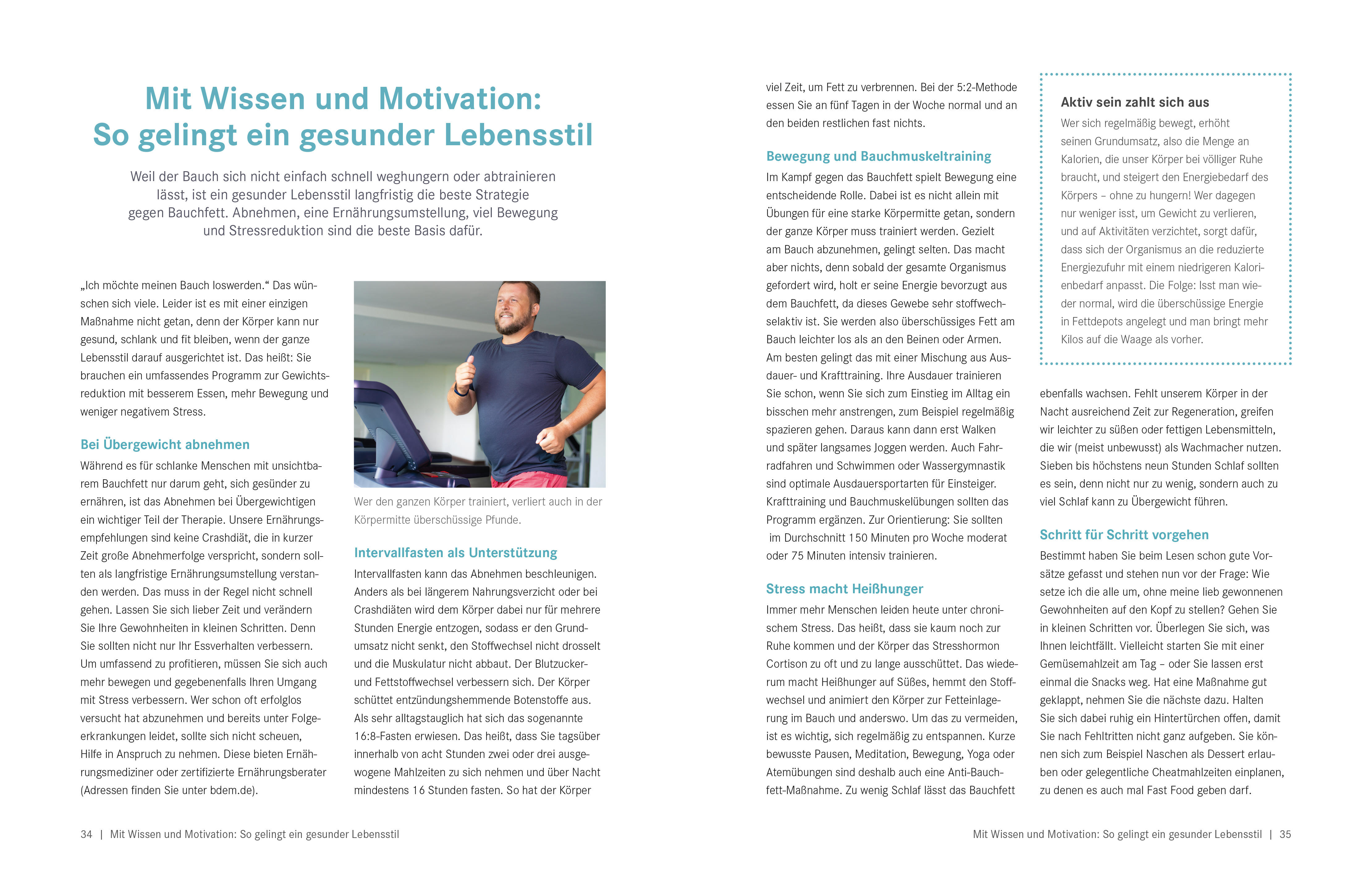 Ein Bäuchlein mag noch nett sein, Fett am Bauch dagegen nicht. Mittlerweile ist erwiesen, dass dieses sogenannte viszerale Fett nicht nur unschön, sondern aus medizinischer Sicht auch hochgefährlich ist: Hier werden Hormone und Botenstoffe produziert, die dafür sorgen, dass man noch schneller zunimmt. Außerdem befeuert das Fett in der Körpermitte Entzündungen, die zur Entstehung von chronischen Krankheiten wie Diabetes, Bluthochdruck oder Herz-Kreislauf-Beschwerden führen. Die Lösung kann daher nur lauten: Weg mit dem Bauchfett!