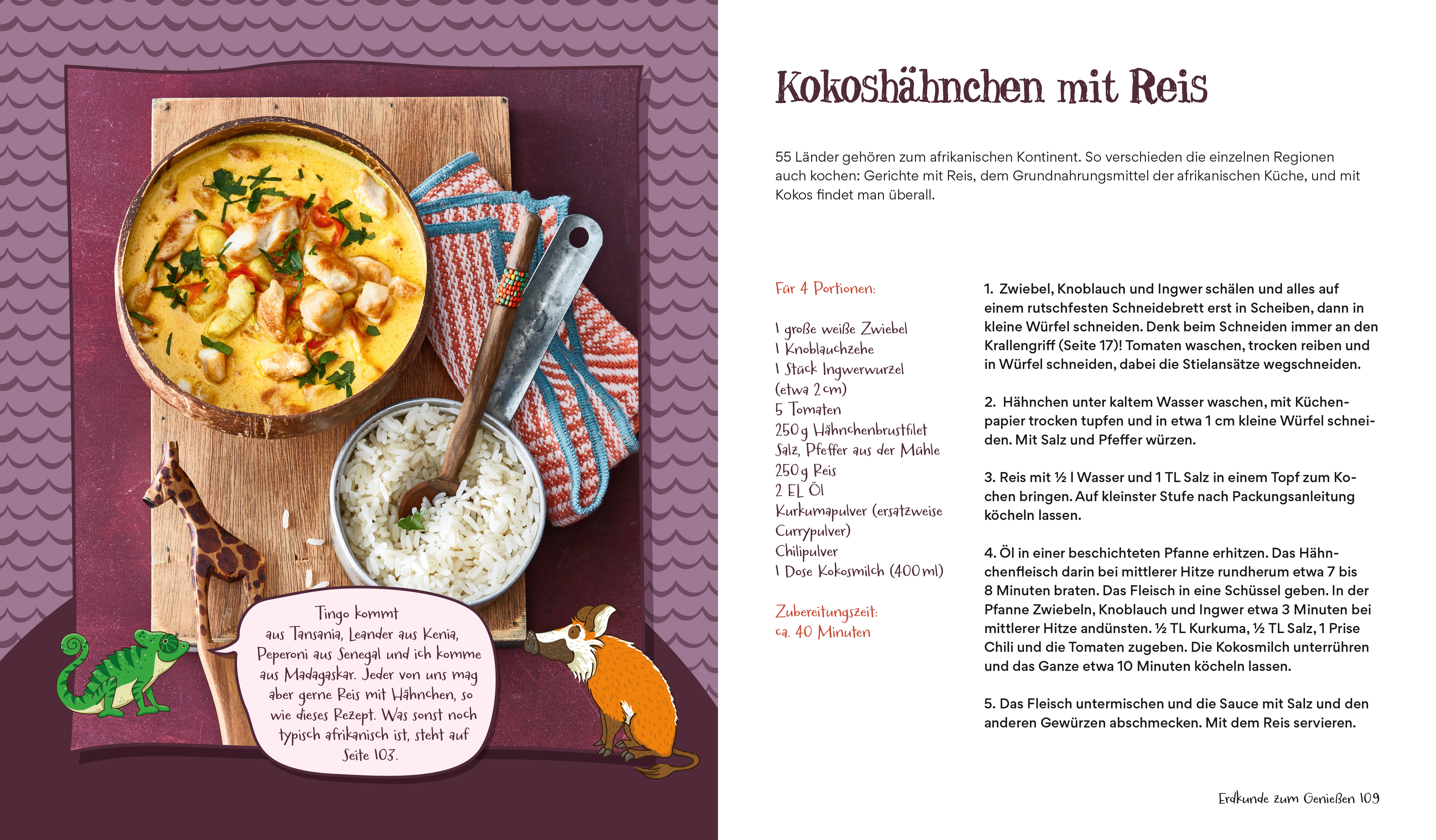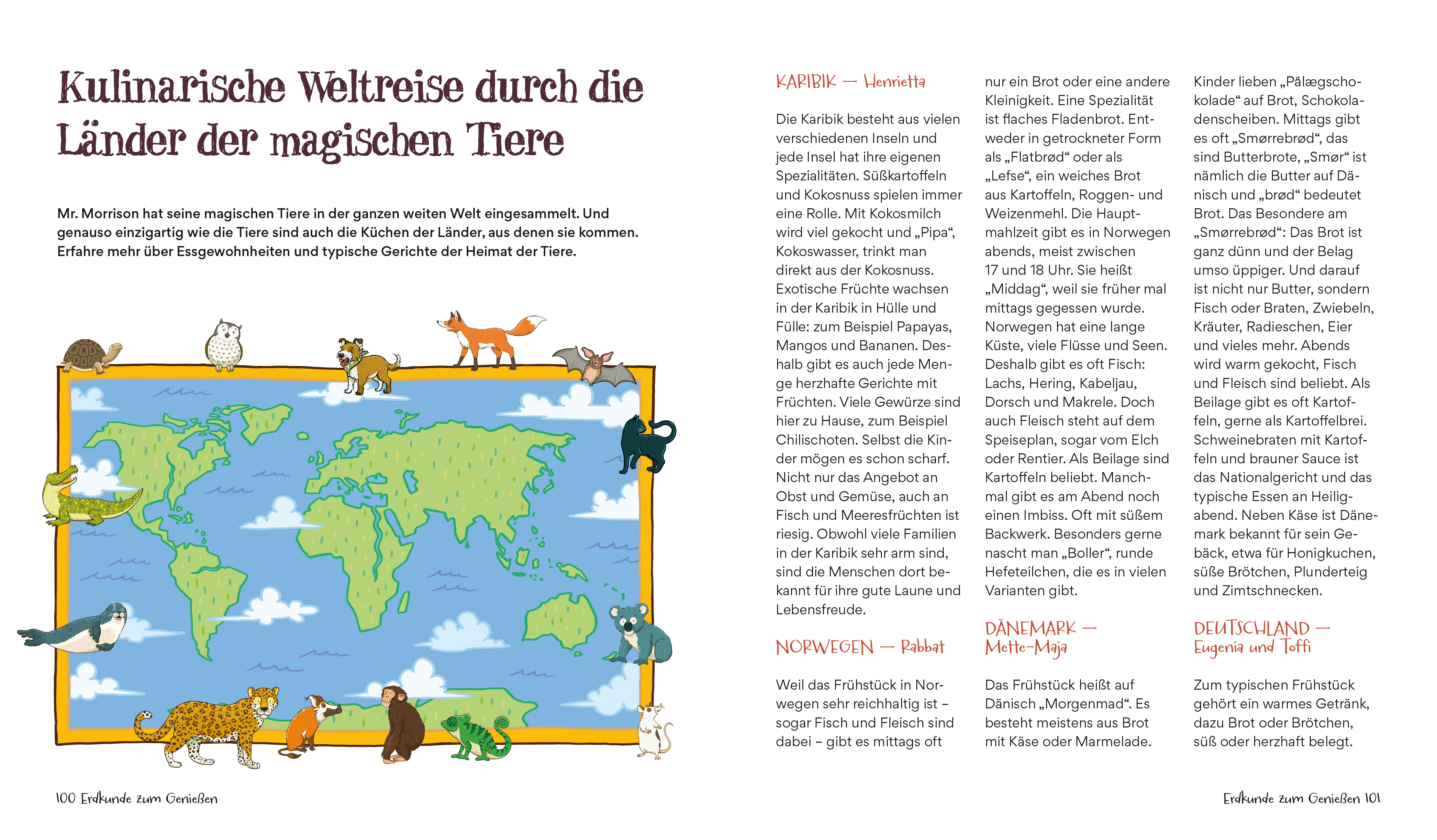 Kochen ist etwas Magisches! Besonders, wenn uns die Figuren aus der erfolgreichen Buch-Reihe „Die Schule der magischen Tiere“ dabei unterstützen. Die magischen Tiere gehen nicht nur im Alltag mit uns durch dick und dünn, sondern wissen auch viele Tipps und Tricks rund um das Thema Kochen. Mit ein paar klugen Kniffen wissen sie, wie wir tolle Leckereien in der Küche zaubern können – auch ohne die Hilfe der Eltern. Denn zu allen Rezepten gibt’s geheime Infos von den Tieren, entsprechend ihrer Fähigkeiten. So ist zum Beispiel die Schildkröte Henrietta für Life-Hacks zuständig – denn schließlich hat sie mit 200 Jahren allmählich alle Tricks drauf. Und nicht nur das: Im Kochbuch finden sich alle Lieblingsrezepte bzw. Lieblingslebensmittel der Kinder und Tiere wieder, zum Beispiel Henris Schlemmerschnitzel, Mette-Majas Zimtschnecken oder Ricks Fischstäbchen. Die Gerichte im Buch sind bunt und abwechslungsreich, vielfältig im Geschmack und oft in lustiger Optik. Und das Beste: Alle sind kinderleicht nachzumachen.