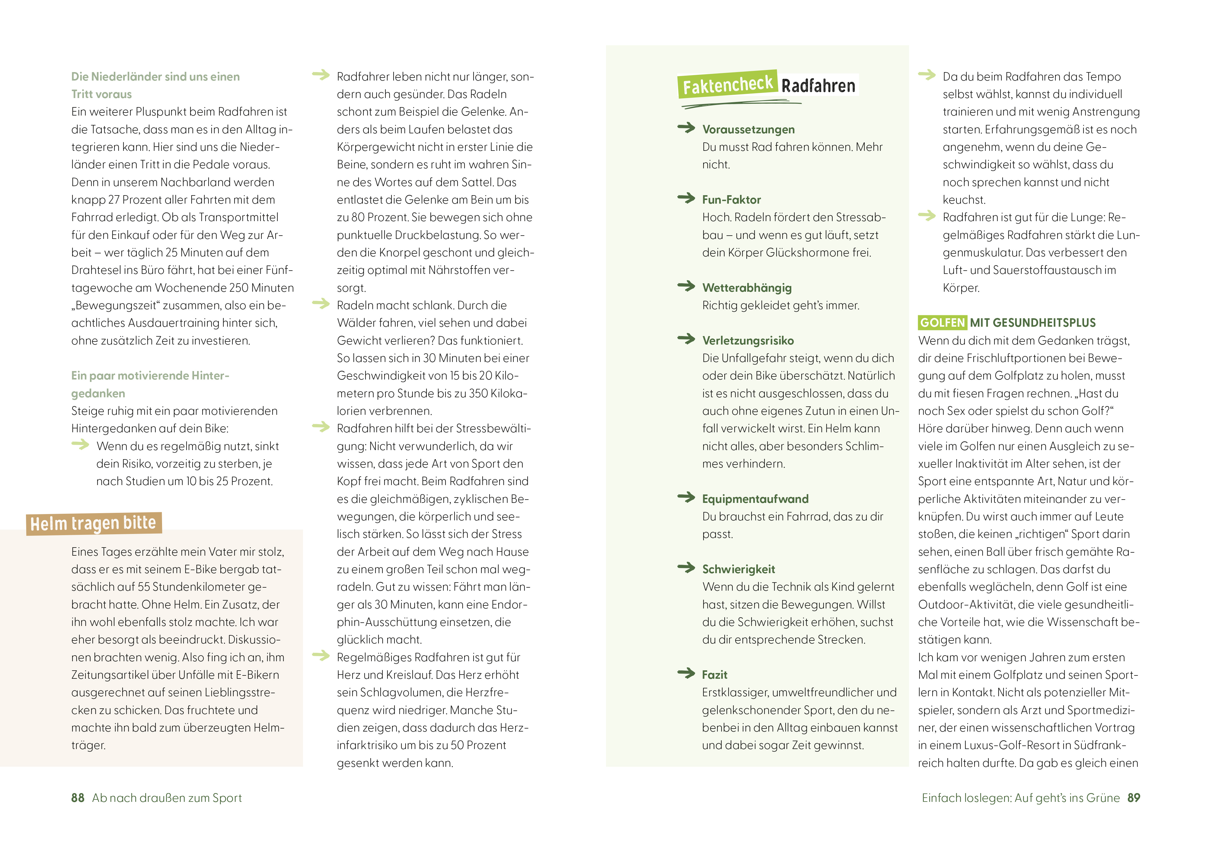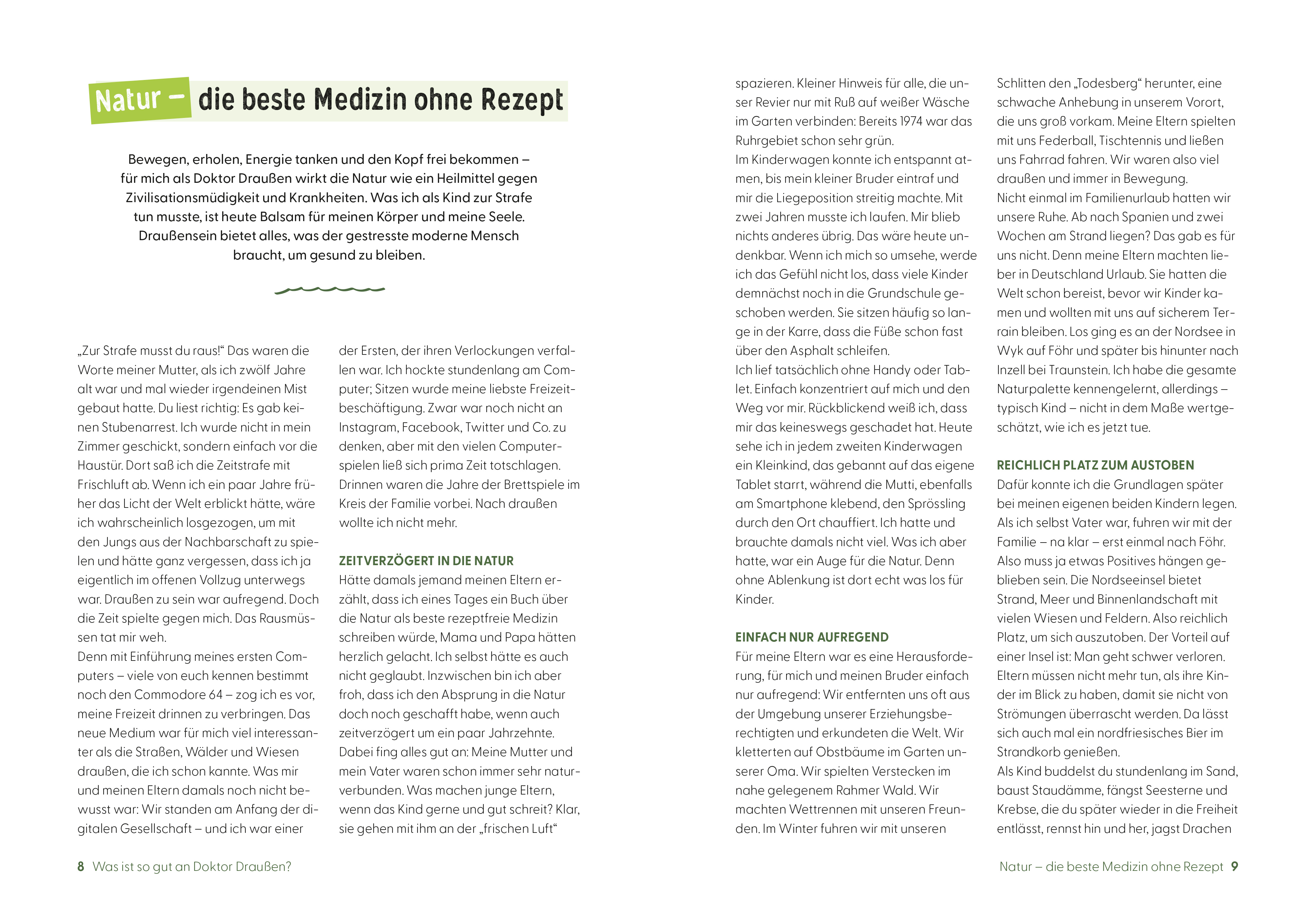 Denn was Green-Exercise-Fans intuitiv schon lange wussten, bestätigt nun auch die Wissenschaft: Die Natur ist eine außergewöhnliche Kraftquelle – mit einer ganzen Reihe an höchst erwünschten Nebenwirkungen! Ob Arthrose, Asthma, Allergien, Diabetes, Bluthochdruck, Depressionen, Herz-Kreislauf-Erkrankungen, Rückenschmerzen oder Übergewicht: „Doktor Draußen“ hilft und heilt – und tut nachweislich gut!