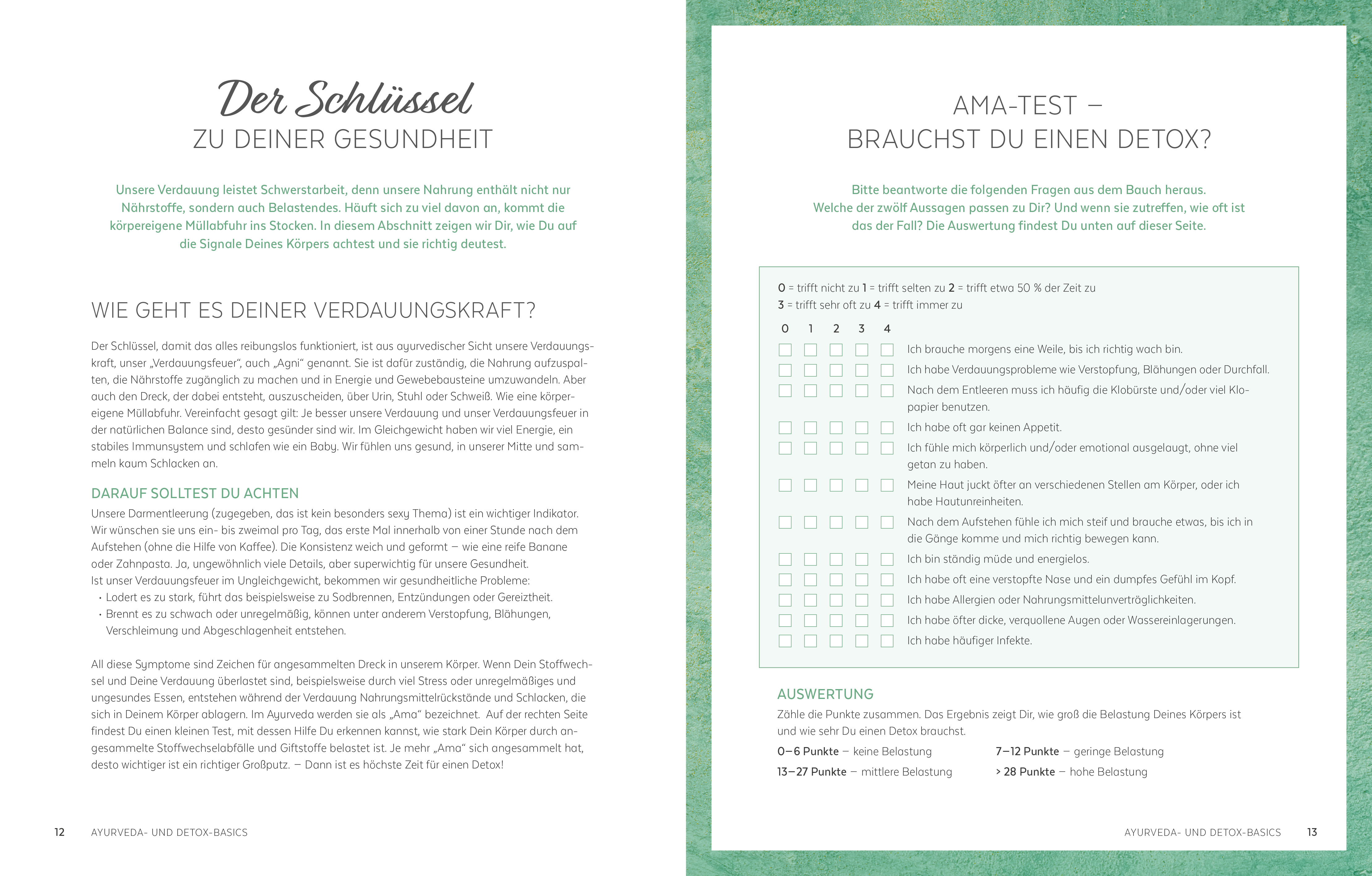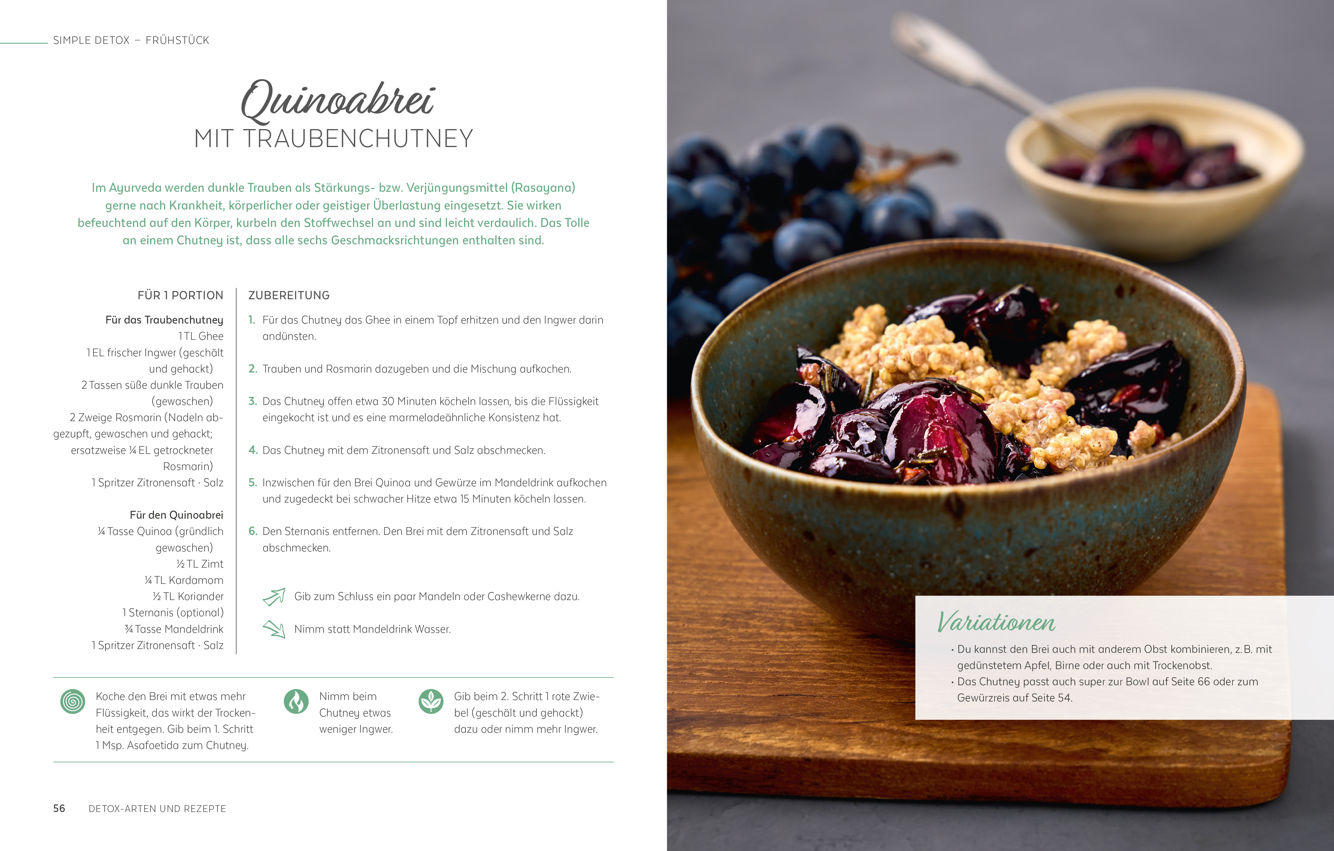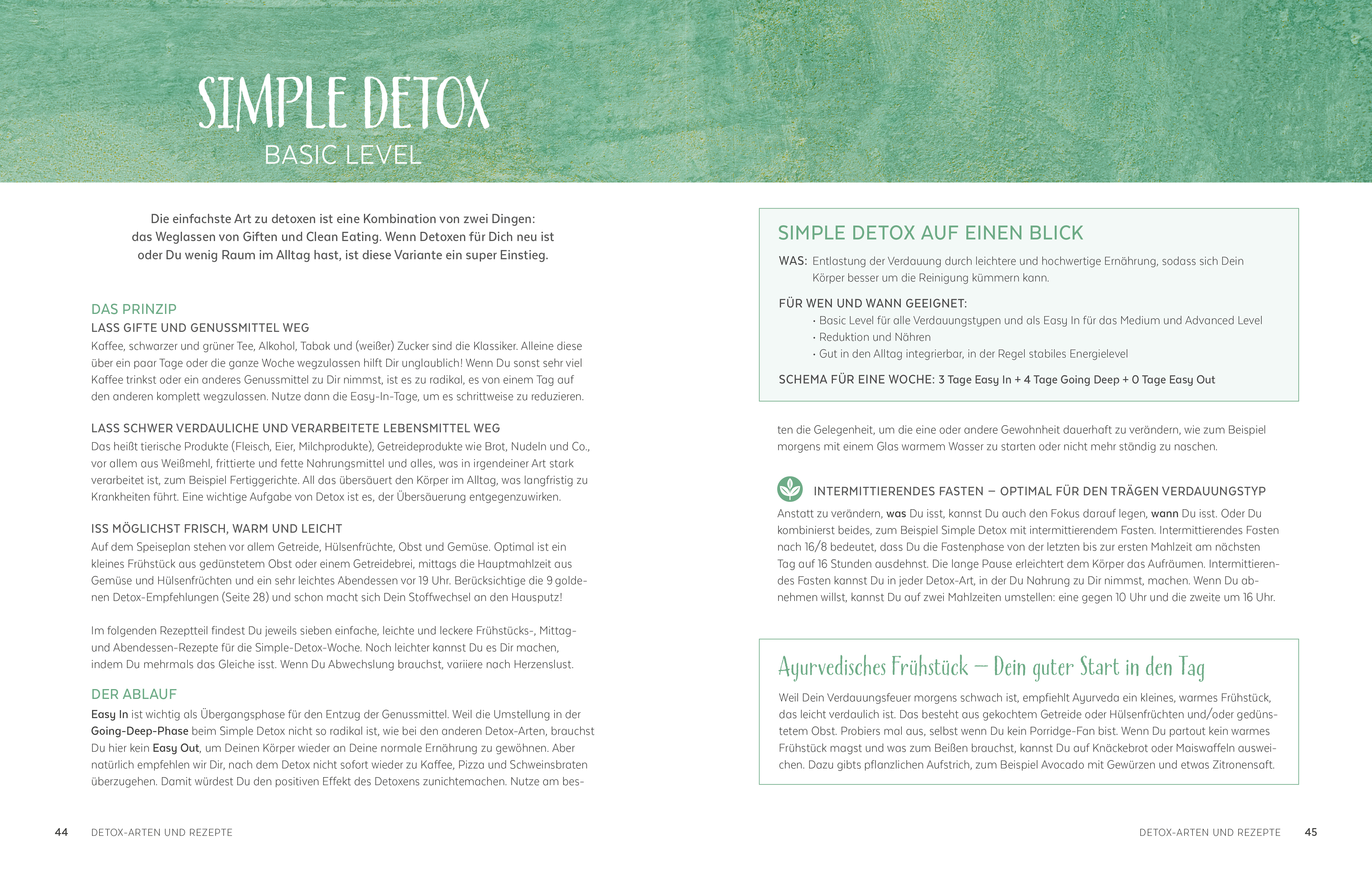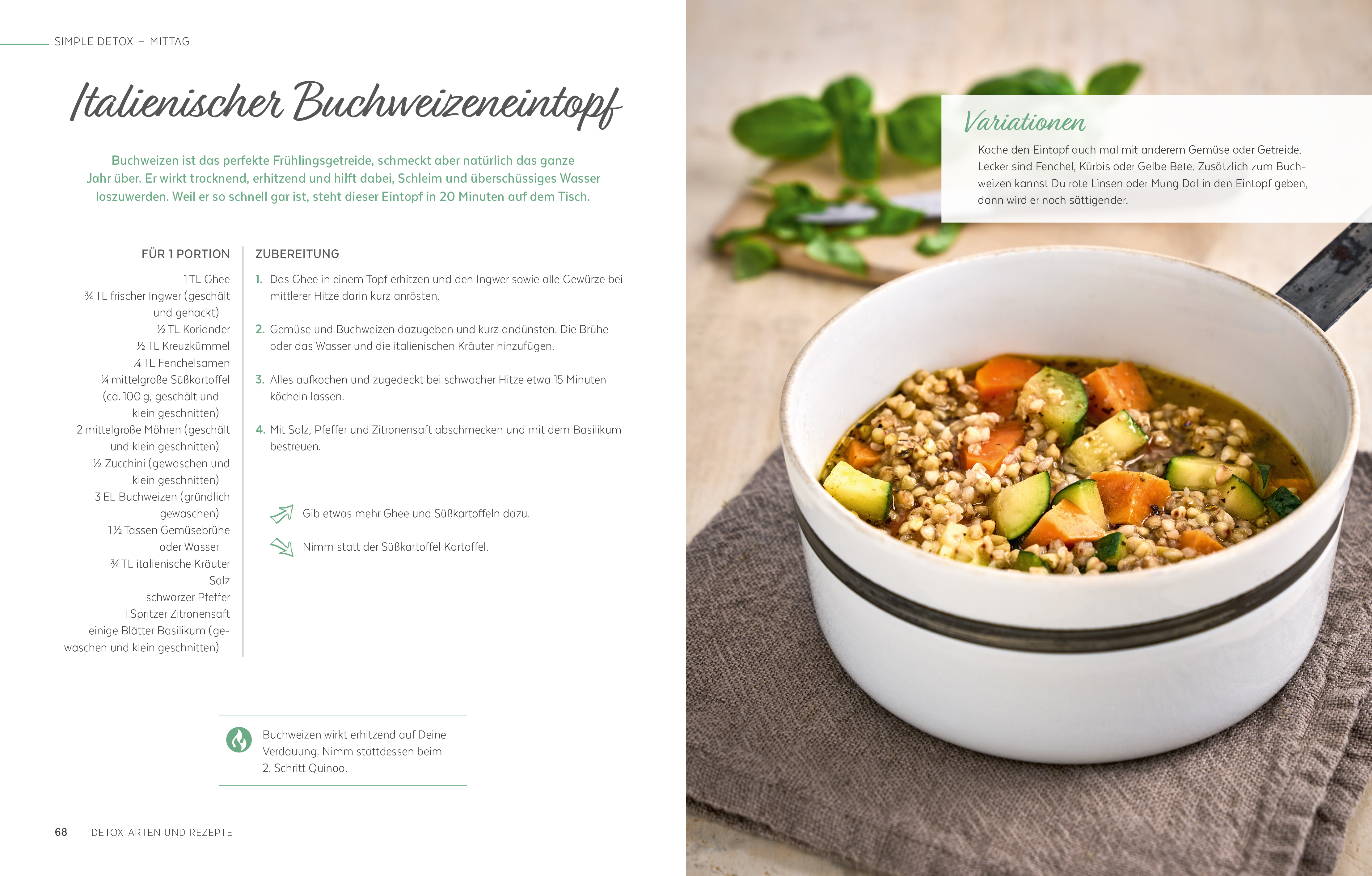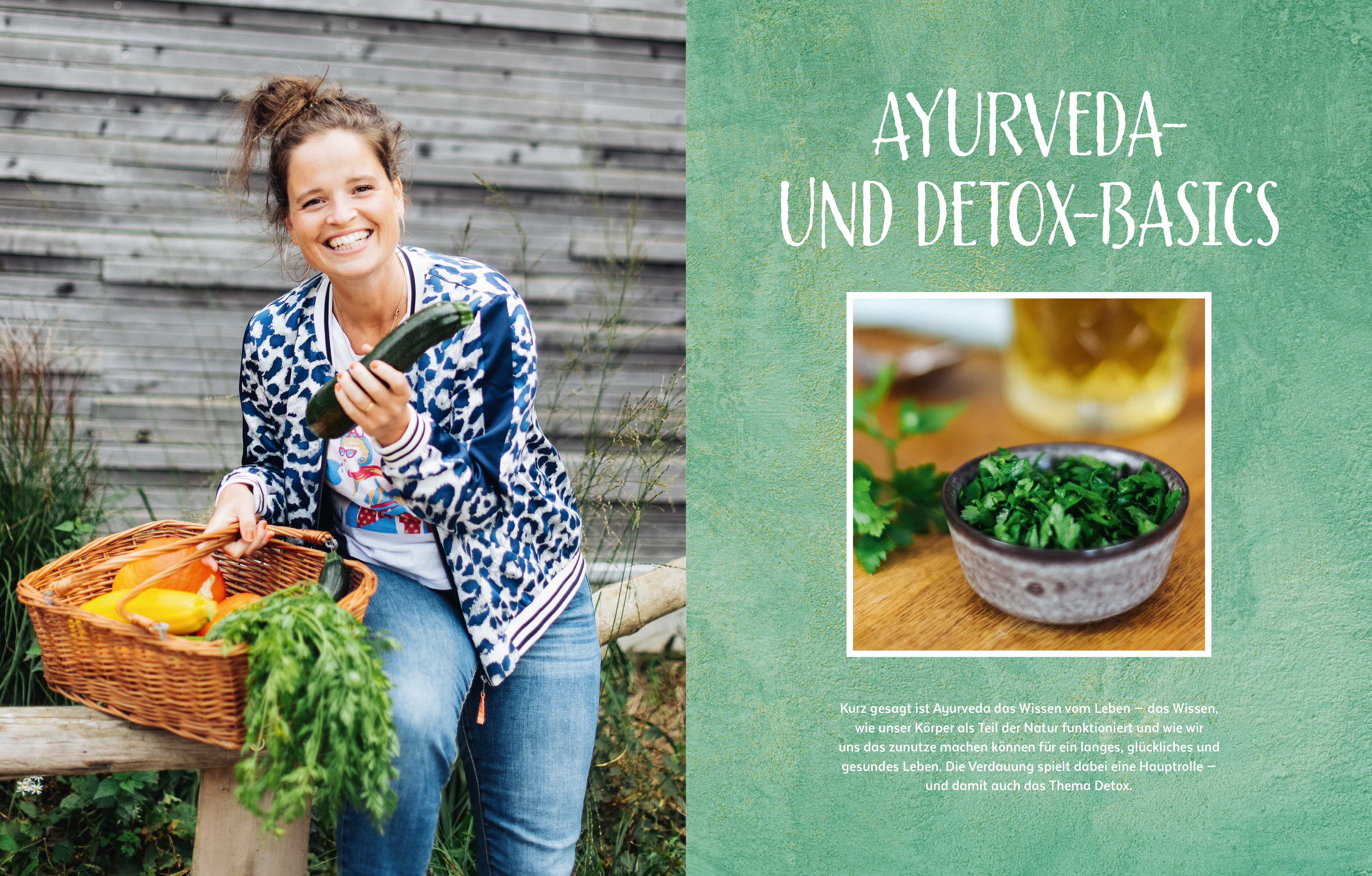 Die Ayurveda-Expertinnen Dana Schwandt und Stephanie Schnicke zeigen, wie Detox zu Hause individuell und modern funktioniert. Man lernt die Hintergründe aus dem Ayurveda kennen und versteht, welcher Stoffwechseltyp man ist. Es werden verschiedene Detox-Varianten für jeden Typ und jedes Ziel vorgestellt. Als Einstieg genügt dem Stoffwechsel schon eine Woche, in der man gezielt auf bestimmte Dinge verzichtet und sich nach den ayurvedischen Prinzipien ernährt. Dafür gibt’s viele schnelle, leckere Rezepte. Und auch alte Detox-Hasen kommen mit etwas strengeren Varianten auf ihre Kosten.
