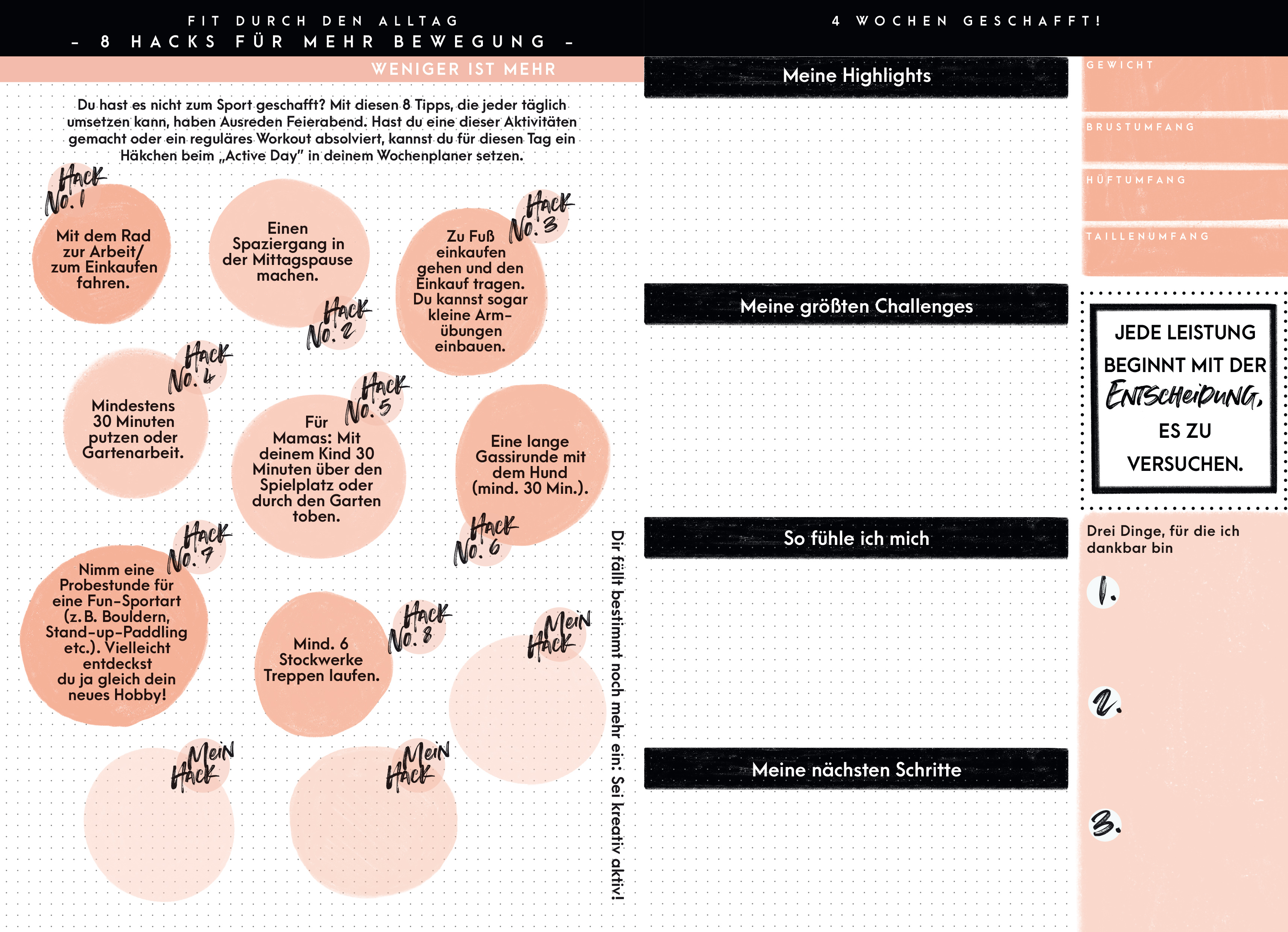 Die perfekte Unterstützung für ein fittes und gesundes Jahr: Wann will ich welche Trainings-Einheit anpacken? Wie bringe ich mein Workout mit all meinen anderen Terminen unter einen Hut? Wie sieht mein Ernährungsplan aus? Welche Ziele will ich eigentlich erreichen? Und wo kann ich meine Fortschritte und Erfolge dokumentieren? Sophia Thiels Jahresplaner bringt all dies zusammen: Terminkalender, To-Do-Listen, Fitness-Tracking, Einkaufslisten und Tagebuch. Dabei will Sophia nicht nur den Alltag organisieren, sondern auch mehr Achtsamkeit in den Umgang mit sich selbst bringen. Denn es geht nicht darum, stur einem fixen Programm zu folgen, sondern herauszufinden, wie der eigene Weg zu körperlicher und mentaler Fitness aussieht. Der Wochenplan hilft dabei, vor lauter Training keine anderen Termine zu vergessen – weder den Arztbesuch, noch den Geburtstag der Tante oder den Kinobesuch mit Freunden. Einmal im Monat kann man eine kleine Zwischenbilanz ziehen. Und falls der innere Schweinehund doch mal ganz laut kläfft: Sophia hat jede Menge Tipps, wie man sich immer wieder selbst motiviert.