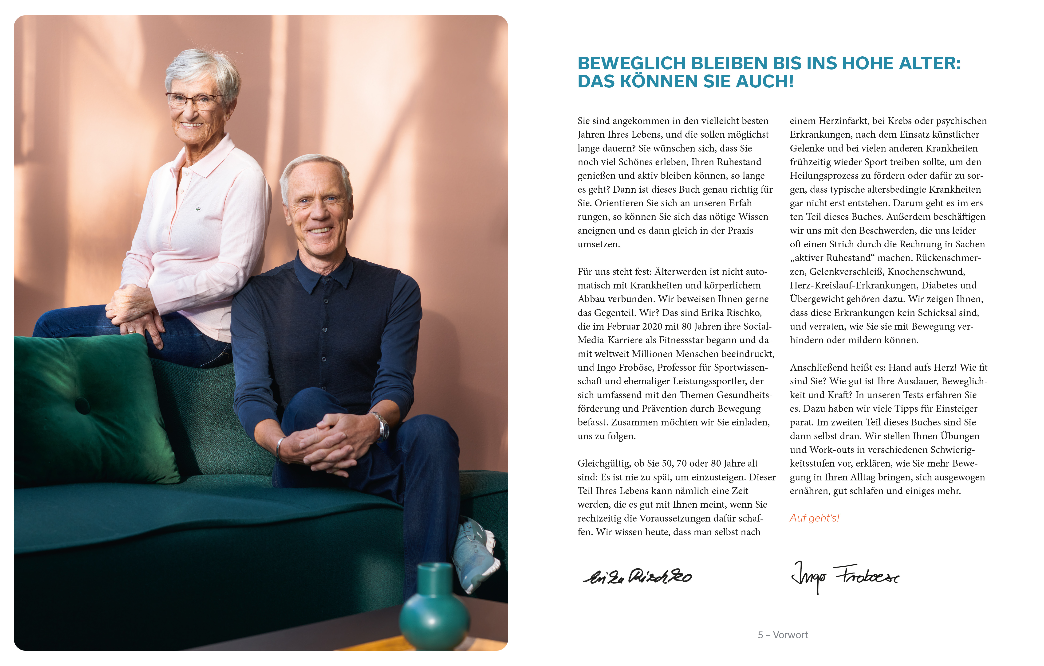 Gemeinsam mit dem Gesundheitsexperten Prof. Dr. Ingo Froböse präsentiert sie ihre Lieblings-Fitnessübungen für zu Hause. Prof. Froböse gibt dazu viele hilfreiche Tipps, wie man als Anfänger den richtigen Einstieg schafft. Und auch in Sachen gesunde Ernährung, Entspannung und positive Lebenseinstellung weiß Prof. Froböse, was man sich schon heute Gutes tun kann, um bis ins hohe Alter fit zu bleiben.
