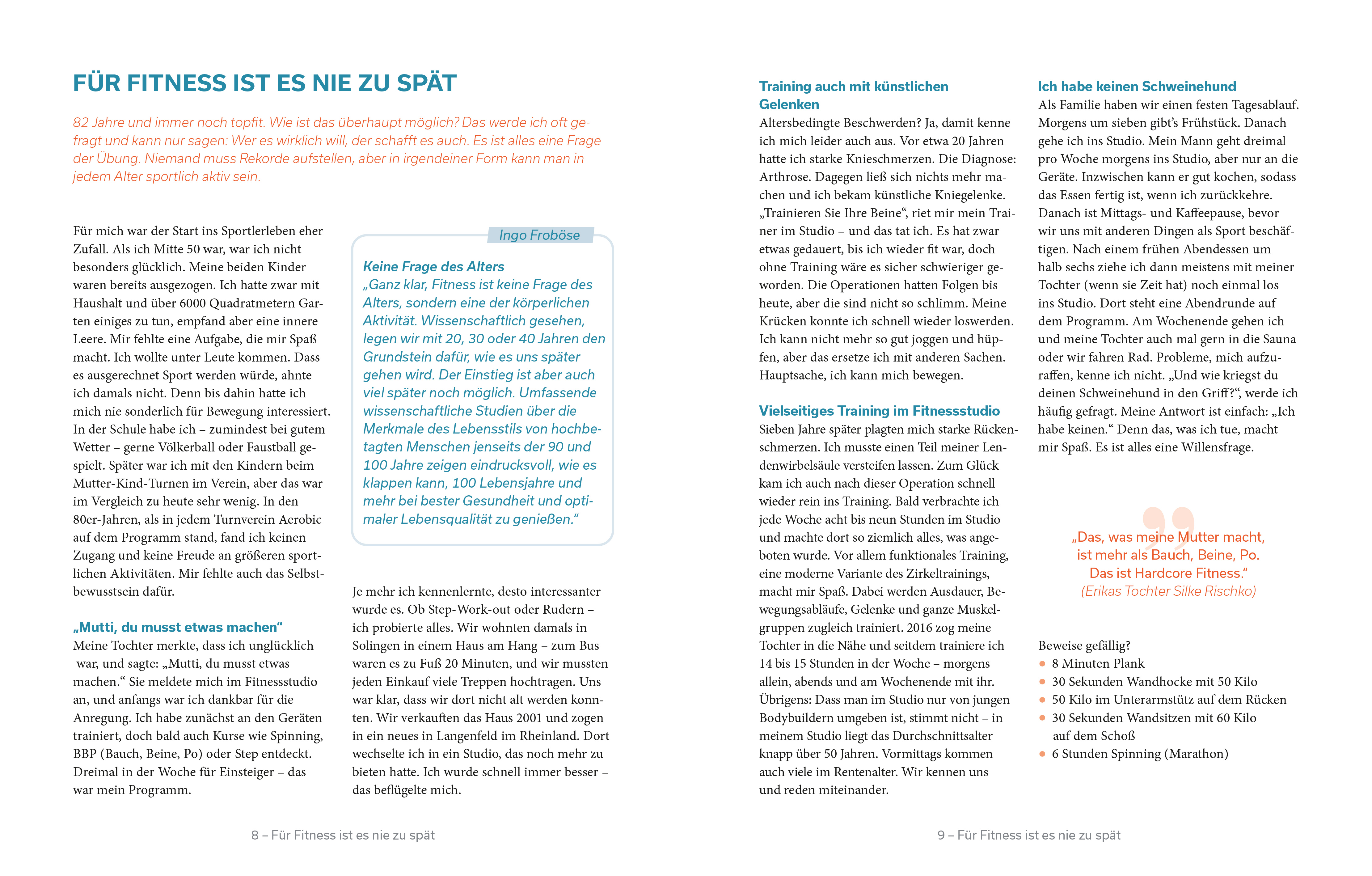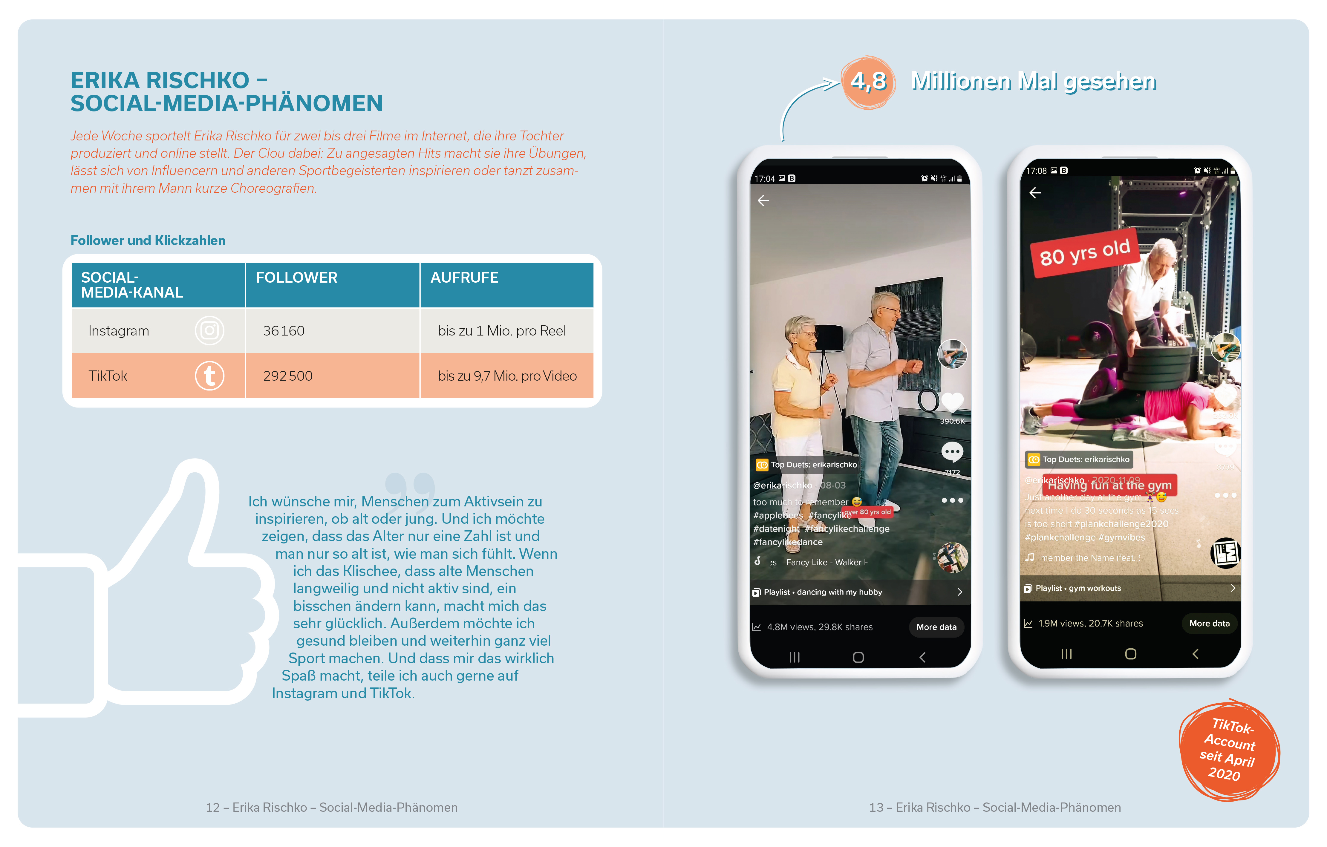 Sie ist ein echter Fitness-Junkie, sagt Erika Rischko. Acht Minuten Unterarmstütz? Wall Sitting, Kettlebell-Schwingen, 50 Kilo stemmen? Alles kein Problem! Das Besondere: Erika, heute 82 Jahre alt, hat das Fitness-Fieber erst mit 55 gepackt – und trotz zweier künstlicher Kniegelenke ist sie fitter als so manch einer mit 20. Mit ihren Workout-Clips ist sie zum TikTok-Shootingstar mit Klickzahlen in Millionenhöhe geworden. Das Medienecho zu ihrer Netzkarriere ist enorm. Die „Fitness-Oma“ gilt als Vorbild und Mutmacher, ihre positive Energie steckt einfach an. Sie zeigt, dass man auch in fortgeschrittenem Alter mit Sport beginnen kann – ganz nach ihrem Motto: „Je öller, je döller!“