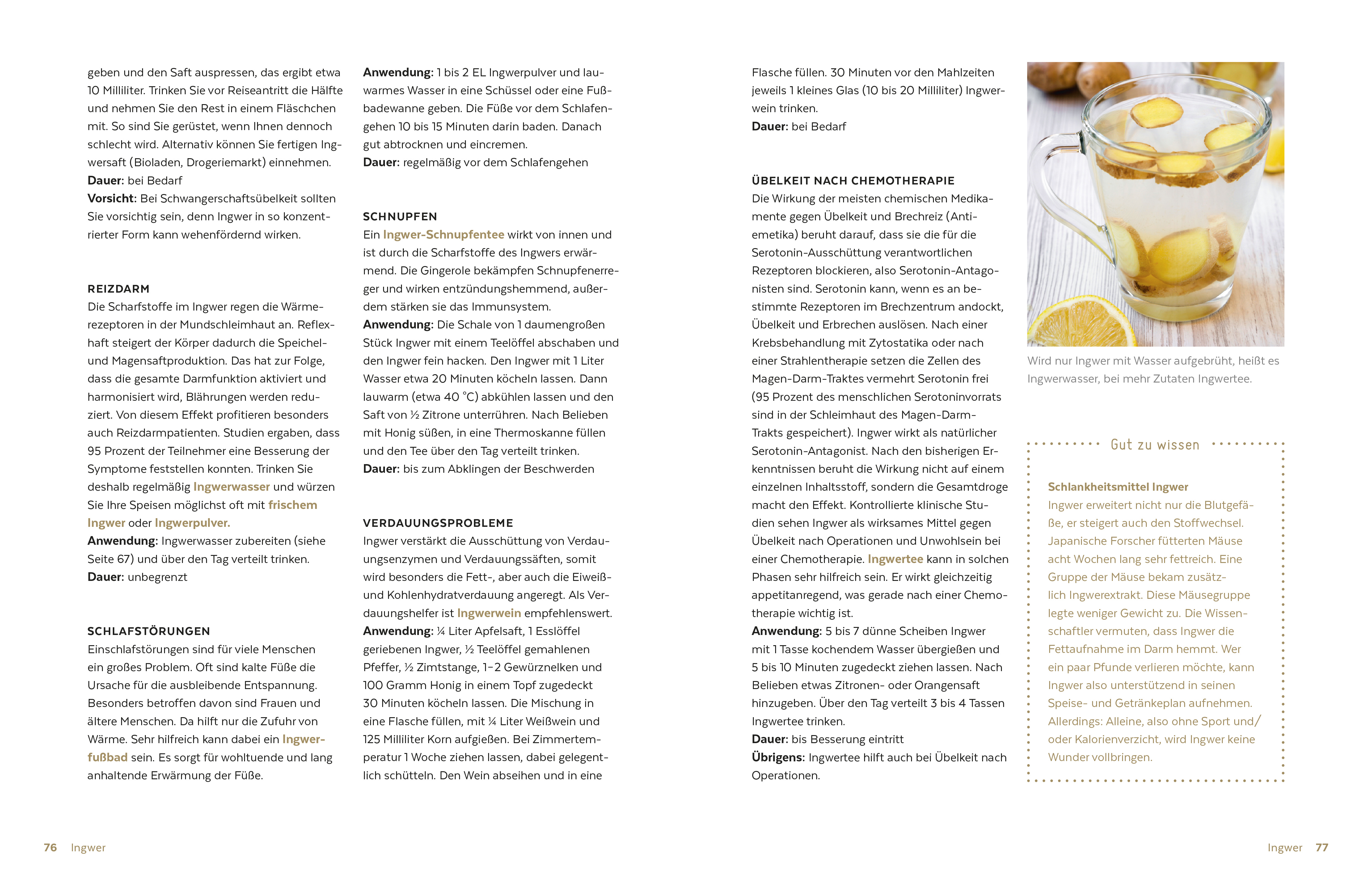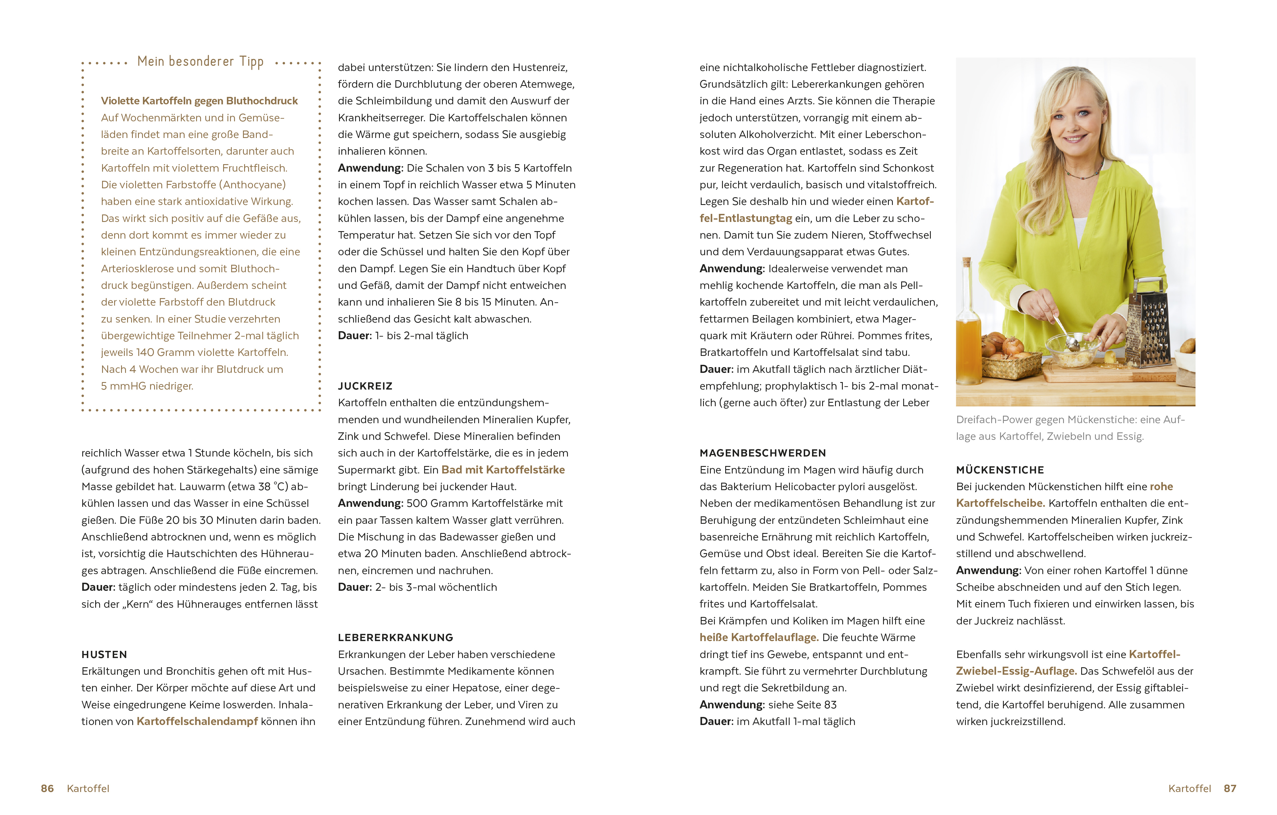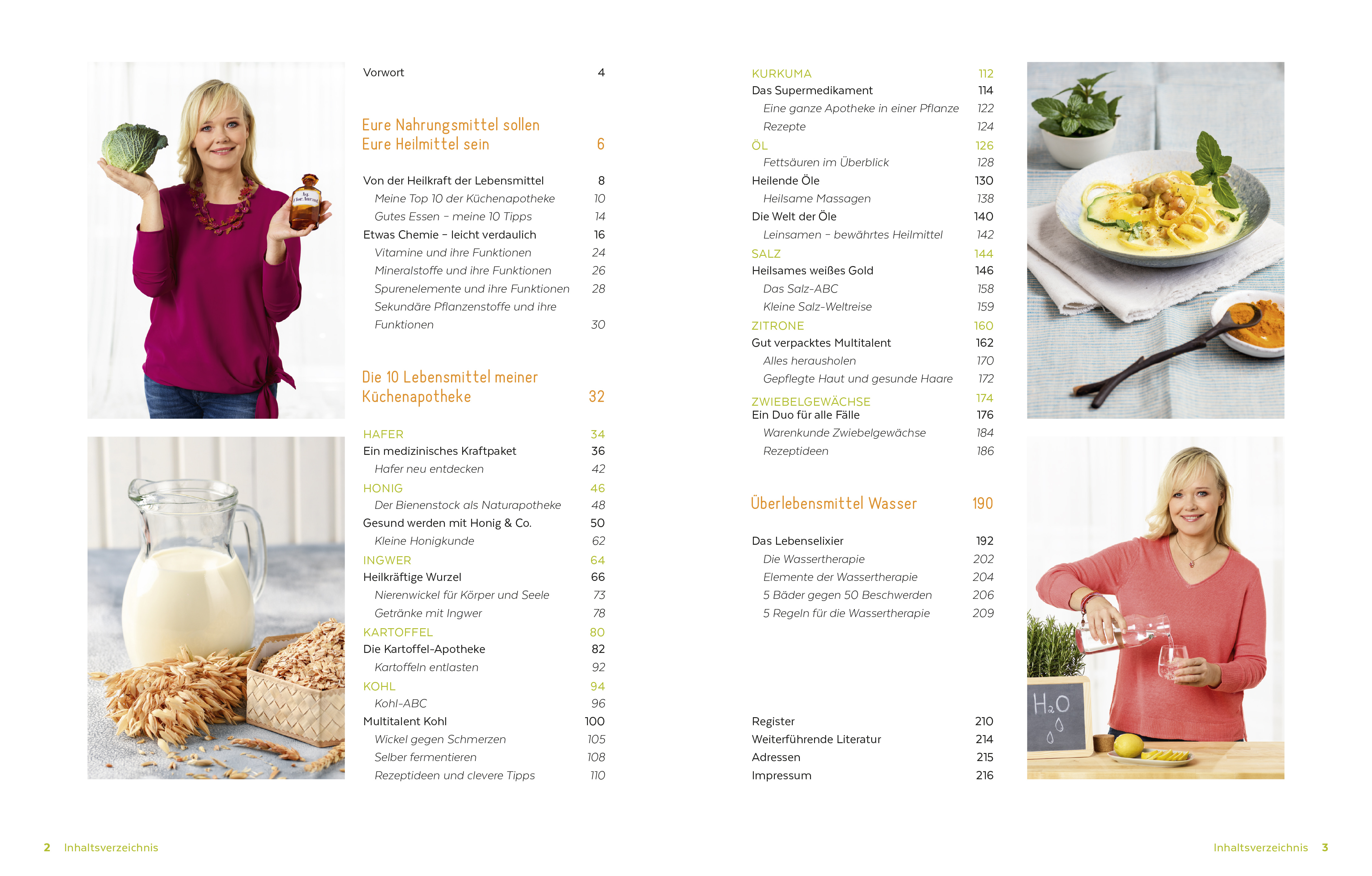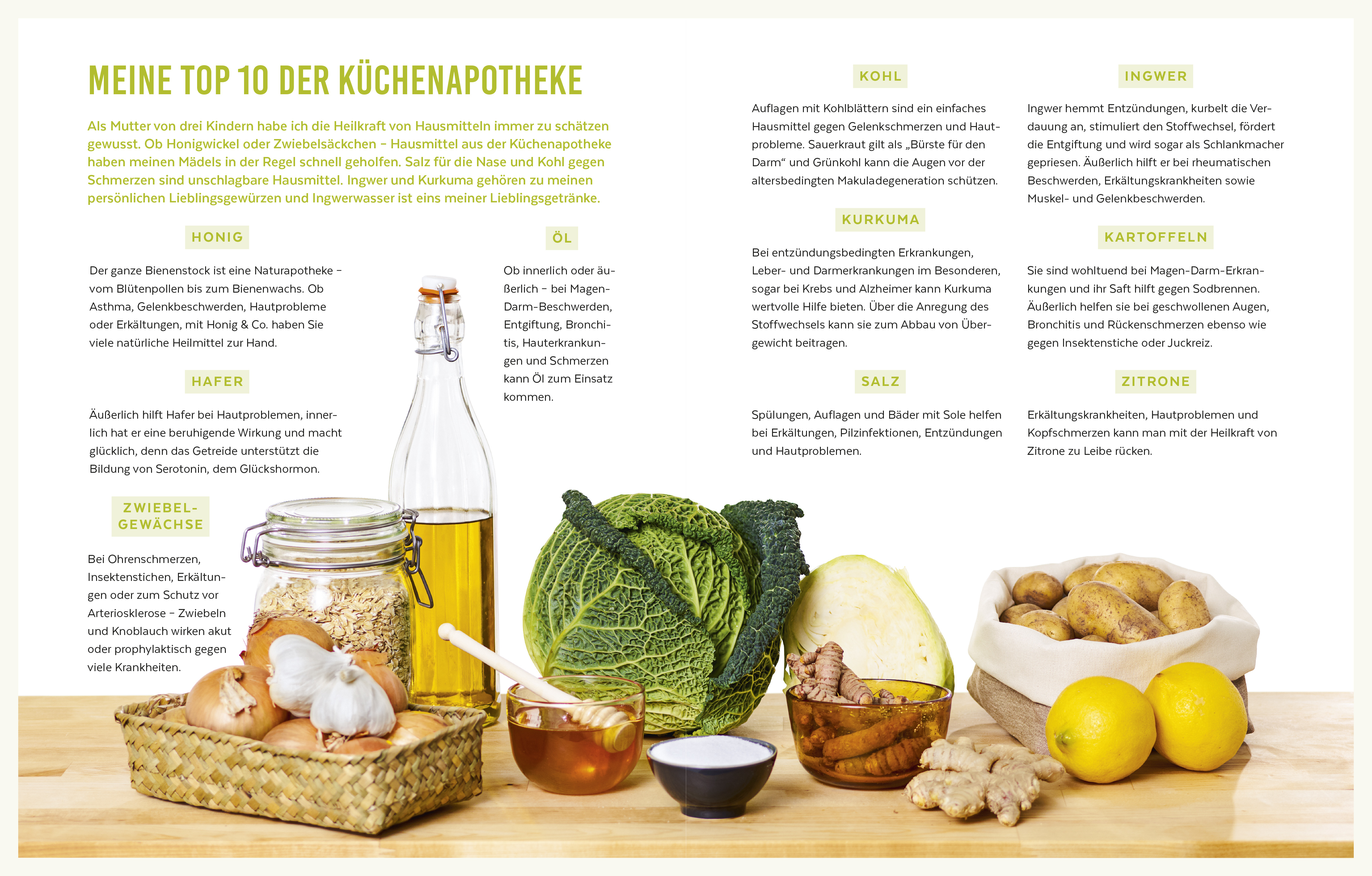 Einfache Hausmittel neu entdeckt: Heilen mit den Top 10 aus der Küchen-Apotheke Bei Erkältungen, Kopfschmerzen oder Verdauungsproblemen kann man sich oft den Gang zur Apotheke sparen. Denn ganz alltägliche Lebensmittel, die jeder zu Hause im Küchen- und Kühlschrank hat, können auf sanfte und natürliche Art heilen: – Hafer – Honig – Ingwer – Kartoffel – Kohl – Kurkuma – Öl – Salz – Zitrone – Zwiebel Bestsellerautorin Dr. med. Franziska Rubin stellt in ihrem neuen Ratgeber die 10 Top-Lebensmittel und ihre Anwendungsmöglichkeiten gegen 100 häufige Beschwerden und Krankheiten vor: Frisch gepresster Kartoffelsaft kann gegen Sodbrennen helfen. Inhalationen oder Nasenspülungen mit Salzwasser vertreiben Schnupfenviren. Eine Ingwertinktur lindert Zahnfleischentzündungen und Kohlwickel mildern Krampfadern. Auch Zitrone, Öl, Kurkuma, Zwiebeln, Honig und Hafer können bei Jung und Alt wahre Wunder wirken. Jedes Lebensmittel wird in einem Steckbrief mit allem Wissenswerten zu Inhaltsstoffen und Wirkungsweisen vorgestellt. Ob als Aufguss, Tinktur, Salbe, Auflage oder Bad, ob zur äußeren oder inneren Anwendung – die Wundermittel kommen gegen die häufigsten Krankheiten zum Einsatz, sie wirken vorbeugend und stärken das Immunsystem.