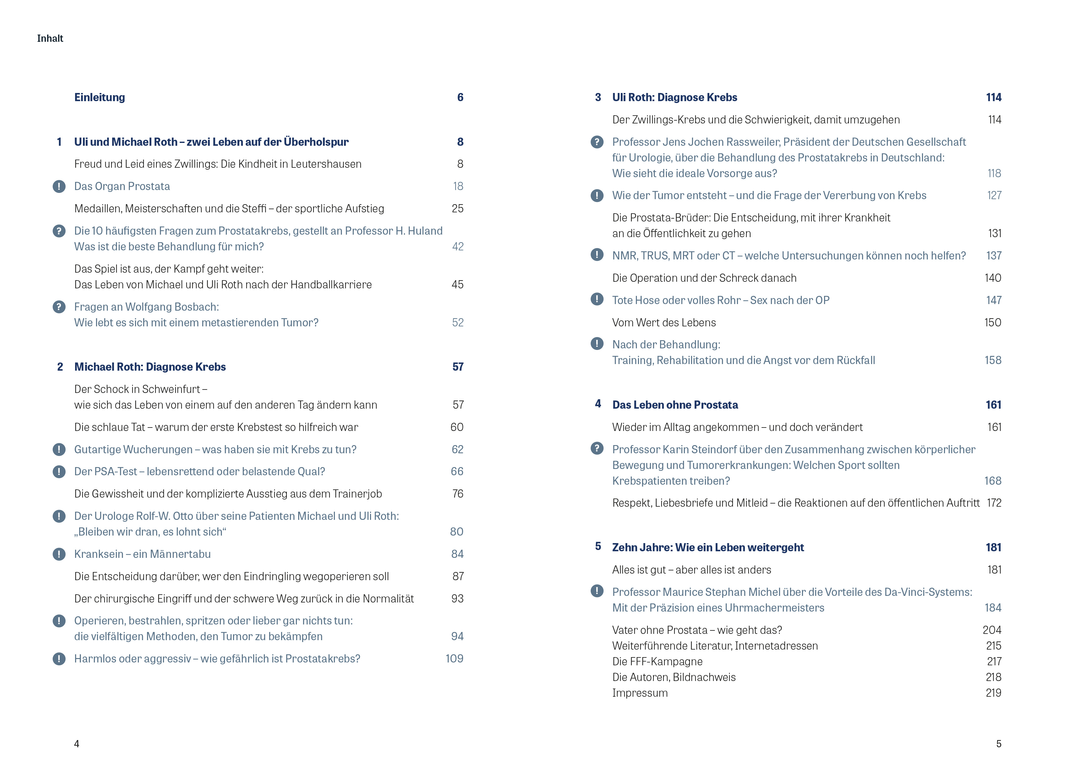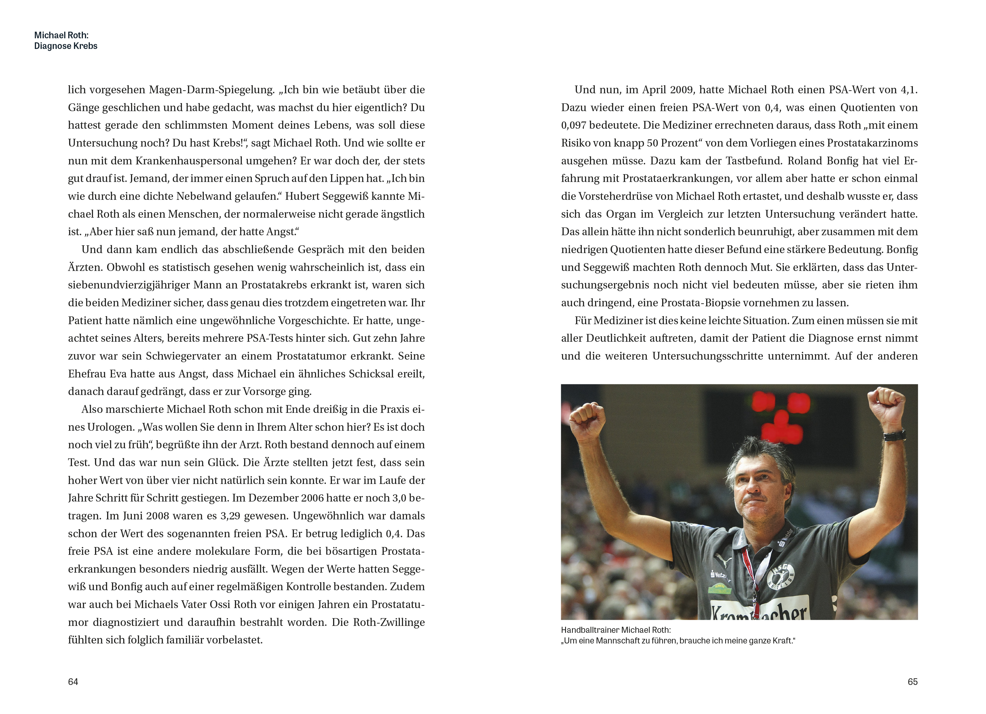 Vor 10 Jahren sorgten Uli und Michael Roth in den Medien für Aufsehen: Die bekannten Profi-Handballer machten ihre Prostatakrebs-Erkrankung öffentlich und brachen damit ein Tabu. Denn: Frauen betreiben Krebs-Vorsorge, Männer schweigen. Jetzt ist es an der Zeit, die Geschichte der Roth-Zwillinge weiterzuschreiben. Die beiden gelten mittlerweile als geheilt, haben aber eine Mission: möglichst viele – vor allem jüngere – Männer zur Vorsorgeuntersuchung zu bewegen. Denn sie wissen aus eigener Erfahrung: Wird Prostatakrebs frühzeitig erkannt, haben die Betroffenen eine sehr gute Chance auf Heilung. Ihr Buch erzählt nicht nur Persönliches, sondern ist ein Patientenratgeber im besten Sinne: Es bietet aktuelles Wissen in leicht verständlicher Form und gibt wertvolle Tipps von angesehenen Experten. Deutschlands führende Mediziner beantworten häufige Patientenfragen, erklären neueste OP-Verfahren und geben Ratschläge, wie ein gesunder Lebensstil nach der OP gelingen kann. Neben den Roths kommen auch andere Patienten und Prominente zu Wort, um dem Krebs Nummer 1 bei Männern den Kampf anzusagen. Ein Mutmach-Buch für alle Männer – und Frauen, die ihre Männer lieben.