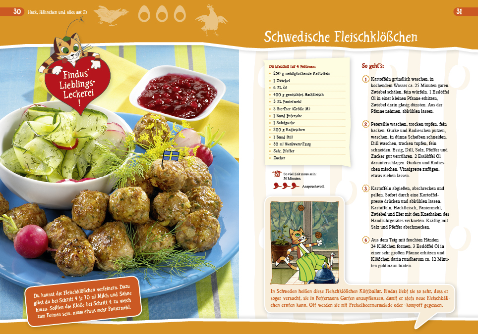 Ein Buch zum Backen und Kochen mit dem neugierigen Findus und seinem Herrchen Pettersson, der schon mal das Mehl vergisst, wenn er seinem Kater zum Geburtstag seine geliebte Pfannkuchentorte backen will. Damit euch das nicht passiert, gibt es jetzt dieses Buch: mit Findus` kolossalen Lieblingsgerichten – direkt aus Petterssons vermehlter Backstube und chaotischer Abenteuerküche!