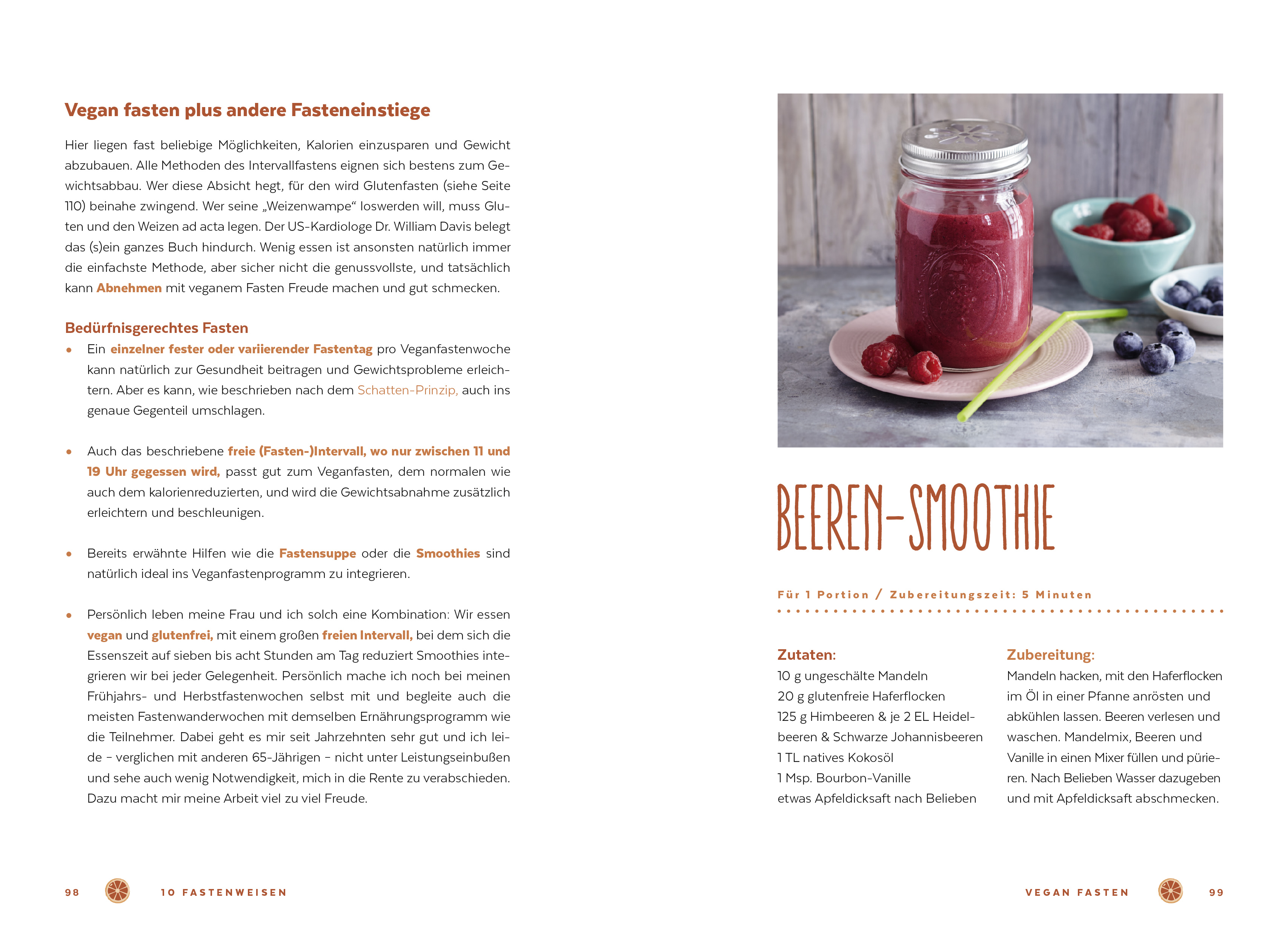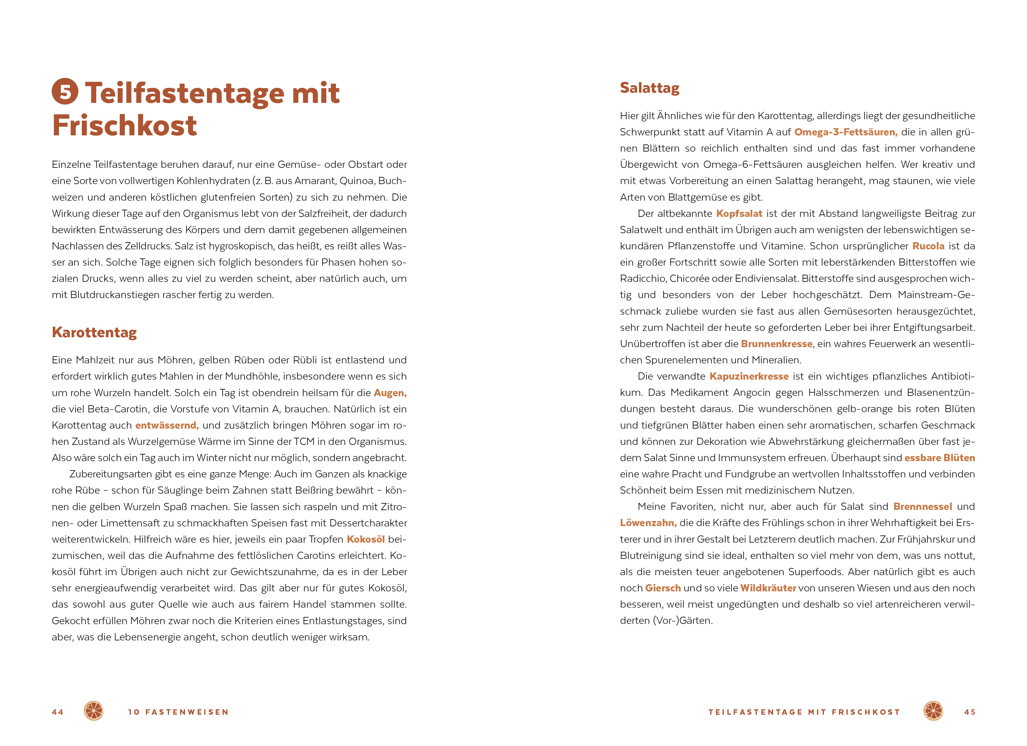 Schmackhaftes Fasten – das gibt es nicht? Keineswegs! Man muss nur die richtige Fastenmethode für sich entdecken, und die ist hier garantiert dabei. Der Fastentest bringt Gewissheit und dann kann auch schon jeder mit dem für ihn richtigen Kurzprogramm loslegen. Dabei ist jedes Programm ganz individuell: Ob für einen Tag oder eine Woche, ob mit Reis, Saft oder Suppe, vegan oder klassisches Heilfasten, um neue Energie zu gewinnen, um den Kopf durchzupusten oder um ein paar Pfunde zu verlieren. Arzt, Psychotherapeut und Fastenexperte Dr. med. Ruediger Dahlke schwört dabei nicht auf totalen Verzicht – denn Minestrone mit Lauch, Bohnen und Paprika, Reis mit frischen Beeren oder grüner Smoothie mit Petersilie hören sich nicht gerade wie Fastenrezepte an. Kein Wunder, hat sich Ruediger Dahlke für seine Rezepte doch Haubenköchin Dorothea Neumayr zur Seite geholt. Einfach mal loslegen lautet die Devise – mit den 10 Kurzprogrammen schafft es jeder, den Frühjahrsputz von innen durchzuführen.