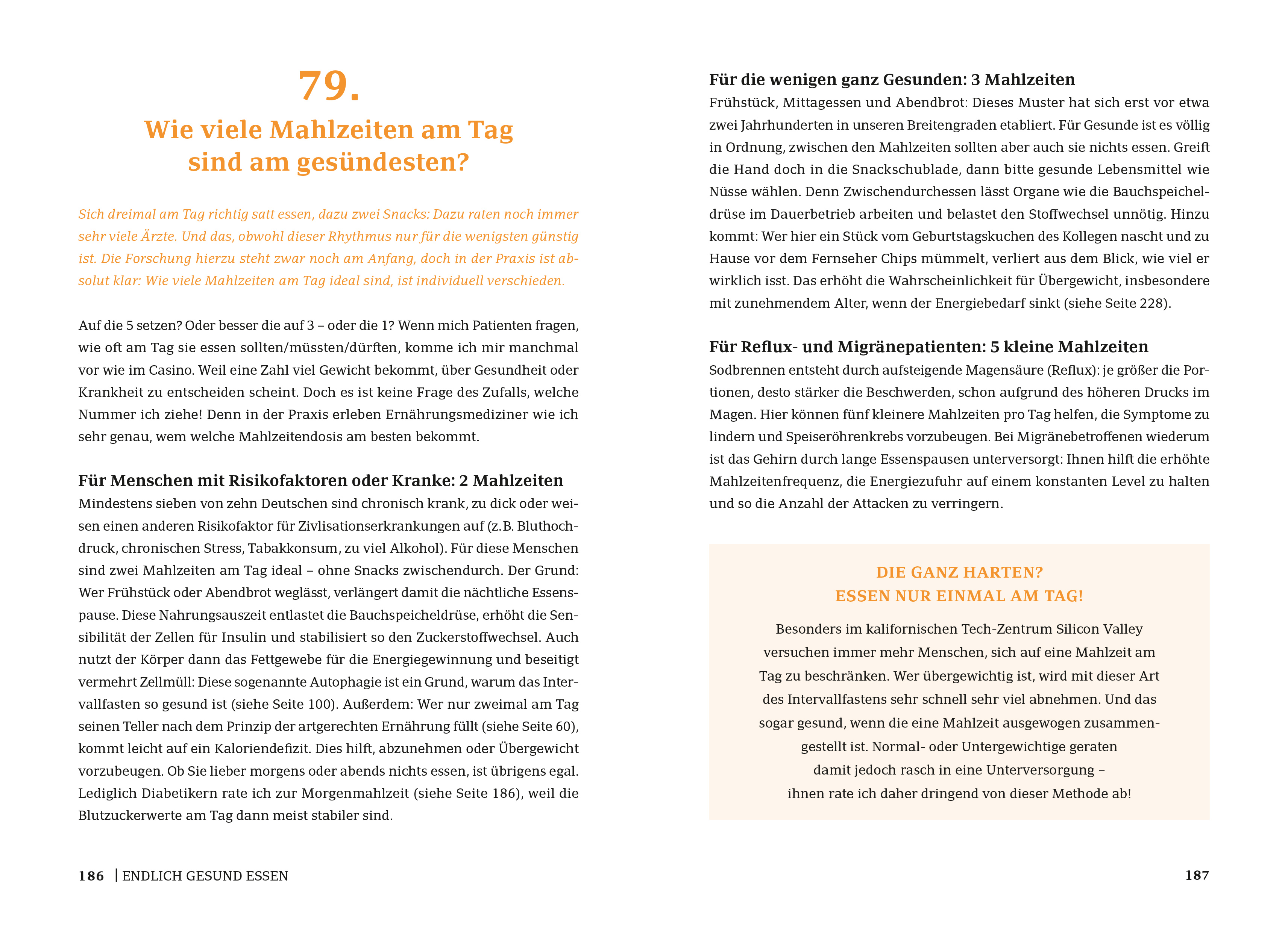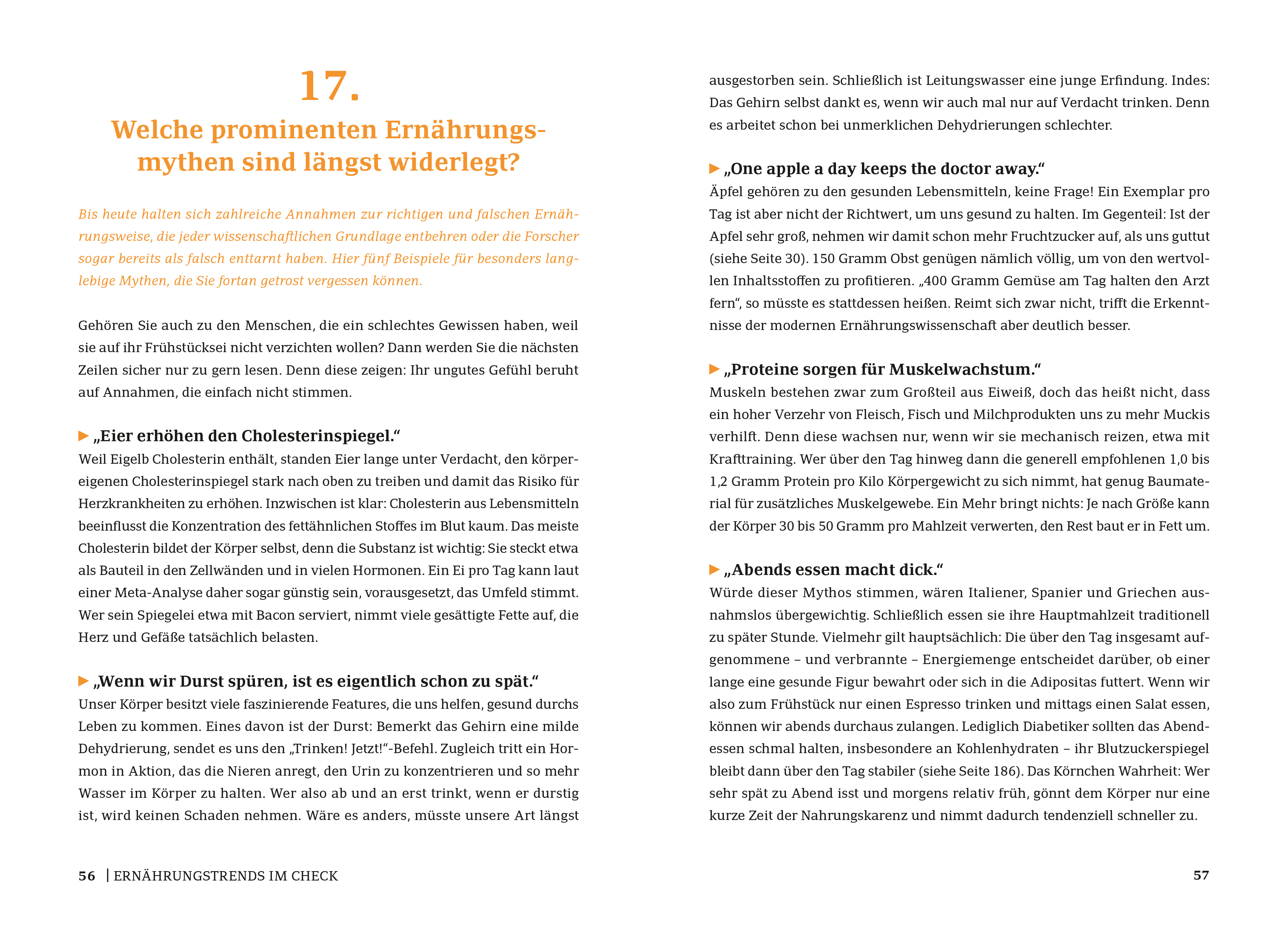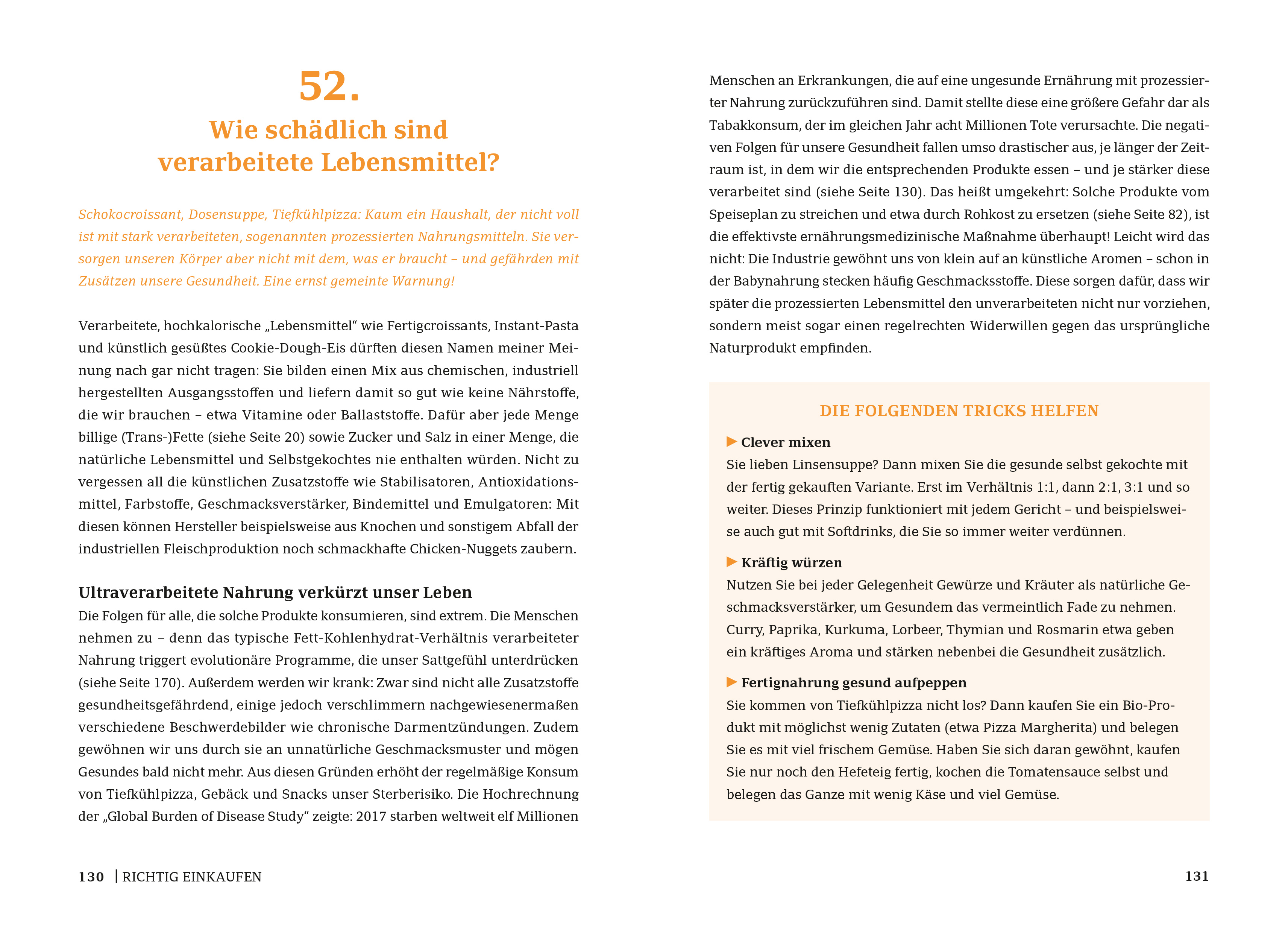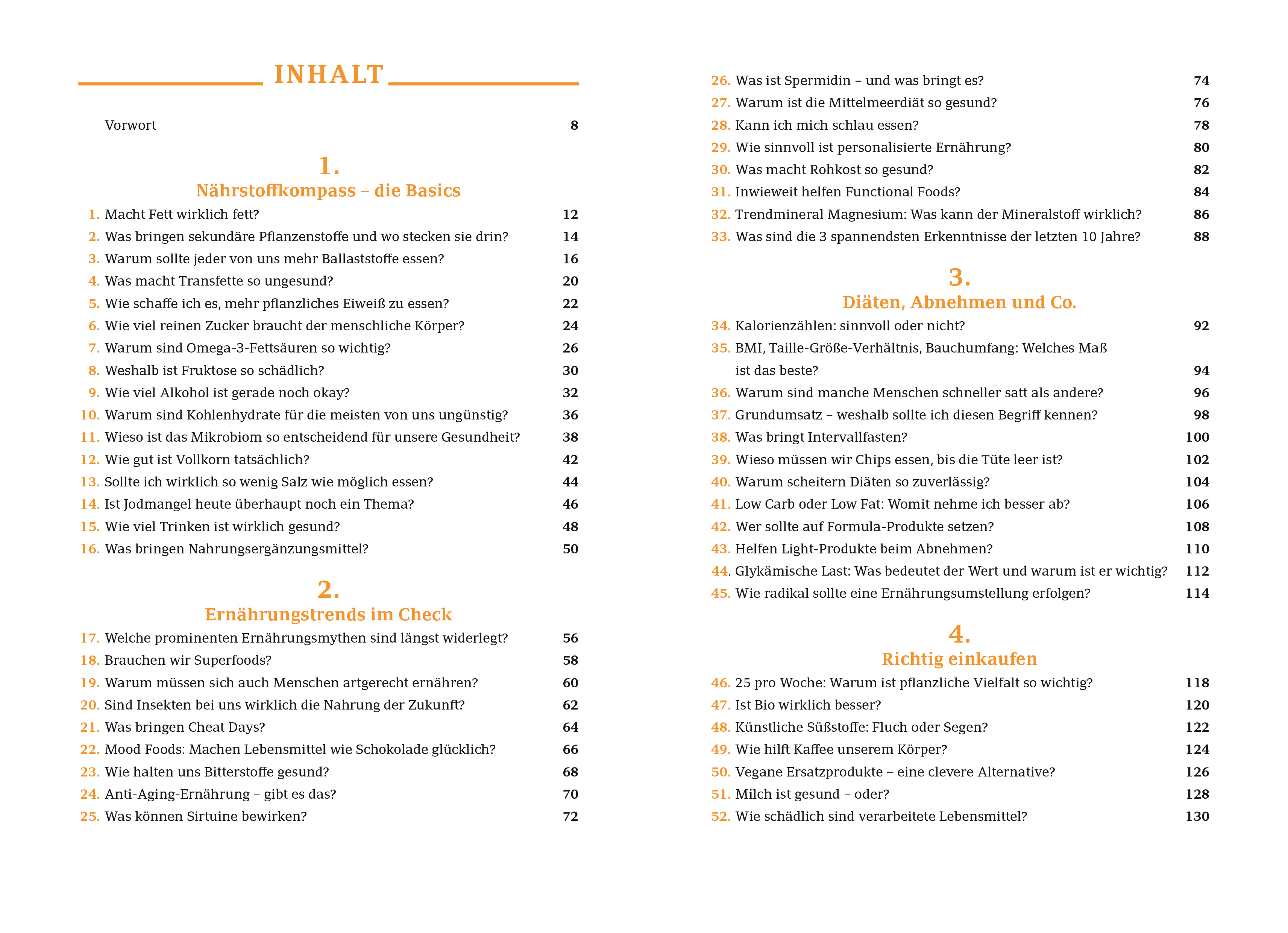 Brauchen wir Superfood? Sind Insekten-Burger oder vegane Ersatzprodukte eine gesunde Alternative? Macht Fett wirklich fett? Warum sind manche Menschen schneller satt als andere? Und ist Bio wirklich immer besser? Für den Laien steckt der Ernährungs-Alltag voller Fragezeichen und Stolperfallen. Die Ansprüche an eine hochwertige Ernährung wachsen, doch wir haben immer weniger Zeit fürs Kochen und Genießen, das echte Ernährungs-Know-how dümpelt eher auf niedrigem Level und wir fühlen uns zwischen den ständig aufploppenden neuen Food-Trends verloren. Zeit für den TV-Ernährungs-Doc Dr. Matthias Riedl, endlich für Klarheit zu sorgen! Umfassend beantwortet er die 100 wichtigsten und meistgestellten Ernährungs-Fragen. Praxisnah, brandaktuell und auf dem neuesten Stand der Forschung bringt er sein Wissen auf den Punkt. Er behandelt dabei die Themenkomplexe: – Nährstoffkompass – die Basics – Ernährungstrends im Check – Diäten, Abnehmen und Co. – Richtig einkaufen – Endlich gesund essen – Essen als Medizin – Rundum gut versorgt – Die Top-5-Ernährungs-Regeln Damit soll dieses Buch ein Kompass sein, mit dem man souverän die richtigen Lebensmittel wählt, das Genießen neu lernt und sich selbstbewusst löst vom Einfluss der Lebensmittelindustrie und windiger Experten. Auf geht’s also, hin zu einem ganz persönlichen Weg, der in Richtung artgerechte Ernährung führt und damit zusätzliche gesunde Jahre auf der Lebensuhr sichert.