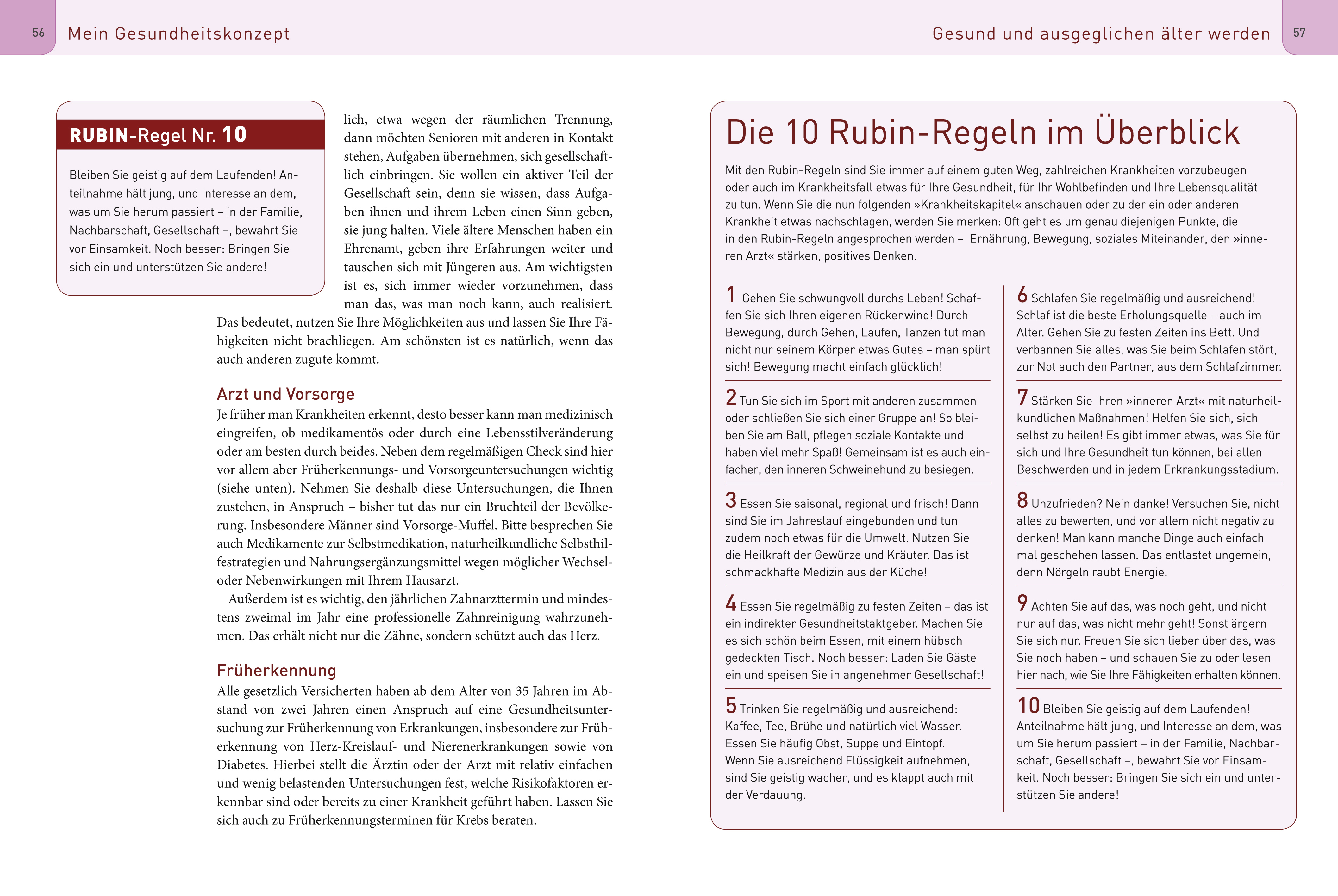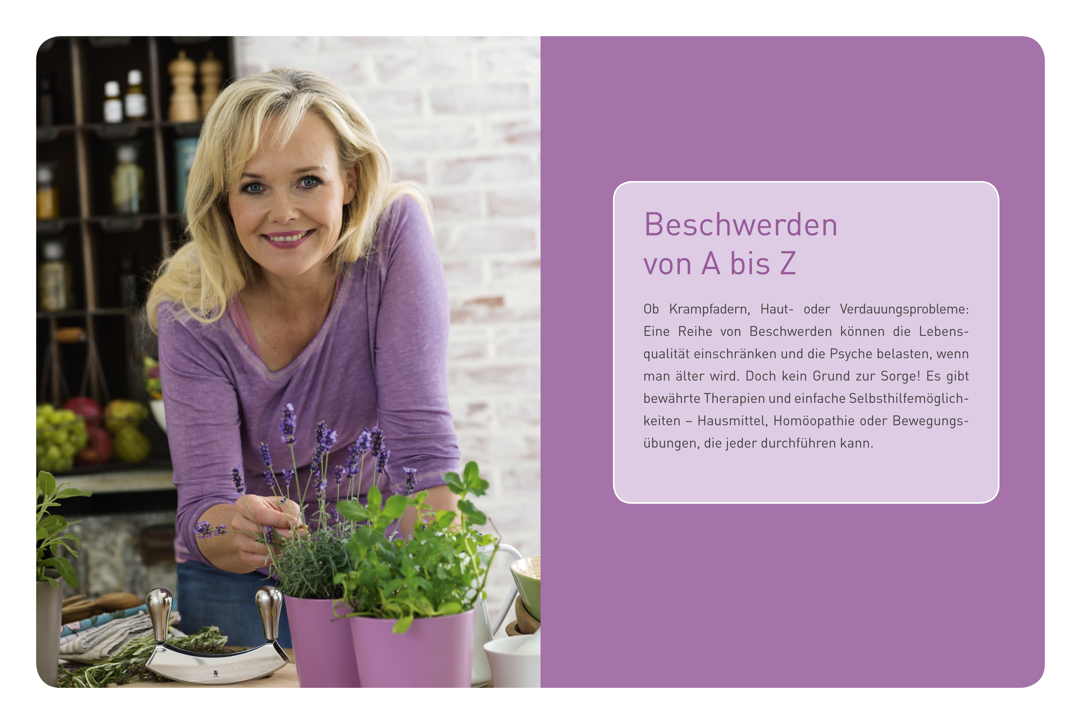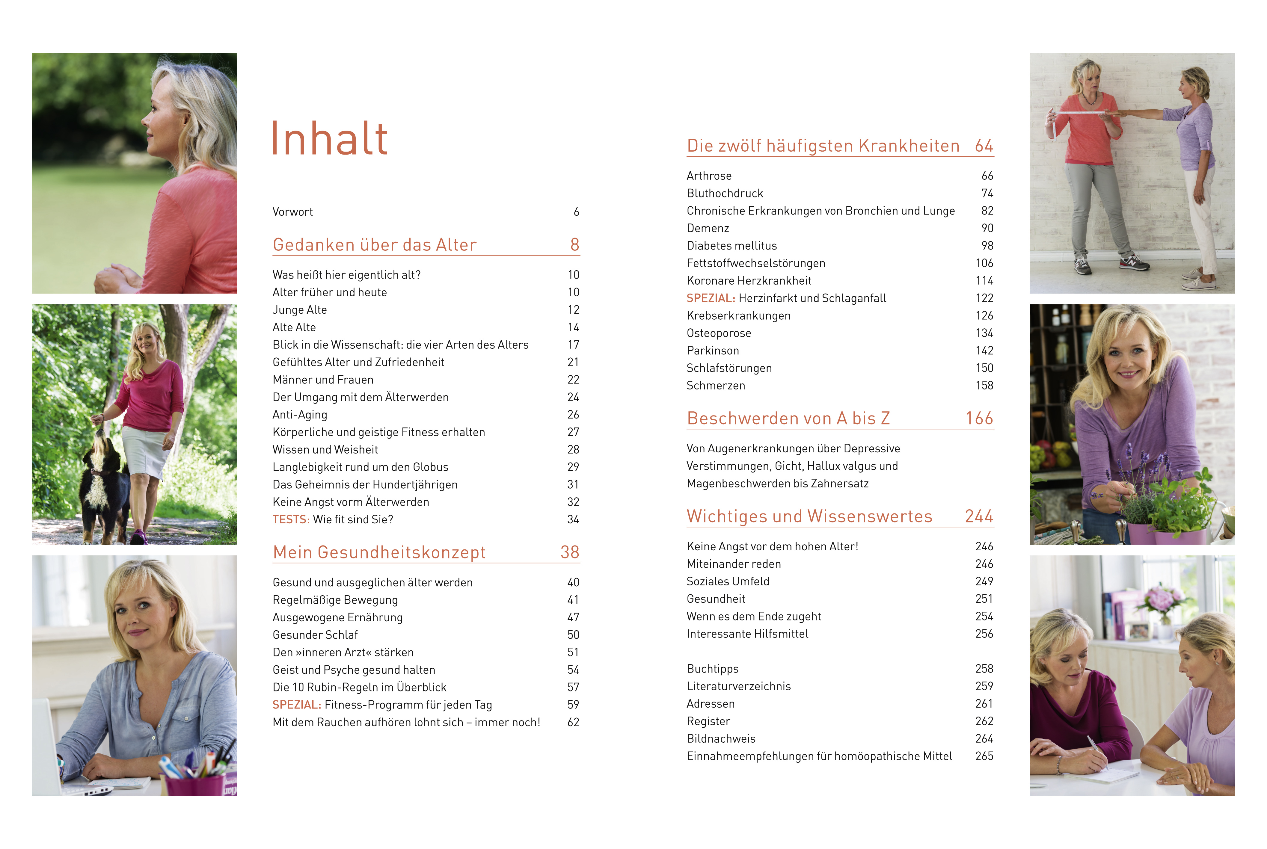 Es ist nie zu spät, etwas für die Gesundheit zu tun! Ärztin und Moderatorin Dr. med. Franziska Rubin gibt Selbsthilfe-Tipps zu über 50 typischen Krankheiten, insbesondere auch zu den häufigsten Erkrankungen im Alter. Ein Standardwerk für alle, die über die Hintergründe einer Erkrankung Bescheid wissen wollen und erfahren möchten, wie sie auch im Alter noch vorbeugen und sich mit einfachen Mitteln selbst helfen können. Franziska Rubin macht Mut, dem Älterwerden gelassen zu begegnen und zeigt Wege auf, Gesundheit, Wohlbefinden und Lebensqualität in der zweiten Lebenshälfte zu stärken. Ihr Buch bietet: kompetente Tipps zur Vorbeugung, praktische Selbsthilfe bei leichten und fortgeschrittenen Beschwerden, wirksame Behandlungsmethoden aus Schul- und Naturmedizin, hilfreiche Informationen für Angehörige und die 10 Rubin-Regeln für glückliches Älterwerden.