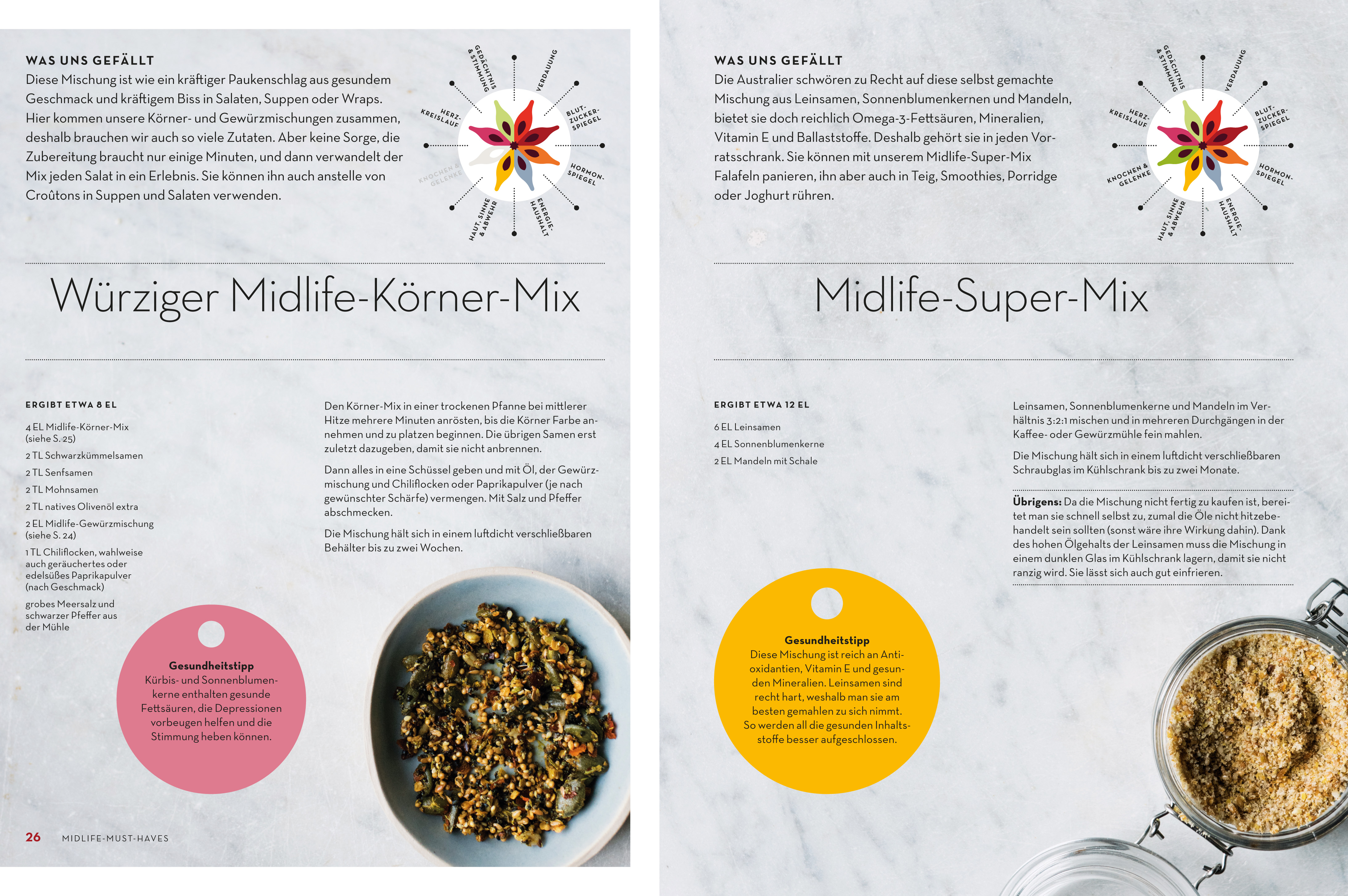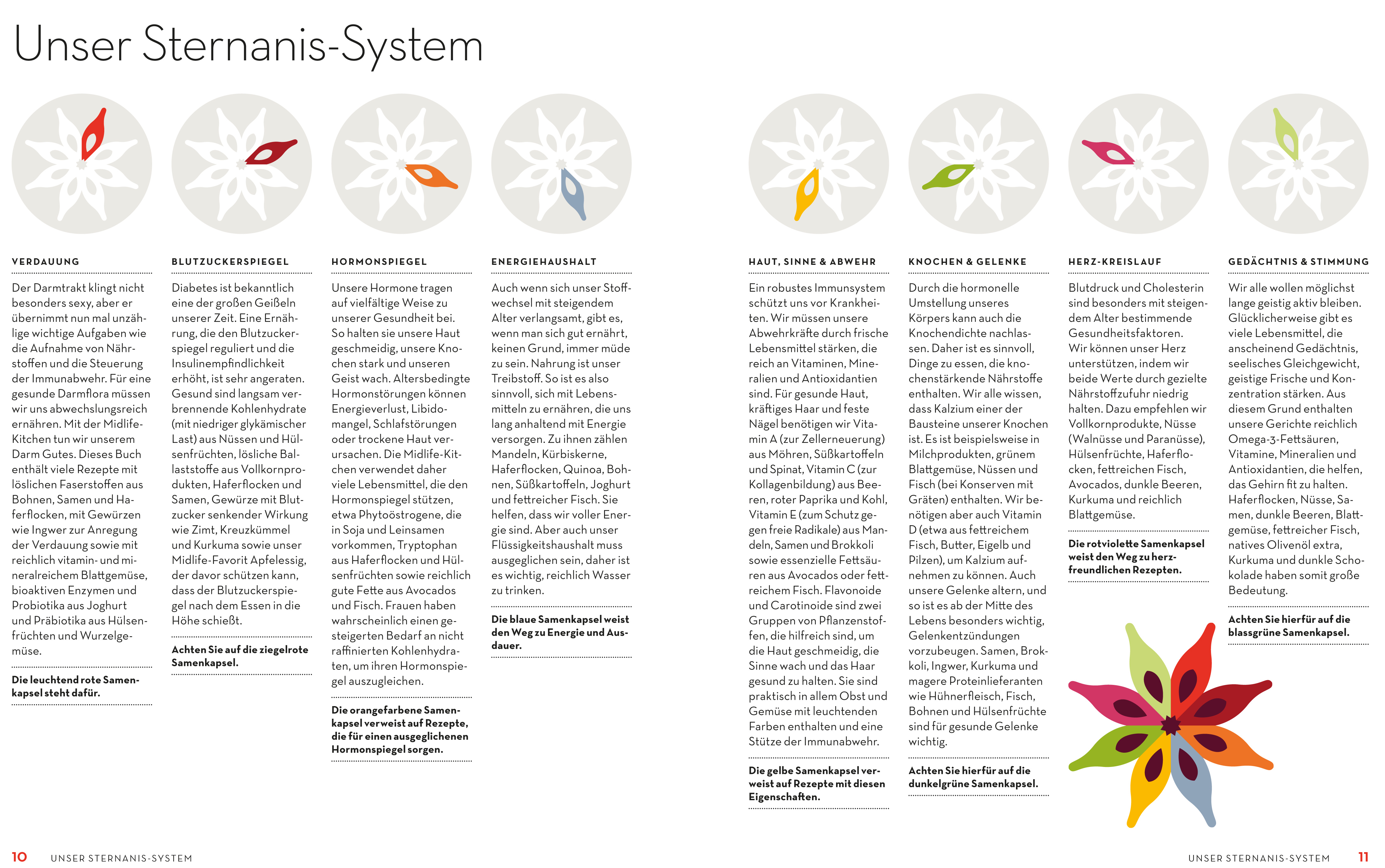 Mit kulinarischen Freuden durch die Wechseljahre – dieses Kochbuch zeigt wie gesunder Genuss funktioniert! „Midlife Kitchen“ verführt mit echten Hingucker-Fotos auf über 300 Seiten und 160 tollen Rezepten, wie Lamm mit Feigen oder Huhn mit Linsen, Petersilie, Salbei und Rosmarin oder Fünf-Minuten-Schoko-Mousse. Die Rezepte sind genau das Richtige für Frauen in der Mitte des Lebens, die sich oft fragen, was sie mit ihrer Ernährung tun können für ihr hormonelles Gleichgewicht, ihre Herzgesundheit, einen stabilen Blutzuckerspiegel, für eine gute Verdauung, für gesunde Knochen und Gelenke — und nicht zuletzt für mehr Energie, Schönheit und Ausstrahlung. Die beiden Freundinnen Mimi Spencer und Sam Rice haben genau darauf lauter köstliche Antworten. Sie zeigen auf die schönste Weise, wie sich Frau genussvoll und glücklich durch die Wechseljahre schlemmen kann. Welches Gericht bei welchen Beschwerden und Problemen hilft, verrät dabei das bunte Sternanis-Symbol auf einen Blick.
