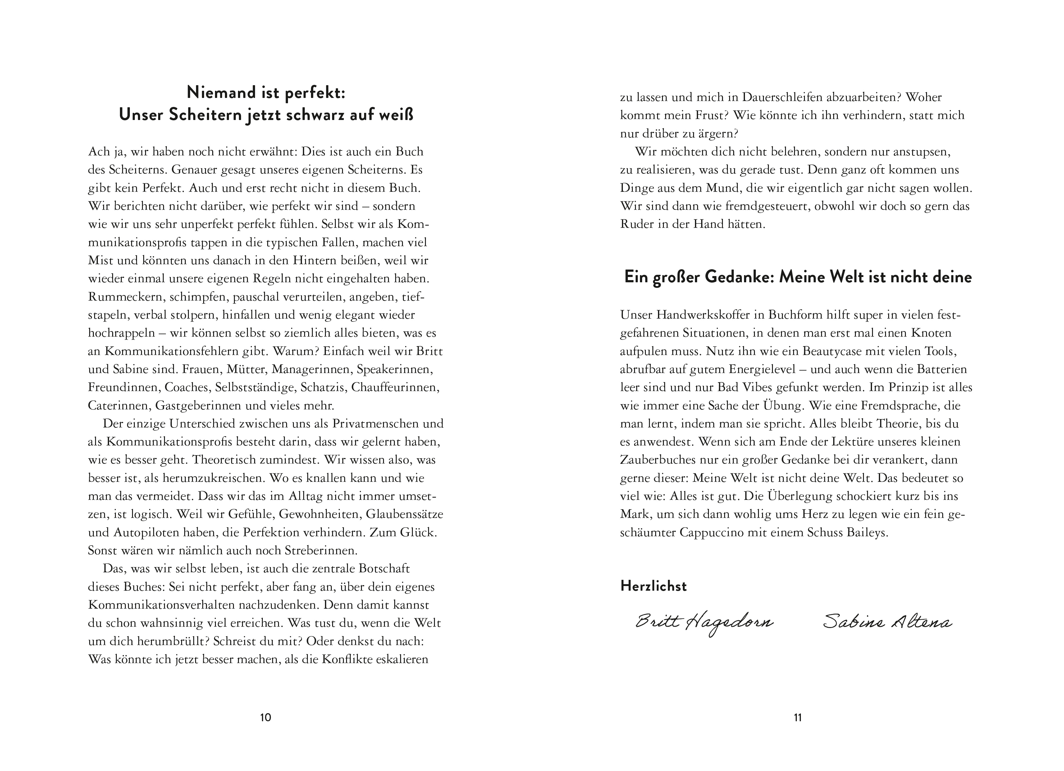 Britt Hagedorn hat über 2000 Talkshows moderiert und ist auch sonst nicht auf den Mund gefallen. Die Sprach- und Kommunikationswissenschaftlerin weiß sich versiert und zielorientiert in verschiedenen Kommunikationssituationen zu bewegen und hat fundiertes Know-How, wie Sprache eigentlich funktioniert. Sabine Altena hat als Journalistin, Coach und Speakerin langjährige Erfahrung im Moderieren, Überzeugen und Vortragen.