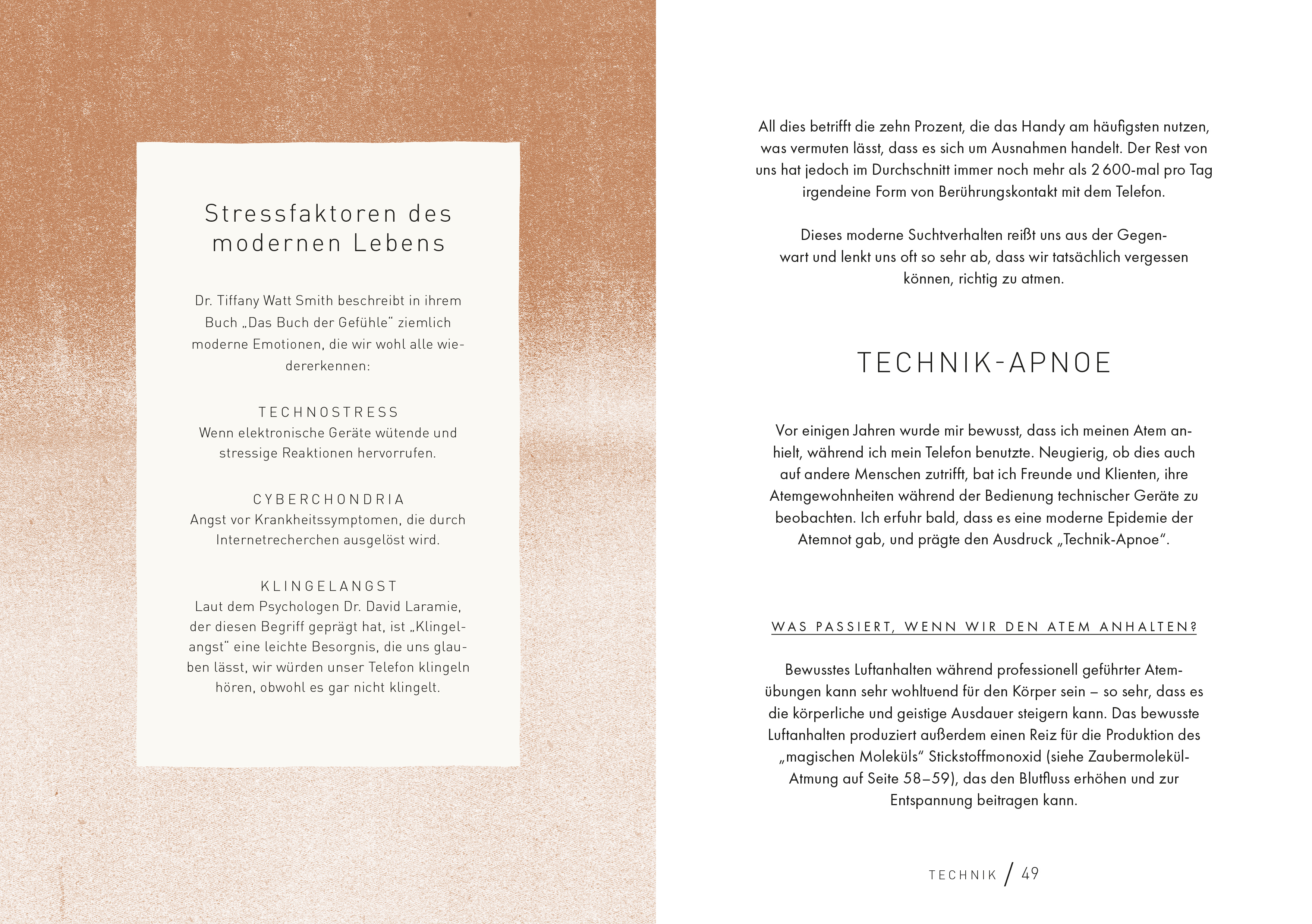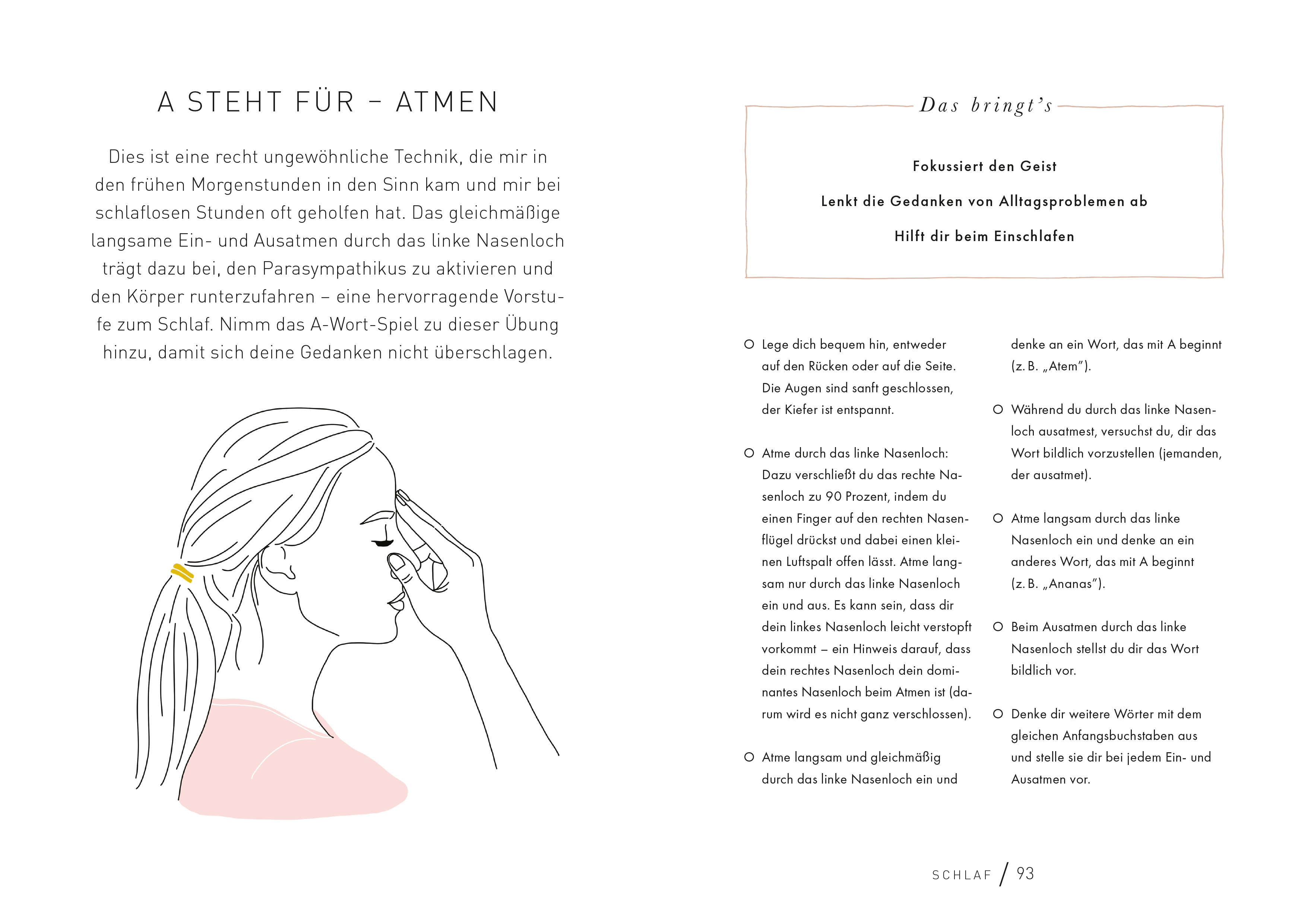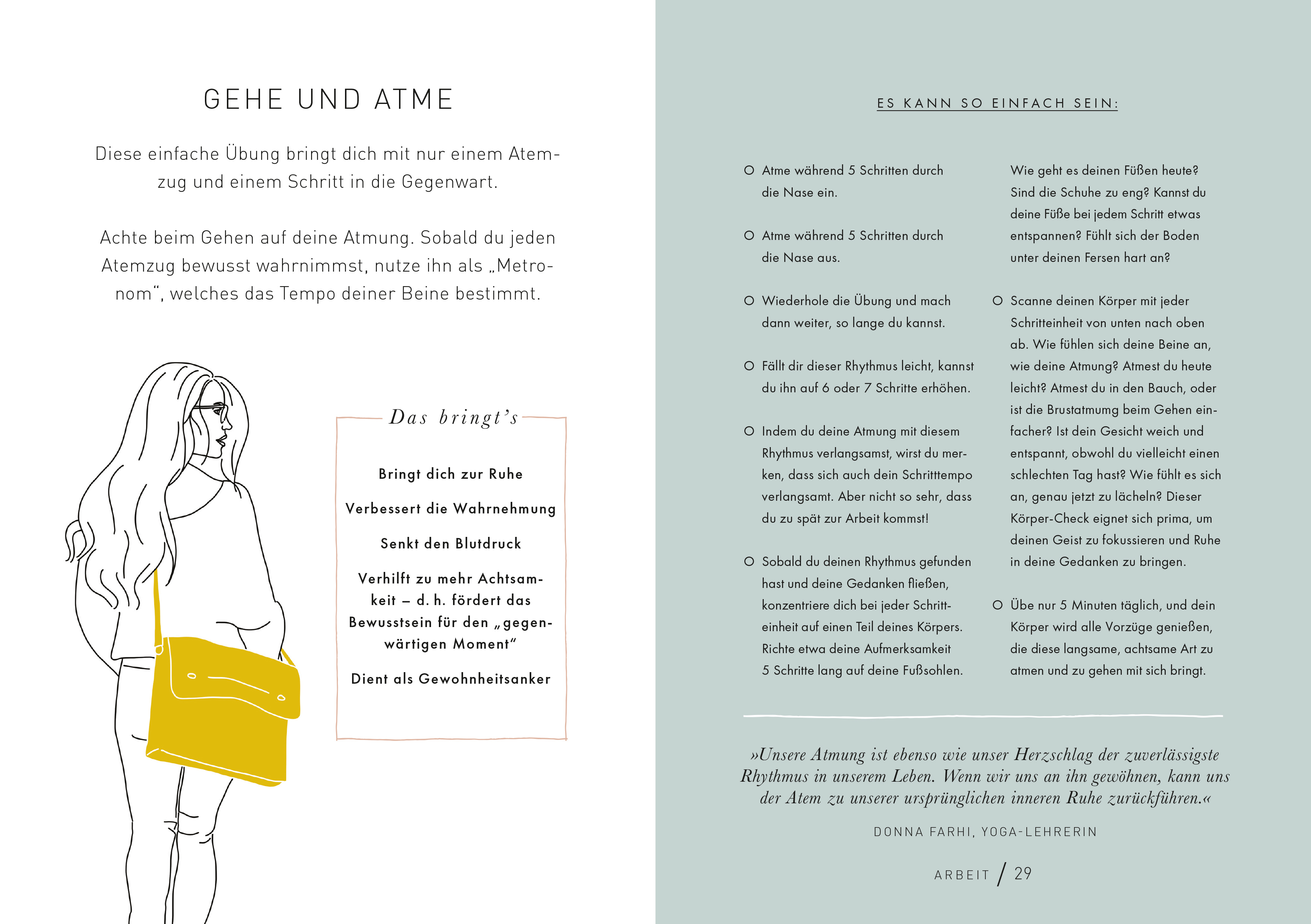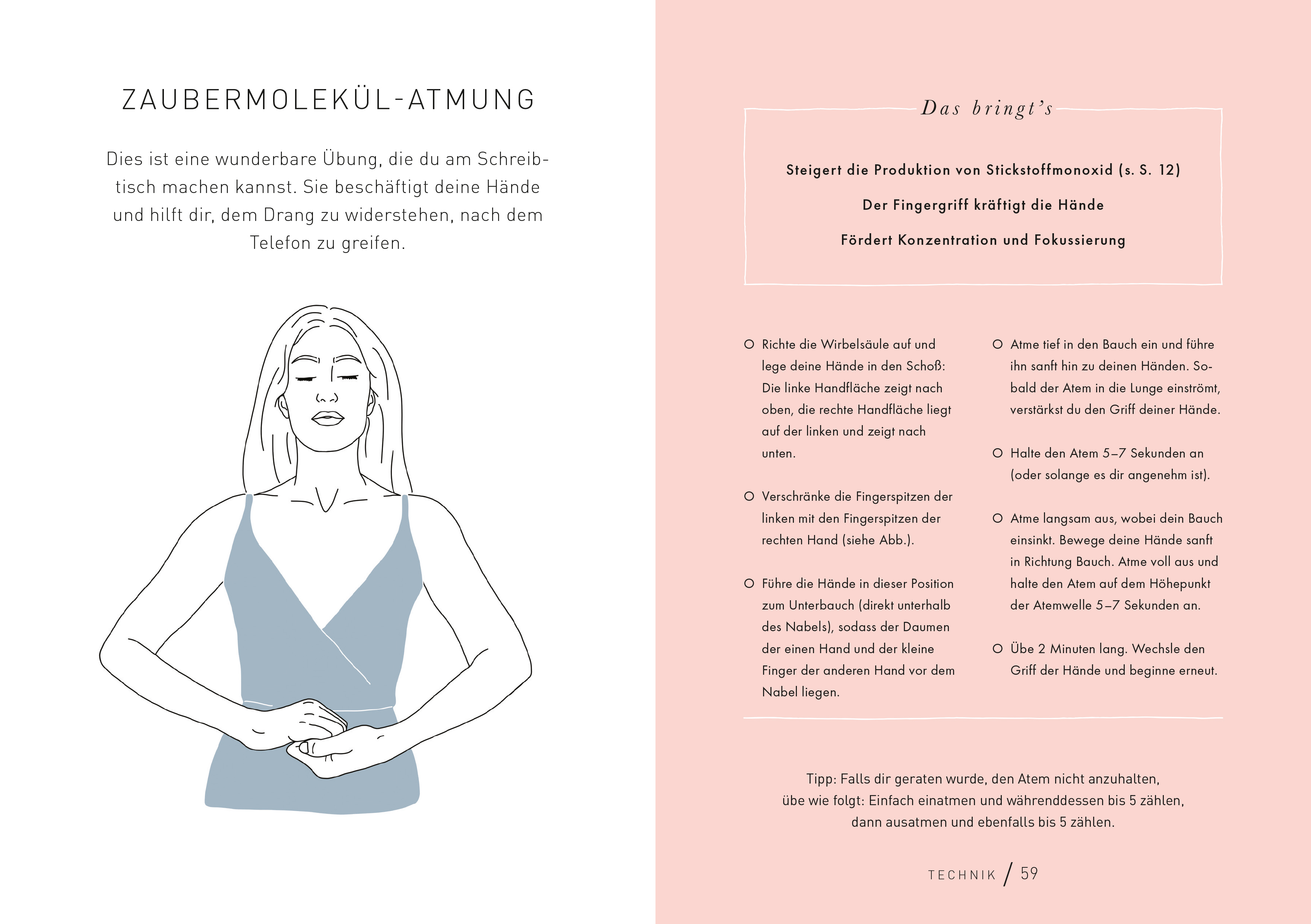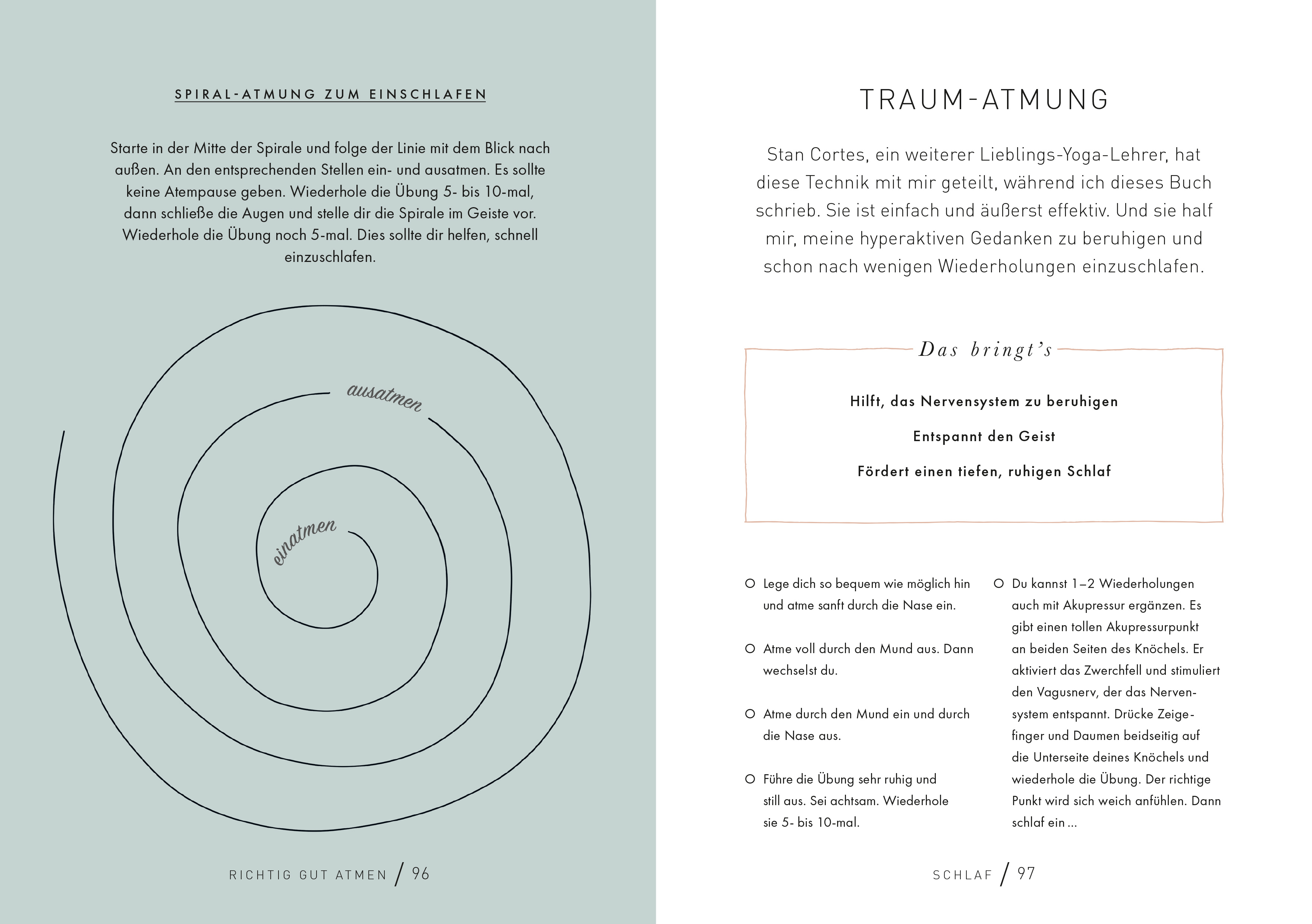 Wir atmen rund 17.000-mal am Tag, doch die meisten von uns atmen nur unbewusst und zu flach. Dabei kann der Atem so vielfältige heilsame Wirkungen im Körper haben. Aimee Hartley, Trainerin für Transformational Breath®, stellt 70 einfache Schritt-für-Schritt-Atemübungen vor, die man jederzeit und überall machen kann. Sie hellen schnell und effektiv die Stimmung auf oder pushen die Energie. Andere Übungen helfen zu entspannen und sorgen für einen guten Schlaf. Nach einem kurzen Theorieteil wird es ganz praktisch. Die Übungen lassen sich leicht in den Alltag integrieren. Zwei Minuten morgens im Bad bereiten auf einen guten Tag vor. Fürs Büro gibt es Übungen, um sich zu fokussieren oder die Nerven vor einem wichtigen Meeting zu beruhigen. Richtiges Atmen hilft auch, nach einem Konflikt wieder runterzukommen und den Geist zu reinigen. Zudem unterstützt es beim Sport und bei der Verdauung. Im wahrsten Sinne des Wortes ein Buch zum Durchatmen.