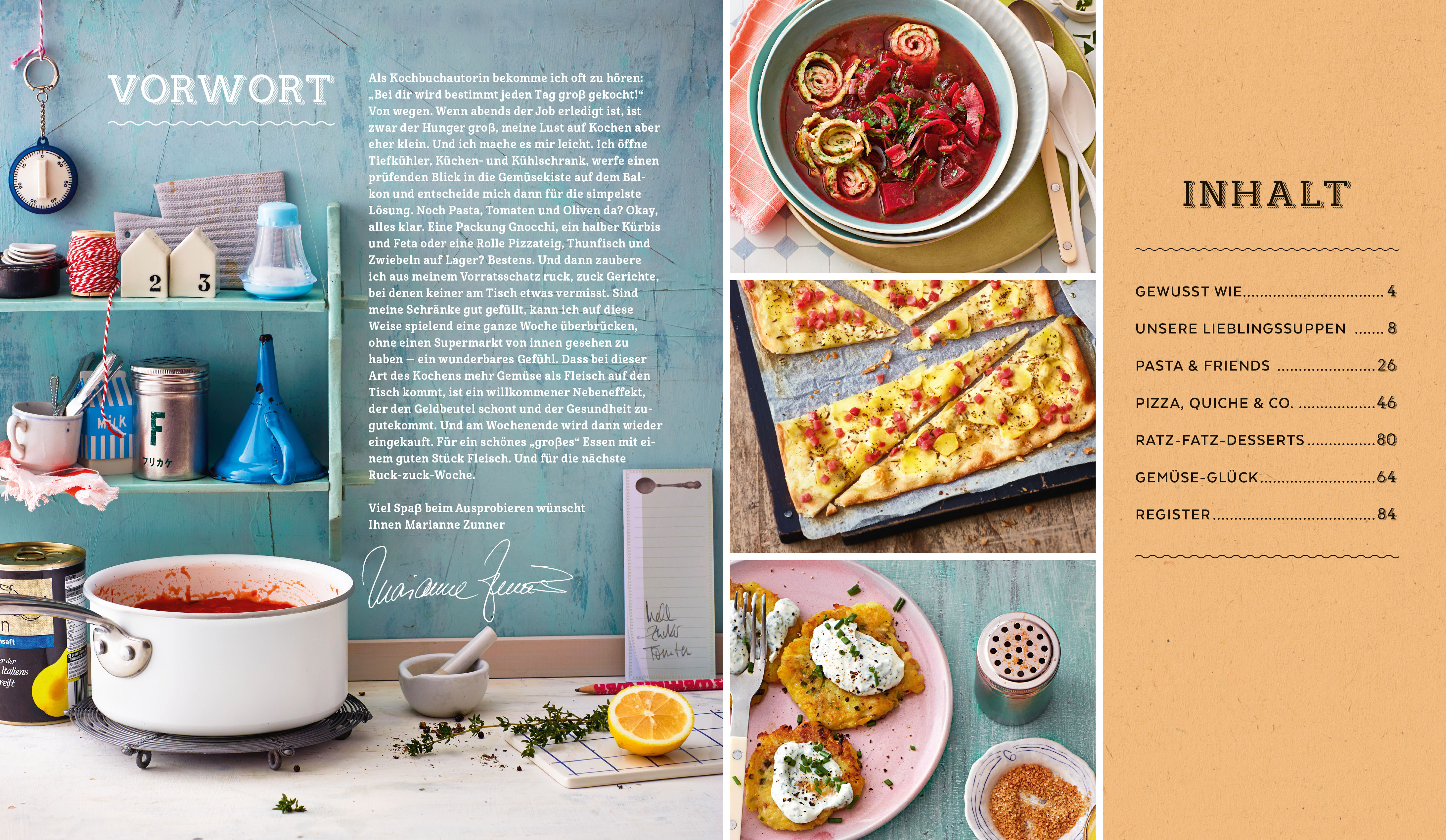 Wir lieben ja Spaghetti mit Tomatensoße. Aber dreimal pro Woche? Wer hat noch andere Ideen? Für Rezepte, die schnell gehen und der ganzen Familien schmecken? Marianne Zunner! Sie bietet viele Rezepte für stressfreies Kochen mit Zutaten aus dem Vorrat. So bleibt mehr Zeit für die Familie. Ihr simples Geheimnis: Ein gut gefüllter Vorratsschrank. Genauer: Man kaufe einmal pro Woche ein, lege Vorräte von Dosen und Gläsern an, spanne die Tiefkühltruhe mit ein und zaubere bei Bedarf alles wieder hervor. Kein frisches Gemüse, Kräuter, Fisch und Fleisch? Doch natürlich, denn richtig gelagert hält sich auch das einige Tage. Einfach Yummy – einfach lecker – einfach ruck-zuck.