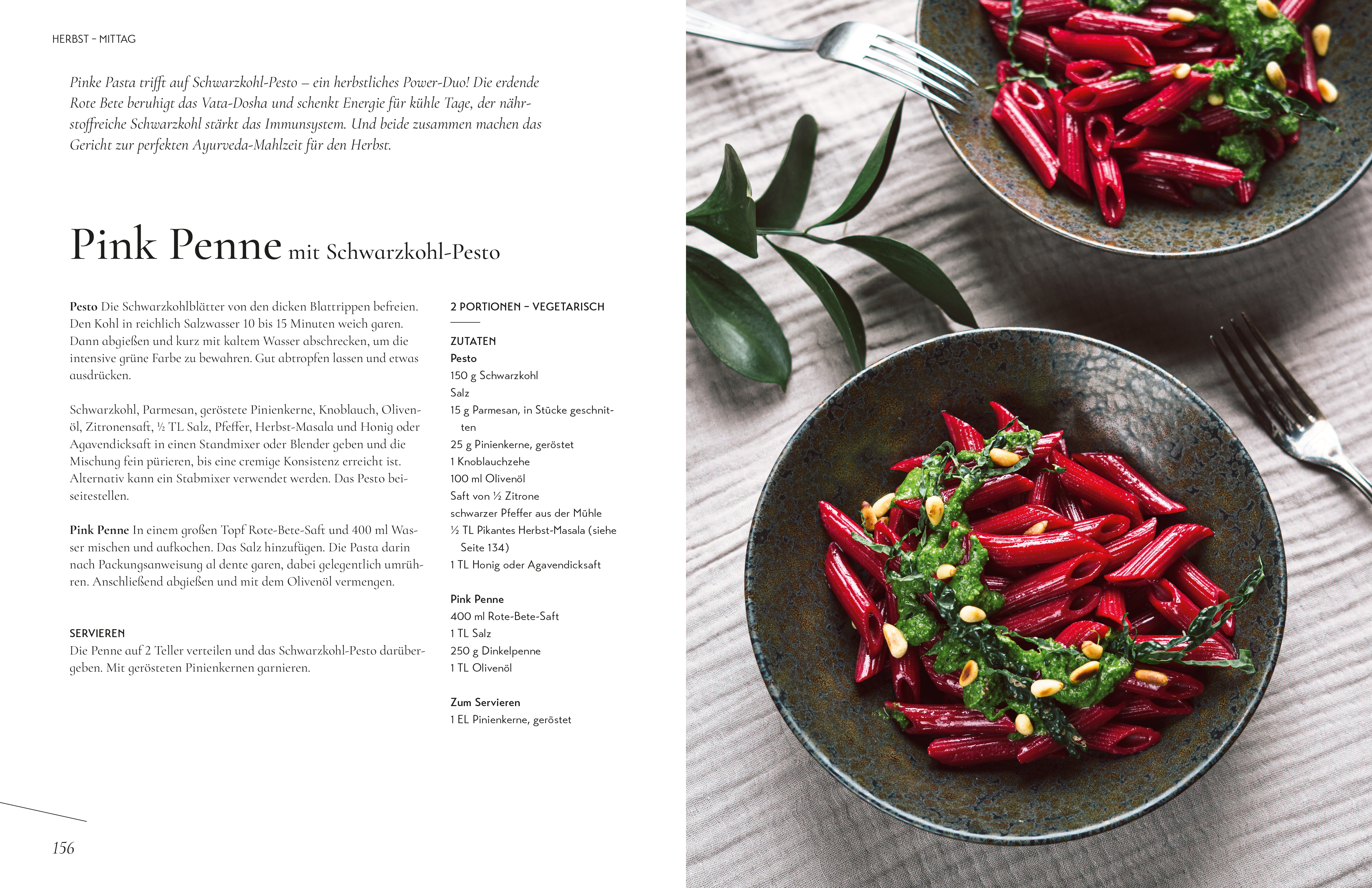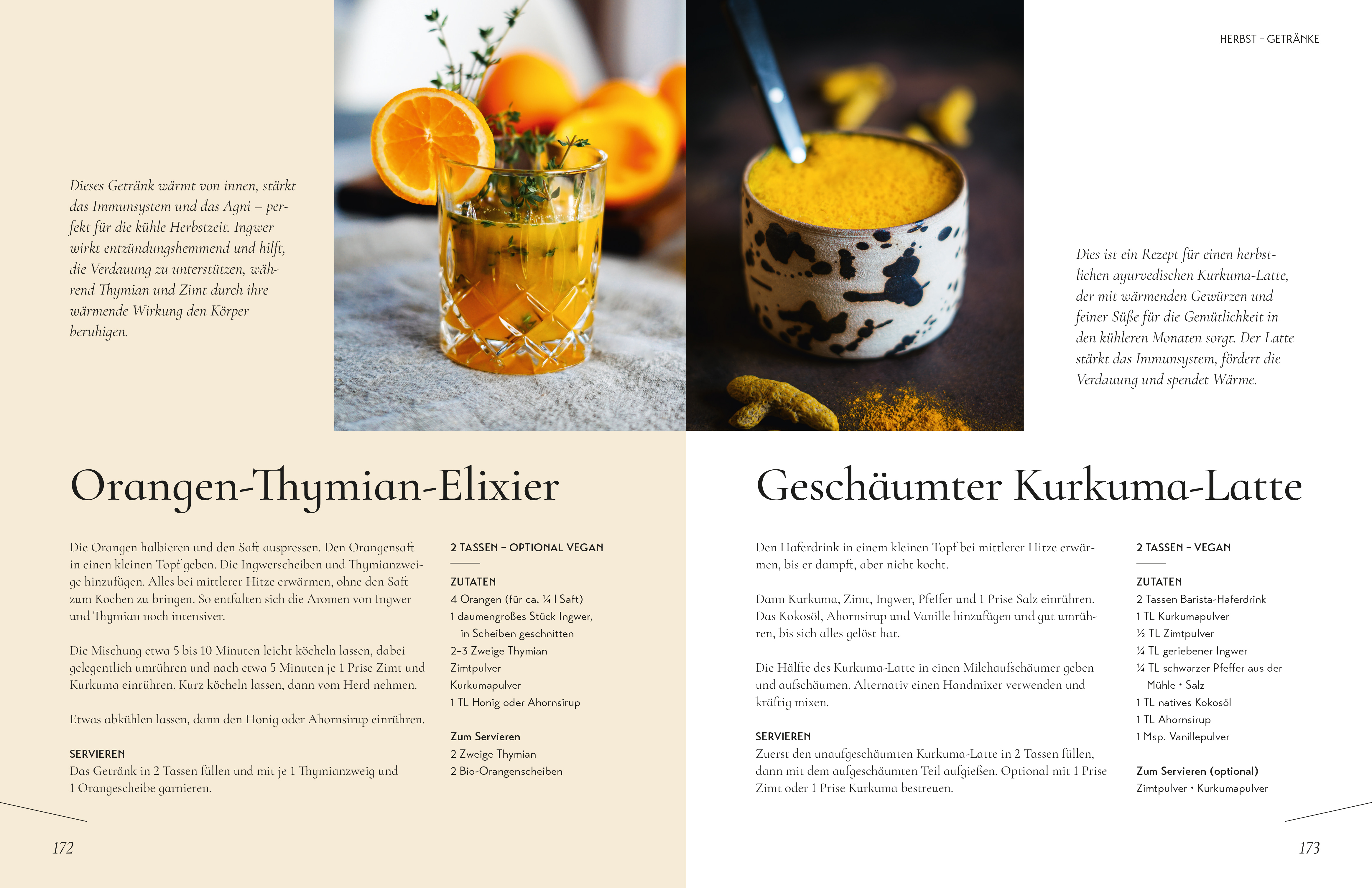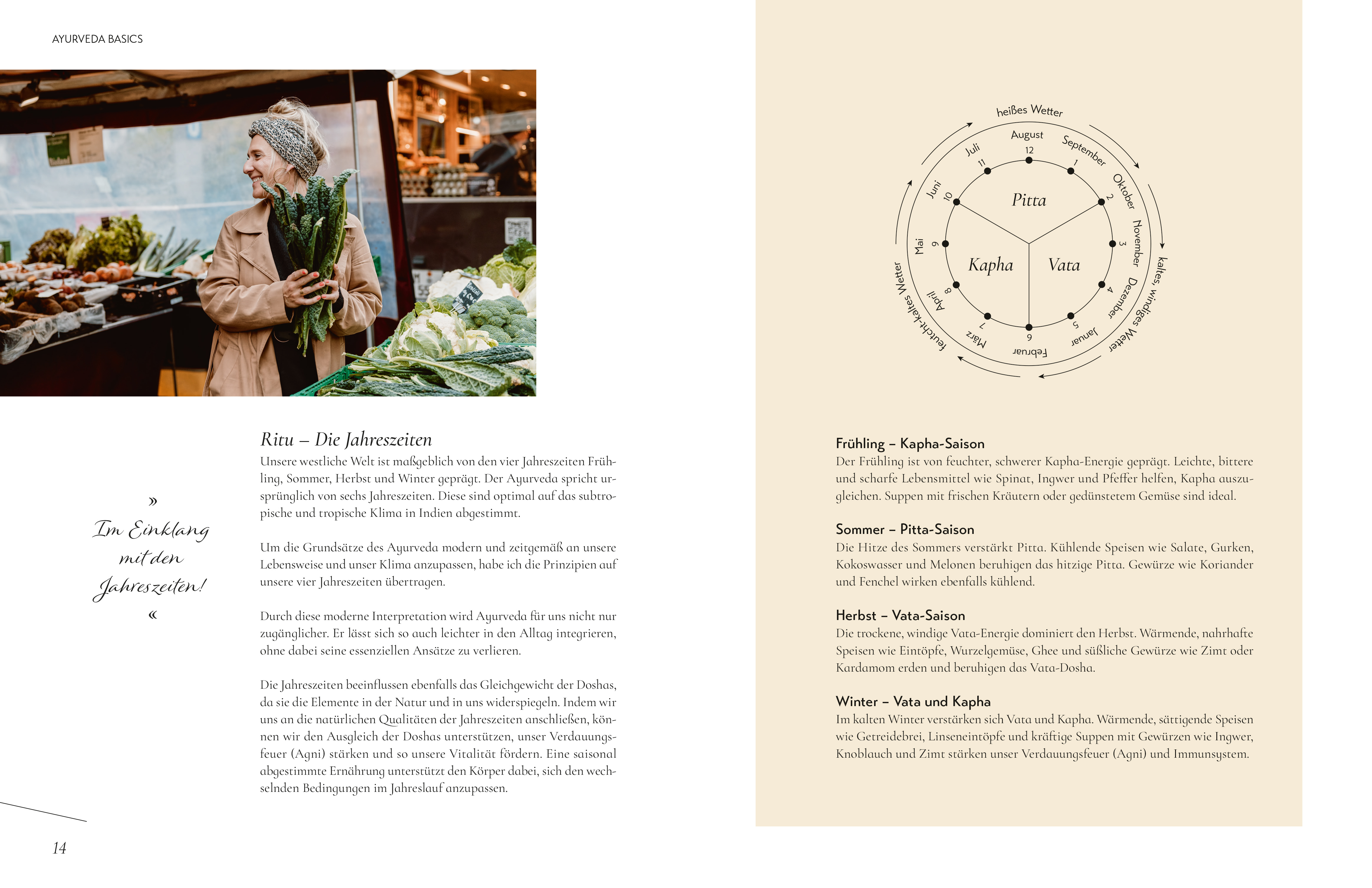 Durch die Anwendung einfacher ayurvedischer Prinzipien sind keine Vorkenntnisse und komplizierten Regeln notwendig. Im Kapitel „The essence of ayurveda“ werden die Grundprinzipien, auf die es bei der ayurvedischen Ernährung wirklich ankommt, einfach und verständlich erklärt und du erfährst, wie du sie in deinen modernen Alltag und zeitgemäße Ernährungsbedürfnisse integrierst. Der Rest ist Genuss pur – in Form von vielfältigen Gerichten, die dich schon beim Kochen entspannen.