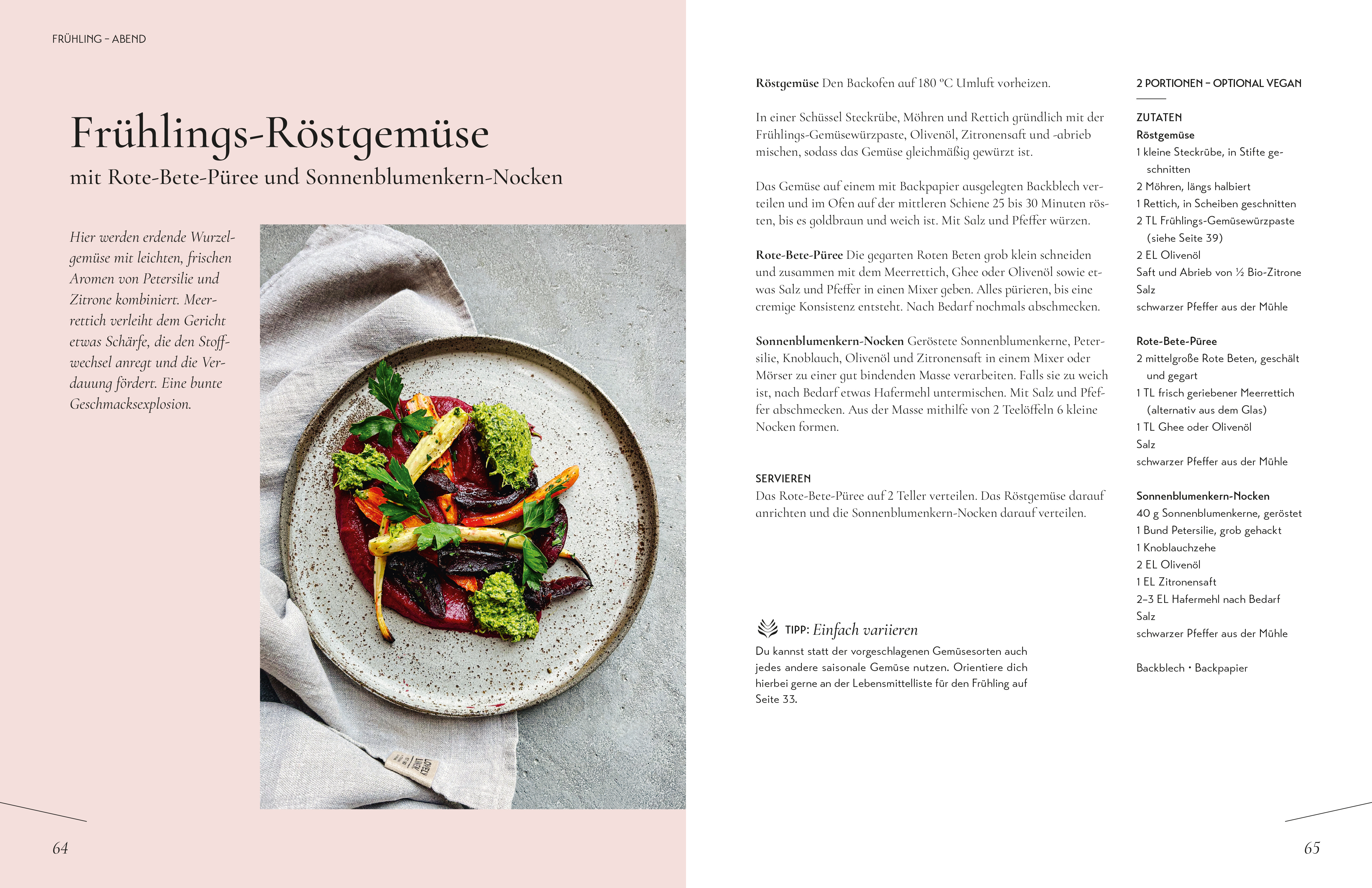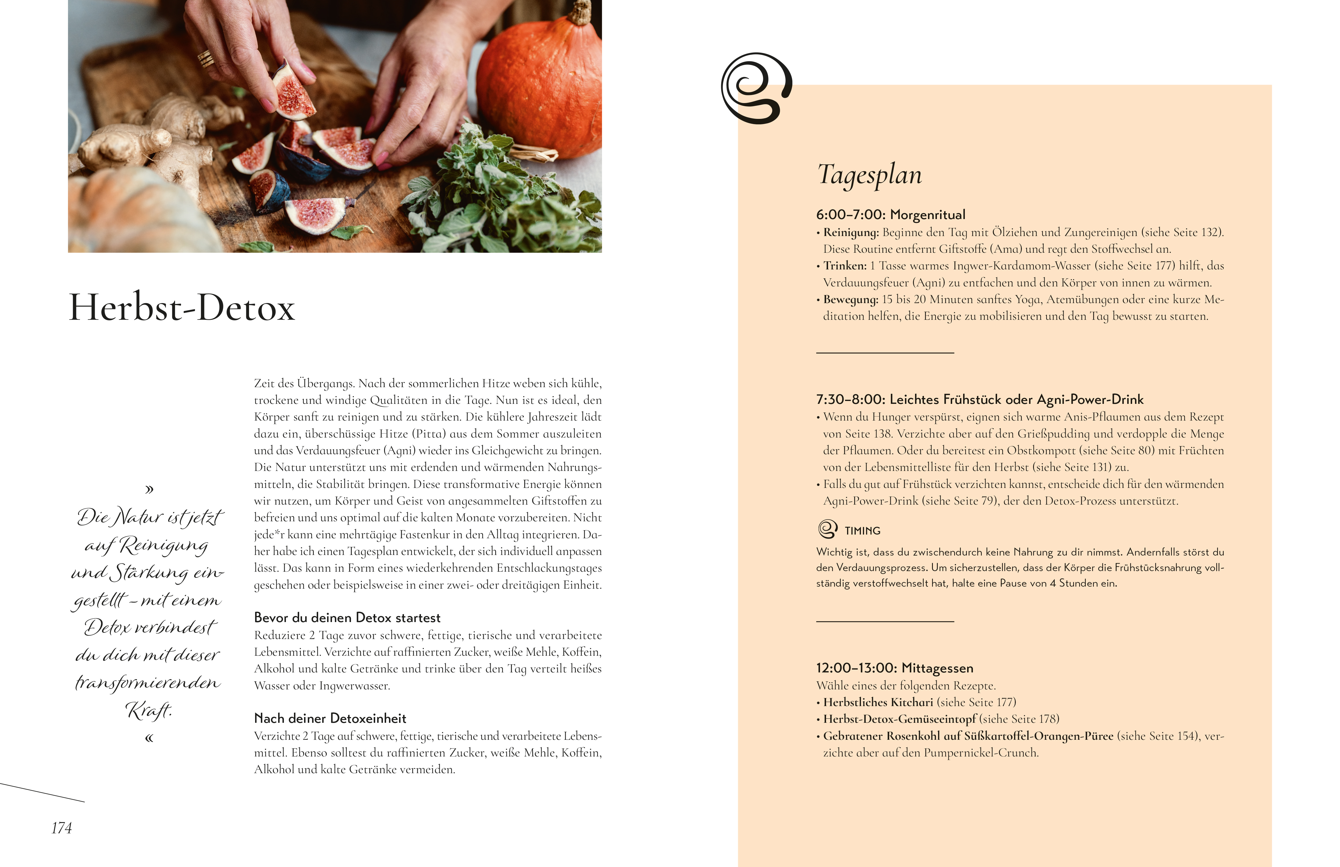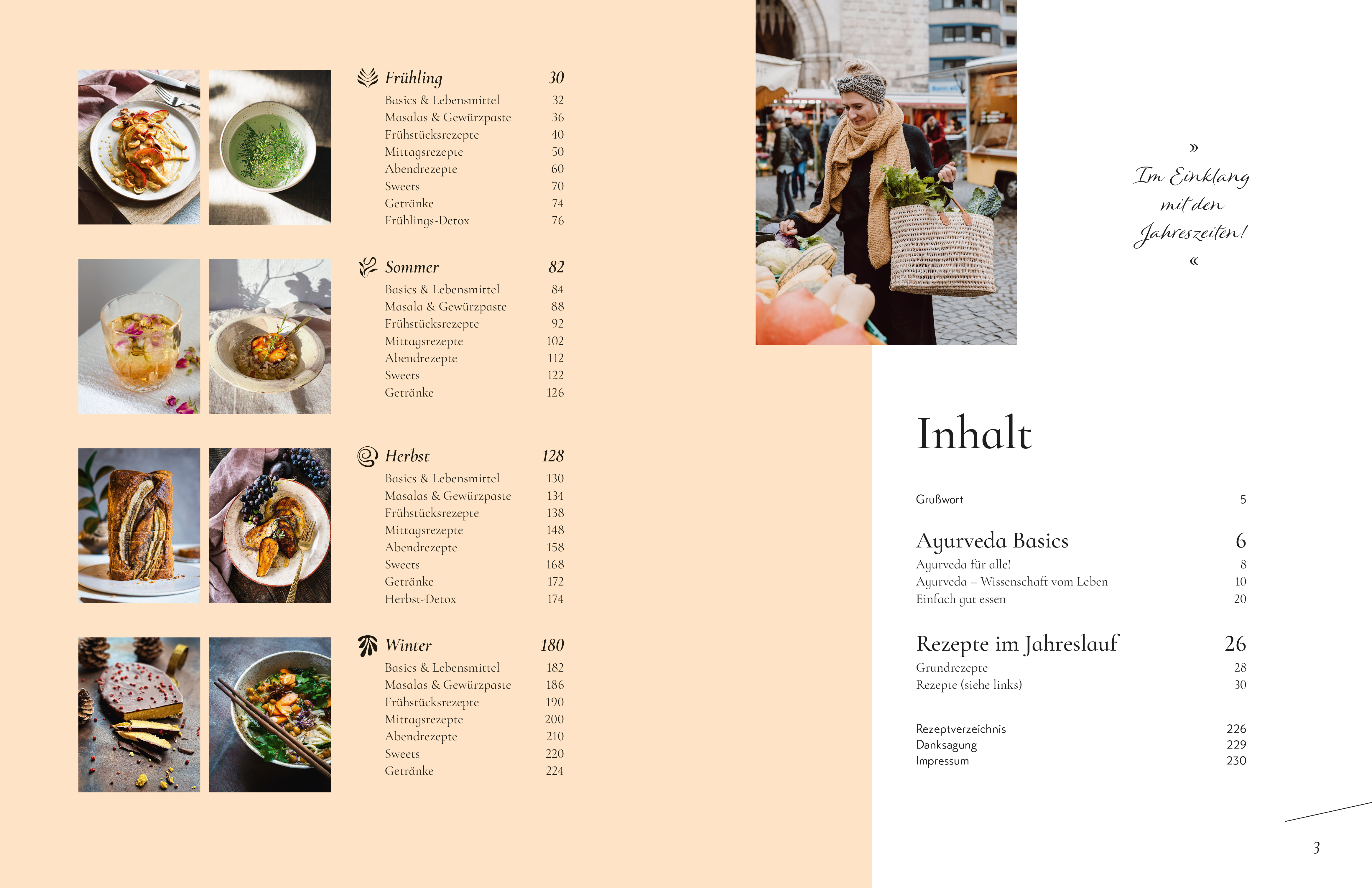 Durch die Anwendung einfacher ayurvedischer Prinzipien sind keine Vorkenntnisse und komplizierten Regeln notwendig. Im Kapitel „The essence of ayurveda“ werden die Grundprinzipien, auf die es bei der ayurvedischen Ernährung wirklich ankommt, einfach und verständlich erklärt und du erfährst, wie du sie in deinen modernen Alltag und zeitgemäße Ernährungsbedürfnisse integrierst. Der Rest ist Genuss pur – in Form von vielfältigen Gerichten, die dich schon beim Kochen entspannen.