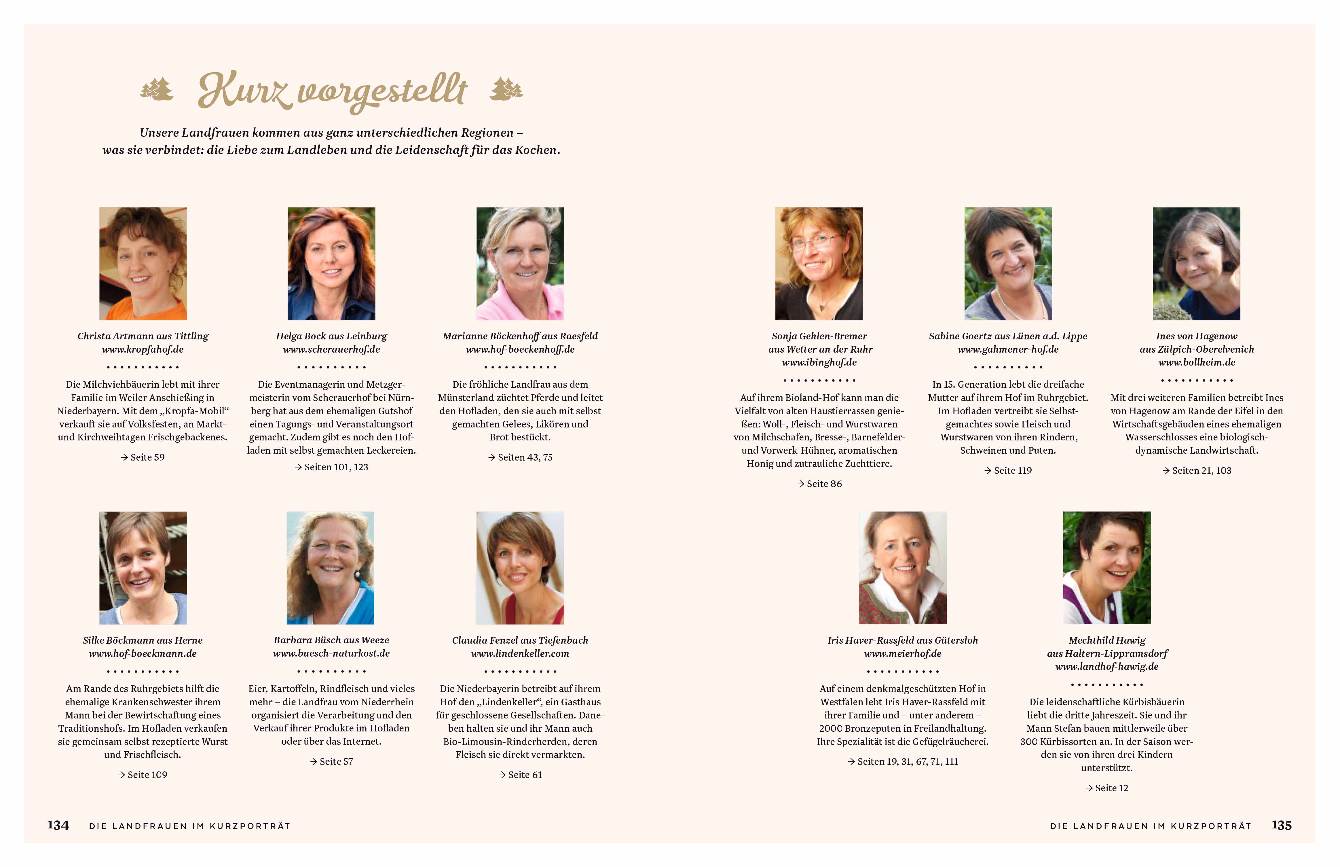 Sie gehören zur deutschen Fernsehlandschaft wie „Tatort“ und die „Tagesschau“: die Landfrauen. Dutzende der sympathischen wie auch toughen Unternehmerinnen hat man bereits kennen- und lieben gelernt: Im WDR im TV-Format „Land & lecker“ und im BR in der „Landfrauenküche“. Sie sind Käserinnen, Öko-Bäuerinnen, Schnapsbrennerinnen, Herrin über Ziegen oder machen andere ganz besondere Dinge. Jetzt gibt es ein wundervolles neues Buch von ihnen: Weihnachtsrezepte quer durch Deutschland von Landfrauen aus Nordrhein-Westfalen bis Bayern. Denn die Landfrauen wissen einfach, wie man die Wochen bis zum Fest rundum perfekt zelebriert. Und offen wie sie sind, verraten sie auch ihre Lieblingsrezepte und lang gehüteten Geheimnisse. So manches Familienrezept haben sie im Laufe der Jahre perfektioniert. Winterlich Leckeres mit Rüben, Kohl, Maronen, Feigen oder Walnüssen. Vorspeisen, Hauptspeisen, Desserts. Klassiker wie Gans und Ente. Die Zutaten: selbst angebaut, gezüchtet und geerntet. Endlich gibt es jetzt die gesammelten Vorweihnachtsideen samt Deko und Basteleien in einem Buch!