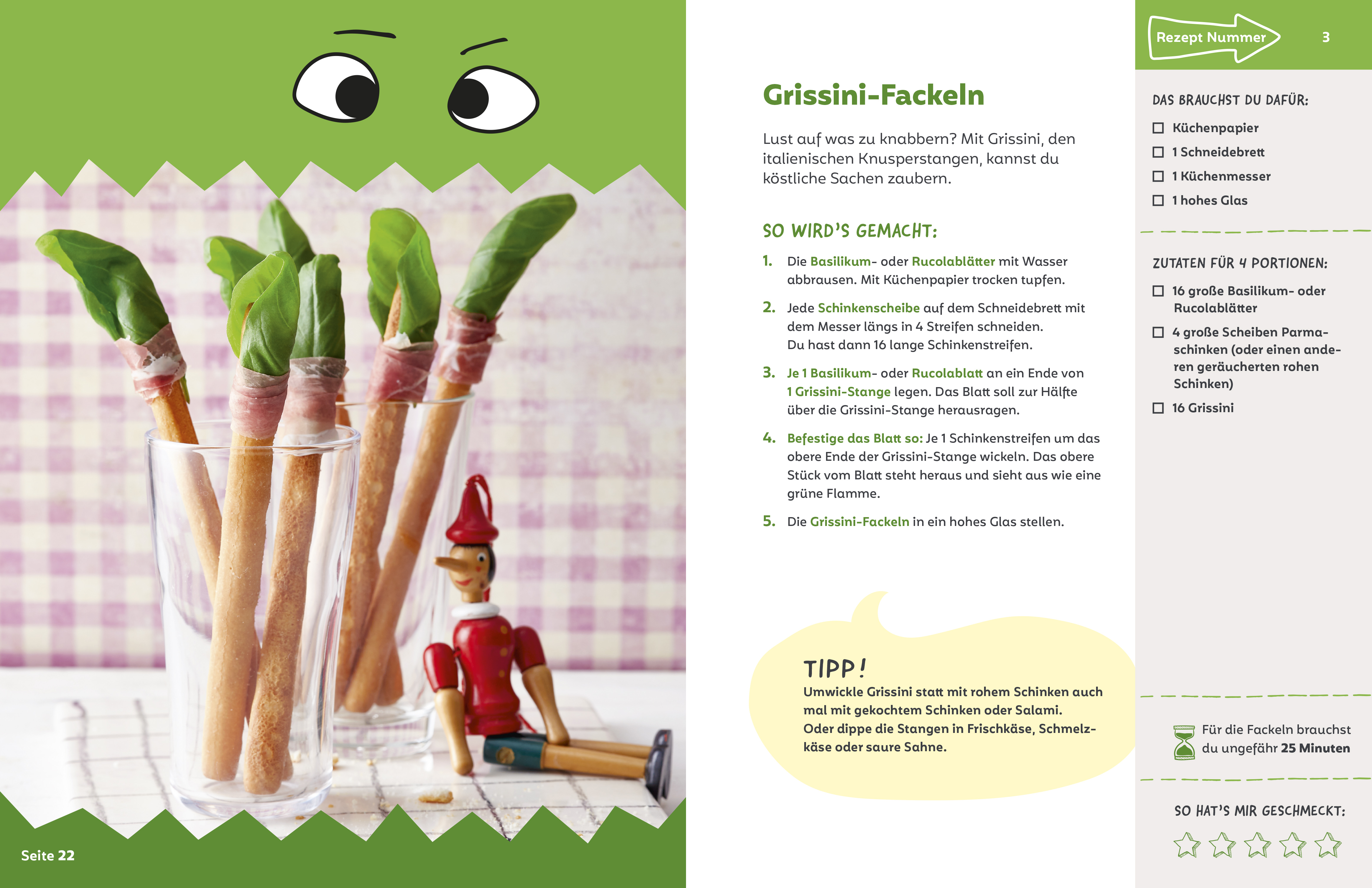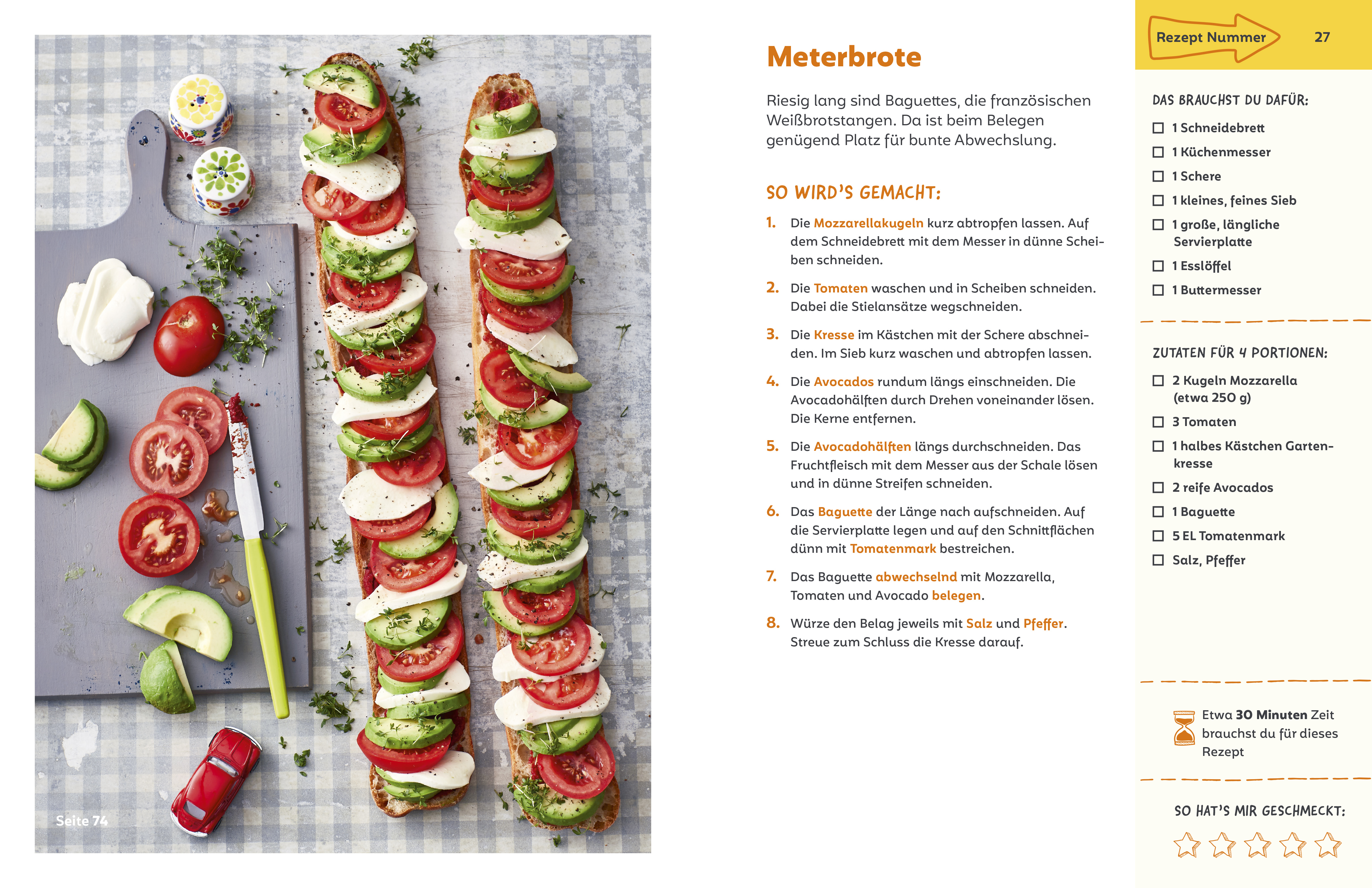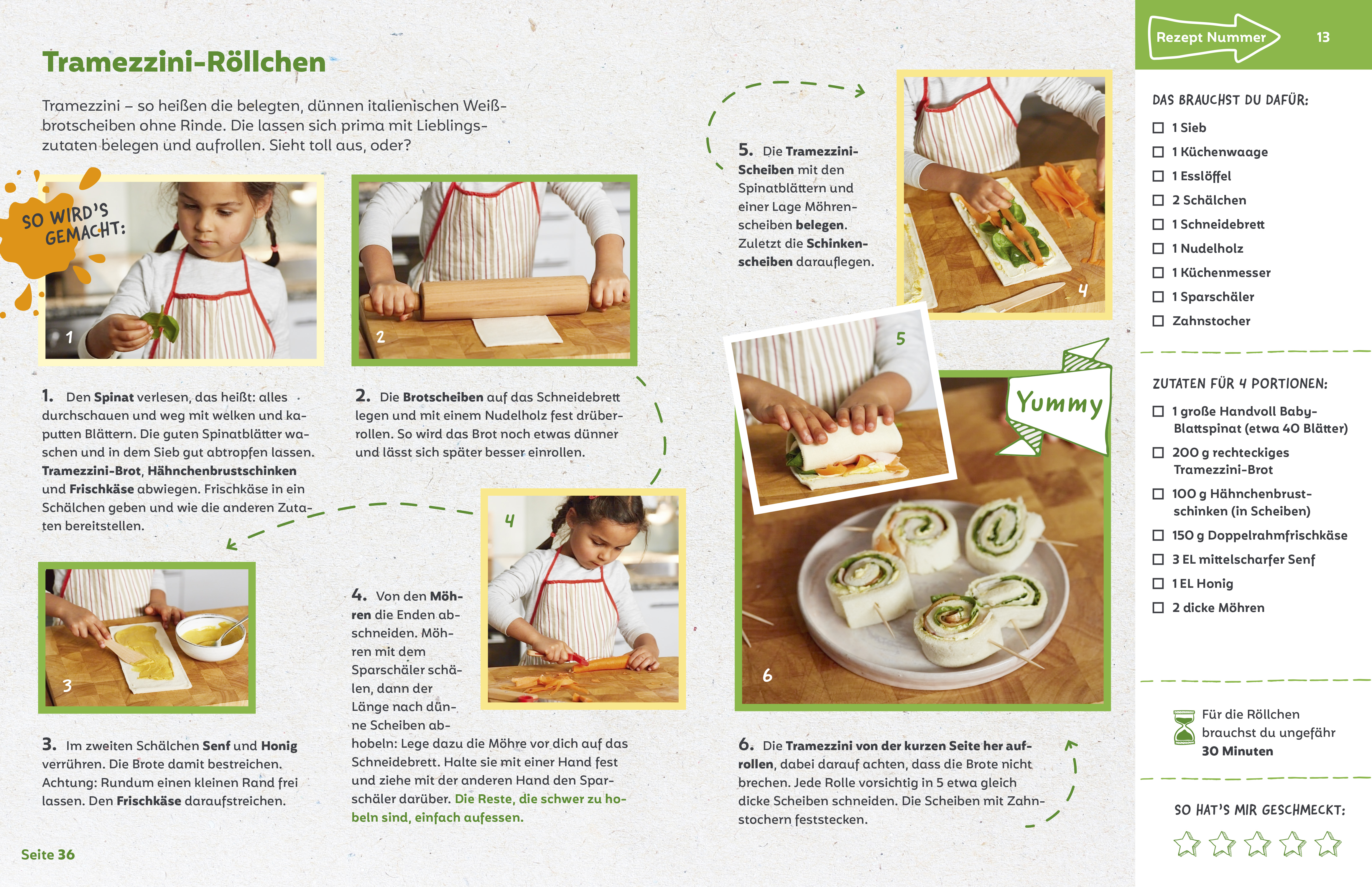Selber machen ist schwer angesagt – vor allem bei Kids im Grundschulalter. Da wird am liebsten nichts mehr aus der Hand gegeben und alles, was man selbst in der Küche „zaubern“ kann, ist einfach superspannend. Mit diesem neuen Kochbuch können Kinder ganz allein und spielend leicht erste Küchenerfahrungen machen – der Grundstein für Spaß am Essen und Interesse an gesunder und abwechslungsreicher Ernährung. Weil selbst gemacht, schmeckt’s einfach besser! Von lecker belegten Sandwiches und über Nudelsalat und Burger, Früchtespieße und Kekstörtchen bis hin zu erfrischenden Durstlöschern. Mit kurzen Rezepten aus wenigen Zutaten und vielen Step-by-Step-Rezepten können Kinder zwischen 6 bis 10 Jahren selbst in der Küche loslegen! Garantiert ohne Finger verbrennen, Ofen-Unfall-Gefahr und „Mama, ich brauch deine Hilfe!“. Dazu gibt es Tipps zum richtigen Umgang mit Messer, Gabel, Mixer und Co., die wichtigsten Küchentechniken und was beim Einkaufen eigentlich auf der Packung steht. Spannend wird’s für die Küchenhelden bei den Ess-Experimenten und kreativ bei der selbst gebastelten Deko, wenn große und kleine Gäste zum Essen kommen. Kinder: In die Küche, fertig – los!