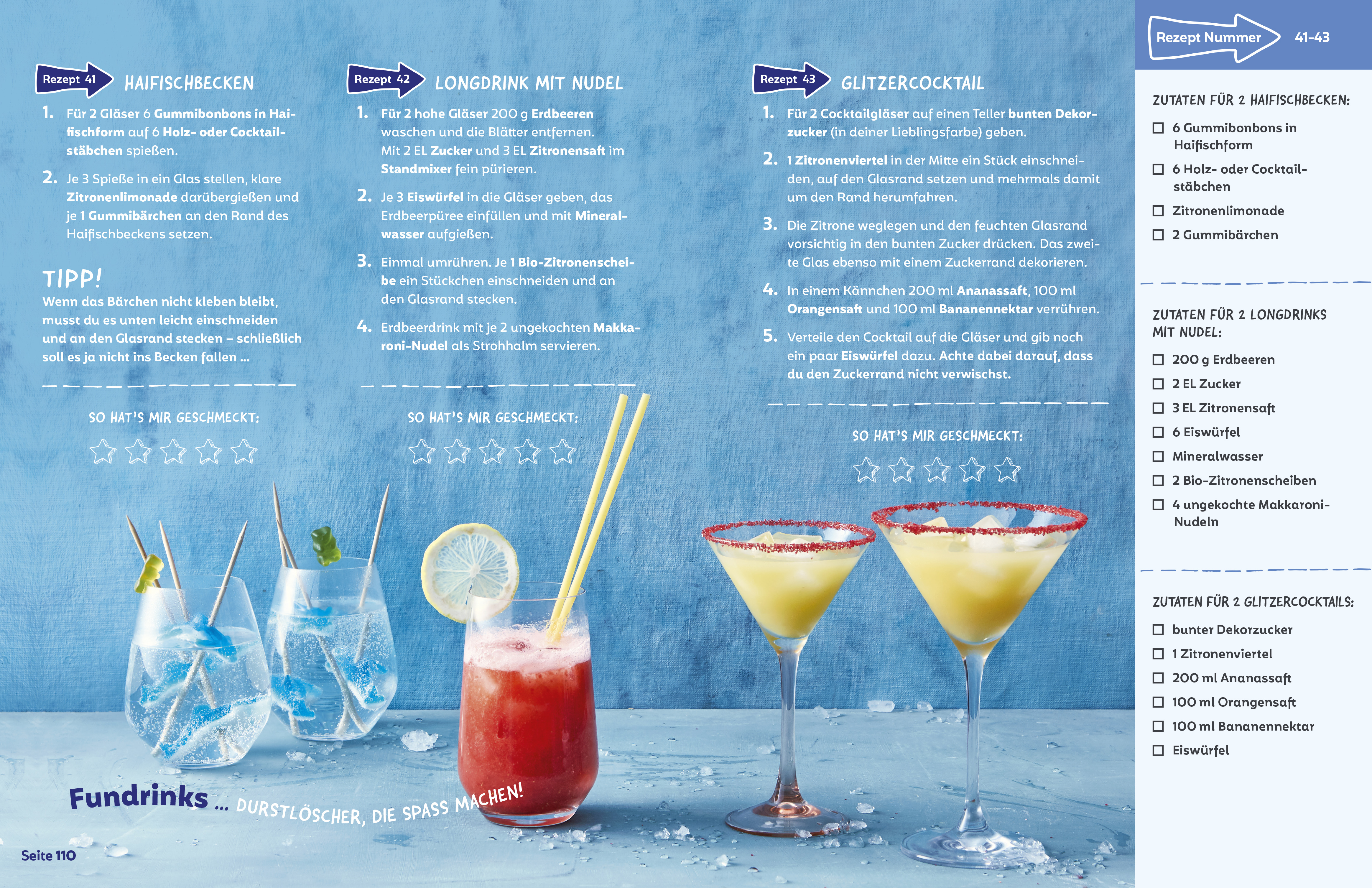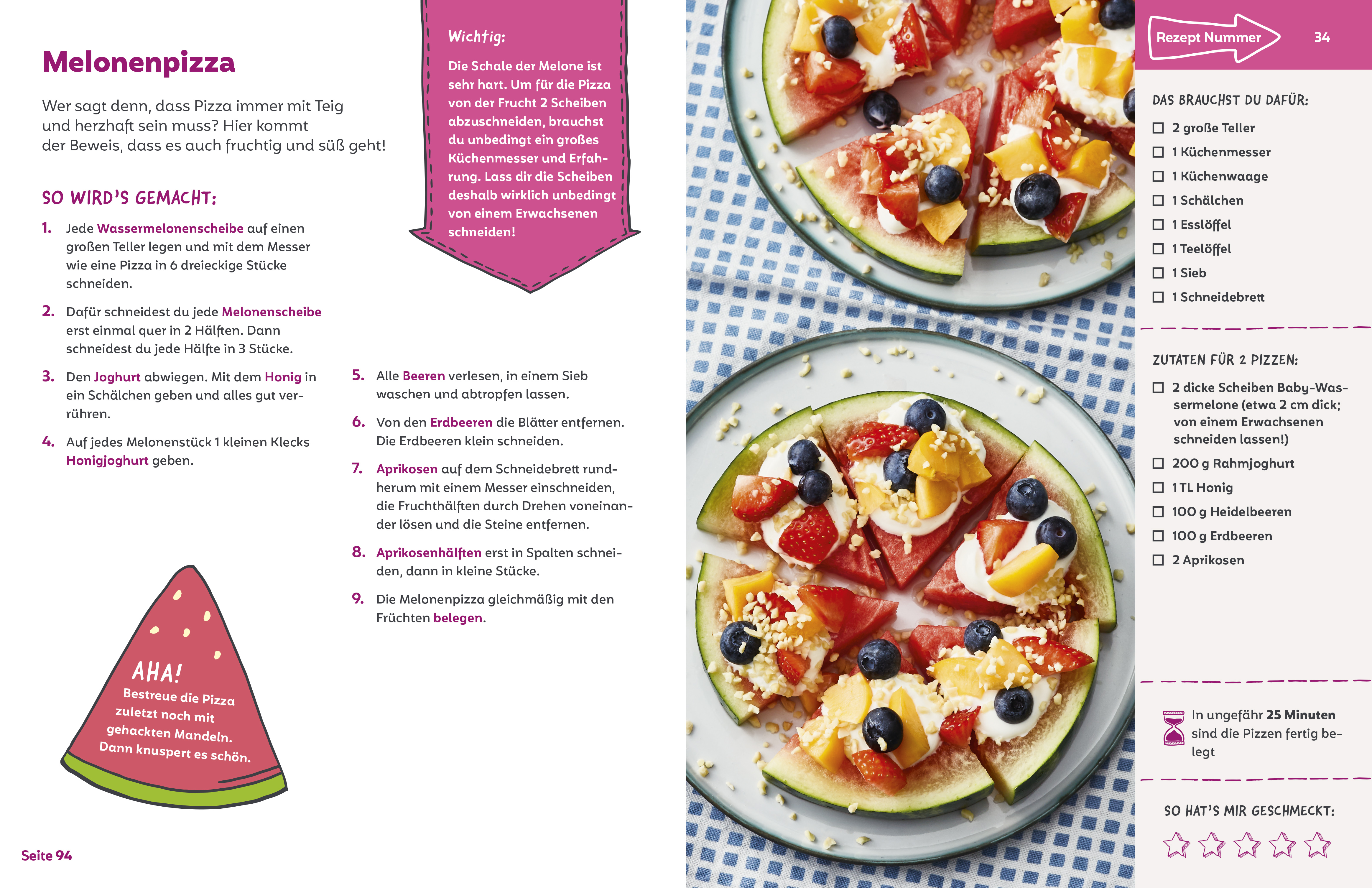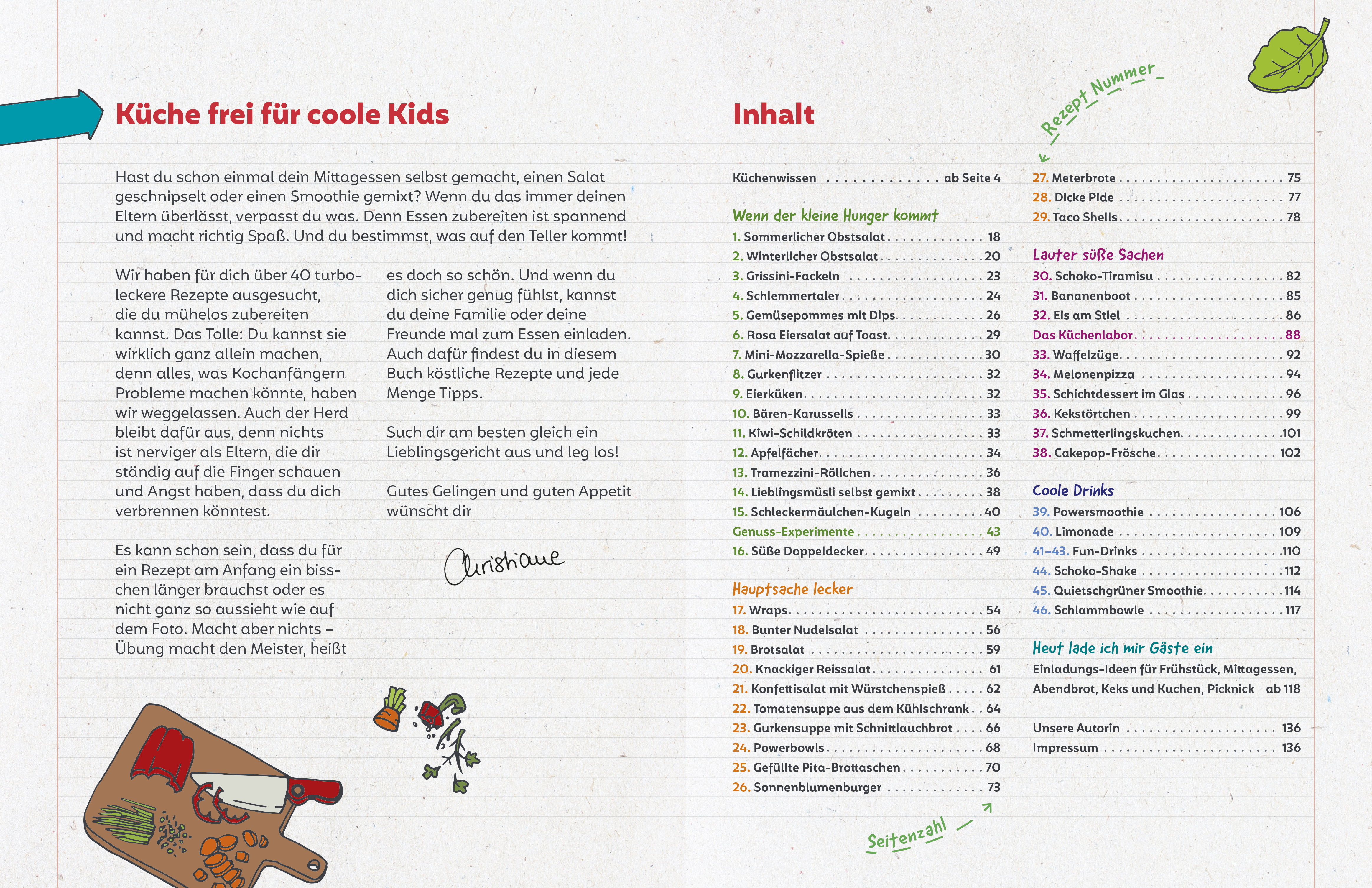 Selber machen ist schwer angesagt – vor allem bei Kids im Grundschulalter. Da wird am liebsten nichts mehr aus der Hand gegeben und alles, was man selbst in der Küche „zaubern“ kann, ist einfach superspannend. Mit diesem neuen Kochbuch können Kinder ganz allein und spielend leicht erste Küchenerfahrungen machen – der Grundstein für Spaß am Essen und Interesse an gesunder und abwechslungsreicher Ernährung. Weil selbst gemacht, schmeckt’s einfach besser! Von lecker belegten Sandwiches und über Nudelsalat und Burger, Früchtespieße und Kekstörtchen bis hin zu erfrischenden Durstlöschern. Mit kurzen Rezepten aus wenigen Zutaten und vielen Step-by-Step-Rezepten können Kinder zwischen 6 bis 10 Jahren selbst in der Küche loslegen! Garantiert ohne Finger verbrennen, Ofen-Unfall-Gefahr und „Mama, ich brauch deine Hilfe!“. Dazu gibt es Tipps zum richtigen Umgang mit Messer, Gabel, Mixer und Co., die wichtigsten Küchentechniken und was beim Einkaufen eigentlich auf der Packung steht. Spannend wird’s für die Küchenhelden bei den Ess-Experimenten und kreativ bei der selbst gebastelten Deko, wenn große und kleine Gäste zum Essen kommen. Kinder: In die Küche, fertig – los!